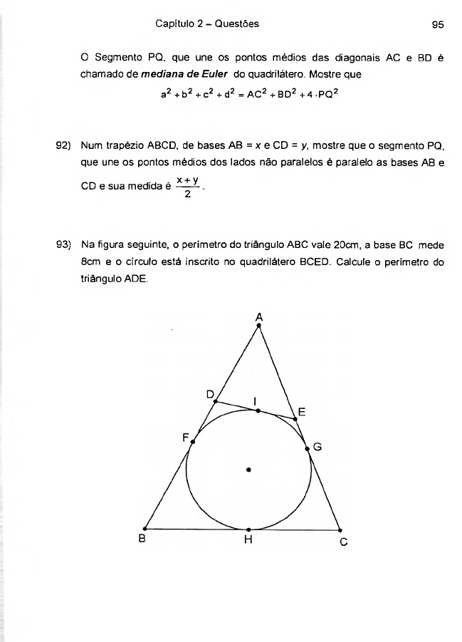 Capítulo 2 - Questões 95 92) Num trapézio ABCD, de bases AB = x e CD = y, mostre que o segmento PQ, que une os pontos médios dos lados não paralelos é paralelo as bases AB e 93) Na figura seguinte, o perímetro do triângulo ABC vale 20cm, a base BC mede 8cm e o círculo está inscrito no quadrilátero BCED. Calcule o perímetro do triângulo ADE. O Segmento PQ, que une os pontos médios das diagonais AC e BD é chamado de mediana de Euler do quadrilátero. Mostre que a2 + b2 + c2 +d2 = AC2 + BD2 +4 PQ2 _ . x + yCD e sua medida e------ . 2