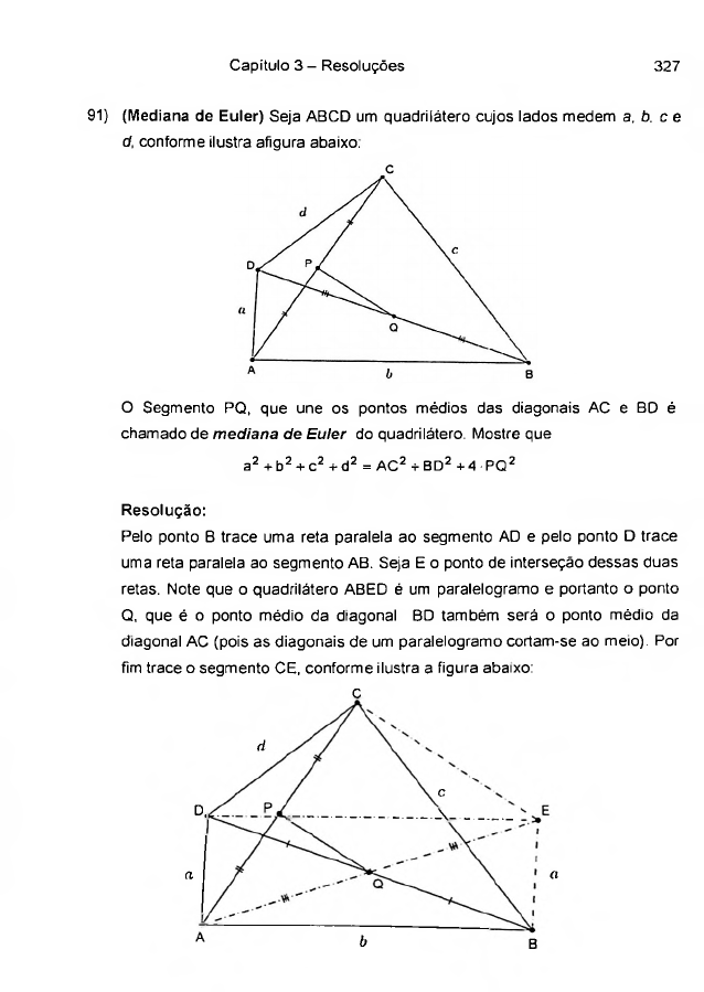 Capítulo 3 - Resoluções 327 d c P D, aa A b B 91) (Mediana de Euler) Seja ABCD um quadrilátero cujos lados medem a. b. c e d, conforme ilustra afigura abaixo. Resolução: Pelo ponto B trace uma reta paralela ao segmento AD e pelo ponto D trace uma reta paralela ao segmento AB. Seja E o ponto de interseção dessas duas retas. Note que o quadrilátero ABED é um paralelogramo e portanto o ponto Q, que é o ponto médio da diagonal BD também será o ponto médio da diagonal AC (pois as diagonais de um paralelogramo cortam-se ao meio). Por fim trace o segmento CE, conforme ilustra a figura abaixo: C O Segmento PQ, que une os pontos médios das diagonais AC e BO é chamado de mediana de Euler do quadrilátero. Mostre que a2 + b2 + c2 + d2 = AC2 + BD2 + 4 -PQ2