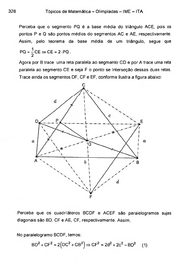 328 Tópicos de Matemática - Olimpíadas - IME - ITA ! 'v E CF2 = 2d2 + 2c2 - BD2 (1) Perceba que os quadriláteros BCDF e ACEF são paralelogramos sujas diagonais são BD. CF e AE, CF, respectivamente. Assim, No paralelogramo BCDF, temos: BD2 + CF2 = 2(DC2 + CB2) Perceba que o segmento PQ é a base média do triângulo ACE, pois os pontos P e Q são pontos médios do segmentos AC e AE, respectivamente. Assim, pelo teorema da base média de um triângulo, segue que PQ = -CE=>CE = 2PQ. 2 Agora por B trace uma reta paralela ao segmento CD e por A trace uma reta paralela ao segmento CE e seja F o ponto se interseção dessas duas retas. Trace ainda os segmentos DF, CF e EF, conforme ilustra a figura abaixo: C