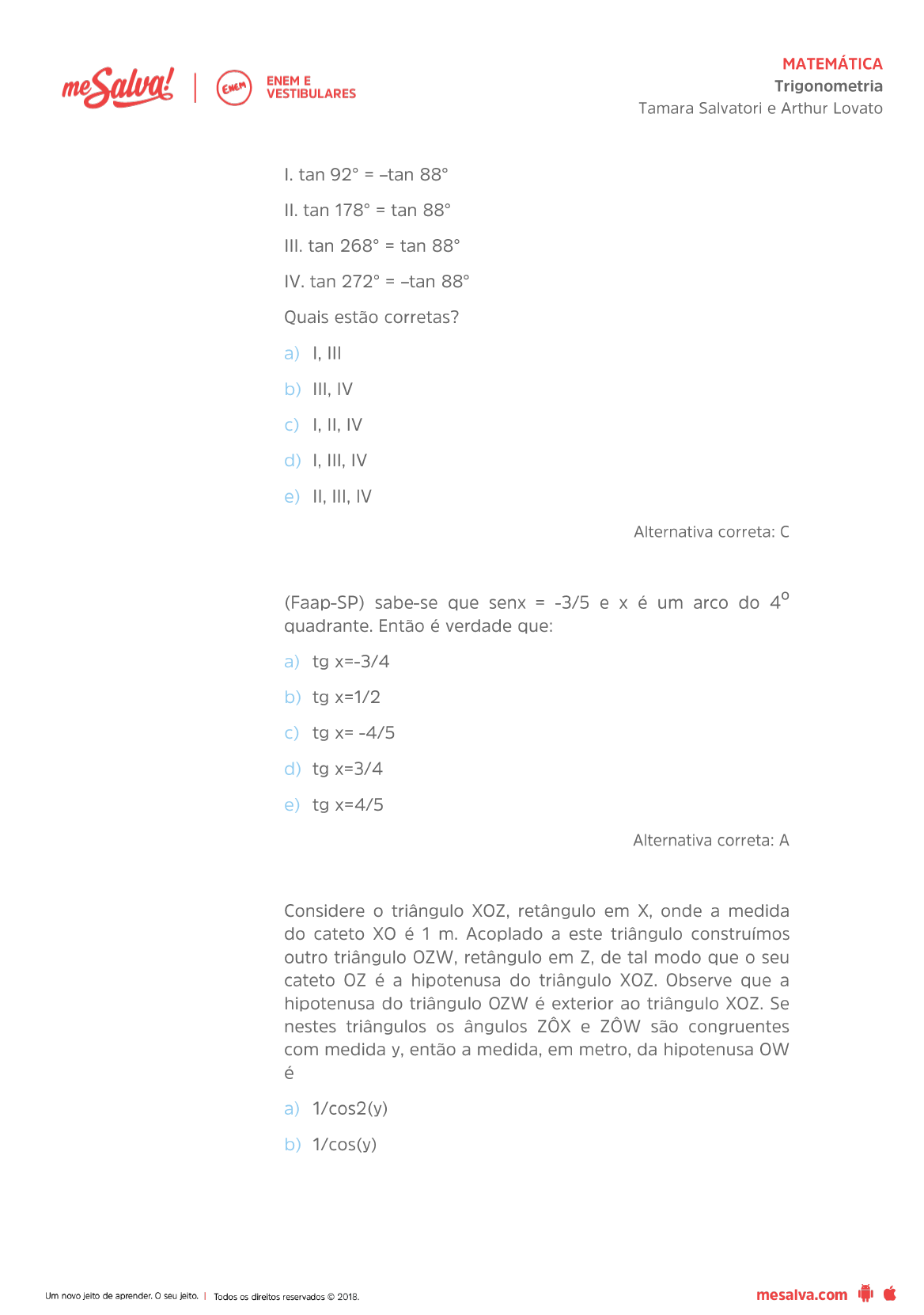 MATEMÁTICA meSalva! ENEM E Trigonometria VESTIBULARES Tamara Salvatori e Arthur Lovato I. tan 92° = -tan 88° II. tan 178° = tan 88° III. tan 268° = tan 88° IV. tan = -tan 88° Quais estão corretas? a) III b) III, IV I, II, IV d) I. III. IV e) II, III, IV Alternativa correta: C (Faap-SP) sabe-se que senx = -3/5 e X é um arco do 4° quadrante. Então é verdade que: a) tg x=-3/4 b) tg x=1/2 tg X= -4/5 d) tg x=3/4 e) tg x=4/5 Alternativa correta: A Considere o triângulo XOZ, retângulo em X, onde a medida do cateto XO é 1 m. Acoplado a este triângulo construímos outro triângulo OZW, retângulo em Z, de tal modo que o seu cateto OZ é a hipotenusa do triângulo XOZ. Observe que a hipotenusa do triângulo OZW é exterior ao triângulo XOZ. Se nestes triângulos os ângulos e são congruentes com medida y, então a medida, em metro, da hipotenusa é a) 1/cos2(y) b) 1/cos(y) Um novo jeito de aprender. o seu jeito. Todos os direitos reservados 2018. mesalva.com