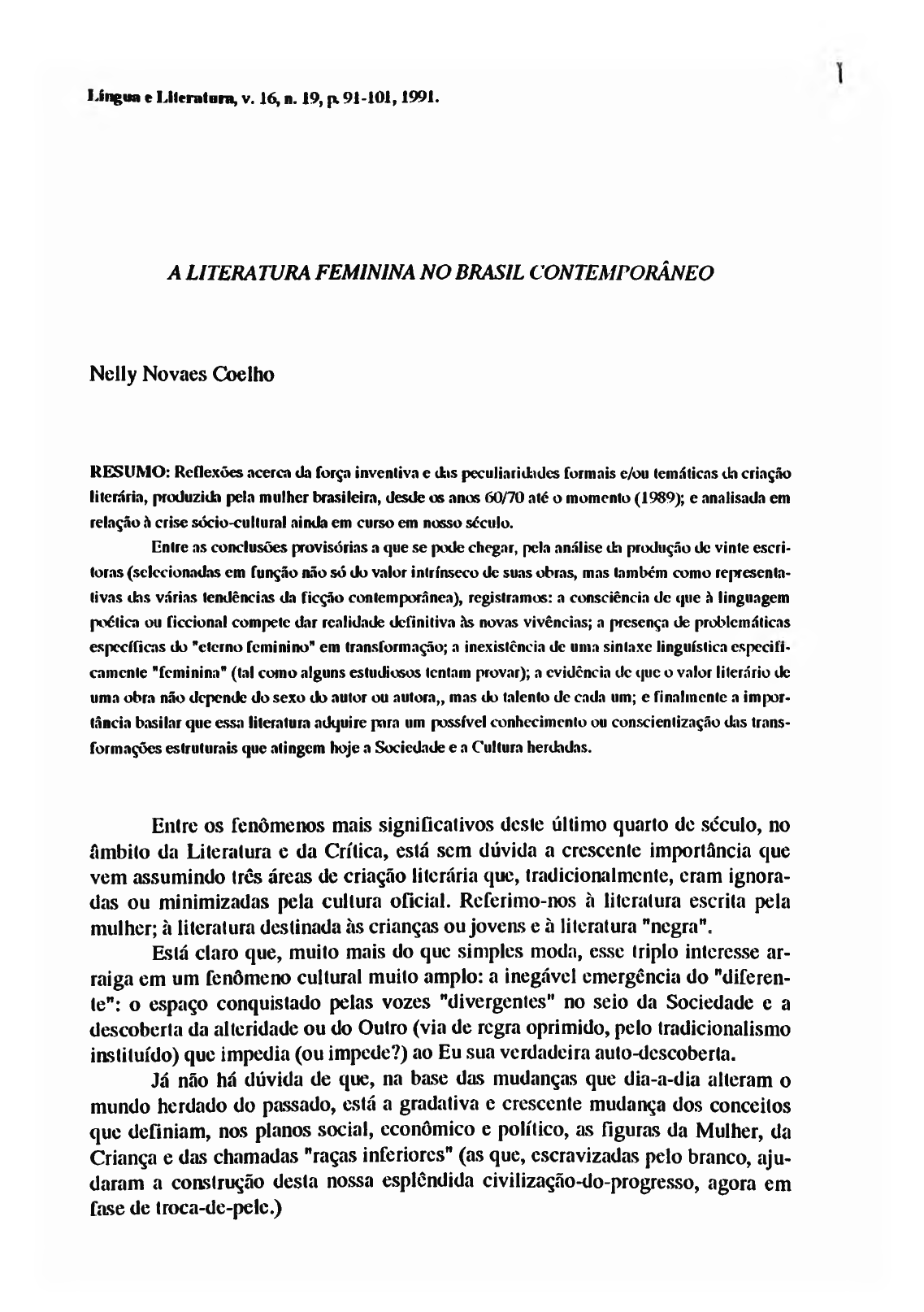 Língua e Literatura, v. 16, n. 19, pt 91-101,1991. A LITERATURA FEMININA NO BRASIL CONTEMPORÂNEO Nelly Novaes Coelho RESUMO: Reflexões acerca da força inventiva e das peculiaridades formais e/ou temáticas da criação literária, produzida pela mulher brasileira, desde os anos 60/70 até o momento (1989); e analisada em relação á crise sócio-cultural ainda em curso em nosso século. Entre as conclusões provisórias a que se pode chegar, pela análise da produção dc vinte escri toras (selecionadas em função não só do valor intrínseco dc suas obras, mas também como representa tivas das várias tendências da ficção contemporânea), registramos: a consciência dc que â linguagem poética ou ficcional compete dar realidade definitiva ãs novas vivências; a presença de problemáticas específicas do "eterno feminino" em transformação; a inexistência de uma sintaxe linguística especifi camente "feminina" (tal como alguns estudiosos tentam provar); a evidência dc que o valor literário de uma obra não depende do sexo do autor ou autora,, mas do talento de cada um; e finalmente a impor tância basilar que essa literatura adquire para um possível conhecimento ou conscientização das trans formações estruturais que atingem hoje a Sociedade e a Cultura herdadas. Entre os fenômenos mais significativos üeste último quarto de século, no âmbito da Literatura e da Crítica, está sem dúvida a crescente importância que vem assumindo três áreas de criação literária que, tradicionalmente, eram ignora das ou minimizadas pela cultura oficial. Referimo-nos à literatura escrita pela mulher; ã literatura destinada às crianças ou jovens e à literatura "negra”. Está claro que, muito mais do que simples moda, csse triplo interesse ar raiga em um fenômeno cultural muito amplo: a inegável emergência do "diferen te": o espaço conquistado pelas vozes "divergentes" no seio da Sociedade c a descoberta da alteridade ou do Outro (via de regra oprimido, pelo tradicionalismo instituído) que impedia (ou impede?) ao Eu sua verdadeira auto-descoberta. Já não há dúvida de que, na base das mudanças que dia-a-dia alteram o mundo herdado do passado, está a gradativa e crescente mudança dos conceitos que definiam, nos planos social, econômico e político, as figuras da Mulher, da Criança e das chamadas "raças inferiores" (as que, escravizadas pelo branco, aju daram a construção desta nossa esplêndida civilização-do-progresso, agora em fase de troca-de-pelc.) 92 COELHO, Nclly Novaes. A literatura feminina no Brasil contem|xirnnco. Língua e Literatura, v. 16, n. 19, p. 91-101,1991. Nessa ordem de ideias, insere-se o chamado boom da Litcralura Infantil a partir de meados dos anos 70; bem como a tímida produção literária ou crítica da "negritude" (e também a redescoberta da nossa "mitologia indígena"), que se tem manifestado, entre nós. E, principalmente, se compreende a força com que a Lite ratura Feminina se vem impondo à Crítica, como um fenômeno especial a exigir a atenção; mesmo a despeito das muitas vozes (inclusive de muitas escritoras...) que vêem nessa distinção (feminino versus masculino) mais uma discriminação. A nosso ver, muito longe de consistir "discriminação" ou de se identificar com um novo preconceito ( a pretensa substituição do Machismo pelo Feminis mo), a preocupação especial que, nestes últimos anos, a Literatura Feminina vem despertando nos leitores e nos estudiosos, se liga ao fato de que a metamorfose- em-marcha no mundo de hoje tem, na mulher, a sua pedra-de-toque. Já se sabe à saciedade que, entre as grandes revoluções inovadoras a que nosso século vem assistindo, a que arraiga na transformação do mundo feminino é das mais decisivas, pois atinge as bases do Sistema de relações vigentes no mundo civilizado que herdamos. Note-se, ainda, que a atenção que a produção literária das mulheres vem exigindo da Crítica, como fenômeno específico que é, em meio à produção literá ria geral, não se identifca com uma intenção judicativa. Não se trata de saber se a lite ratura "feminina" é melhor ou pior do que a "masculina", Obviamente já não têm mais sentido as discussões que se centravam na questão do "valor" maior ou menor de um ou outra; pois já é ponto pacífico o fato de (pie valor literário não tem sexo. Tanto há os grandes escritores ou escritoras, como os meramente bons, medíocres ou péssimos... O confronto entre ambas as produções levam facilmente à conclusão de que homens e mulheres se igualam em força ou energia criativa (desde que tenham idênticas oportunidades de desenvolvimento cultural), e que a maior ou menor "es pessura" literária de cada obra depende exclusivamente da maior ou menor "qualida de" do espírito que a produz, seja de homens ou de mulheres. Nesse sentido, a Crítica atraída pela produção literária da mulher tem-se preocupado basicamente em descobrir o que é, essa literatura; como se constrói e por que trilha determinados caminhos (temáticos, estruturais, estilílicos, ideológi cos, etc.) Ou, pelo menos, tem sido esse o "horizonte de expectativa" que perma nece cm nosso espírito quando, diante de cada livro ou nova autora, entregamo-nos à leitura e à análise, tentando chegar ao além-texto ou ao subtexto, onde estaria oculto o essencial. Para nós, a ponte para esse "diálogo com a esfinge" (que é cada obra lite rária autêntica) está nas relações estabelecidas entre a obra e o momento históri- co-cullural em crise, que a gerou. Em maior ou menor grau, a Crítica literária atual empenha-se em detectar as relações entre a obra e a atmosfera cultural em que ela "respira". E, a partir dessas relações, caracterizar a linguagem criada, a vi bração de sua matéria poética e os inúmeros aspectos que fazem dela uma obra li terária autêntica e "contemporânea". COELHO, Ndly Novaes. A literatura feminina no Brasil contemporâneo. L