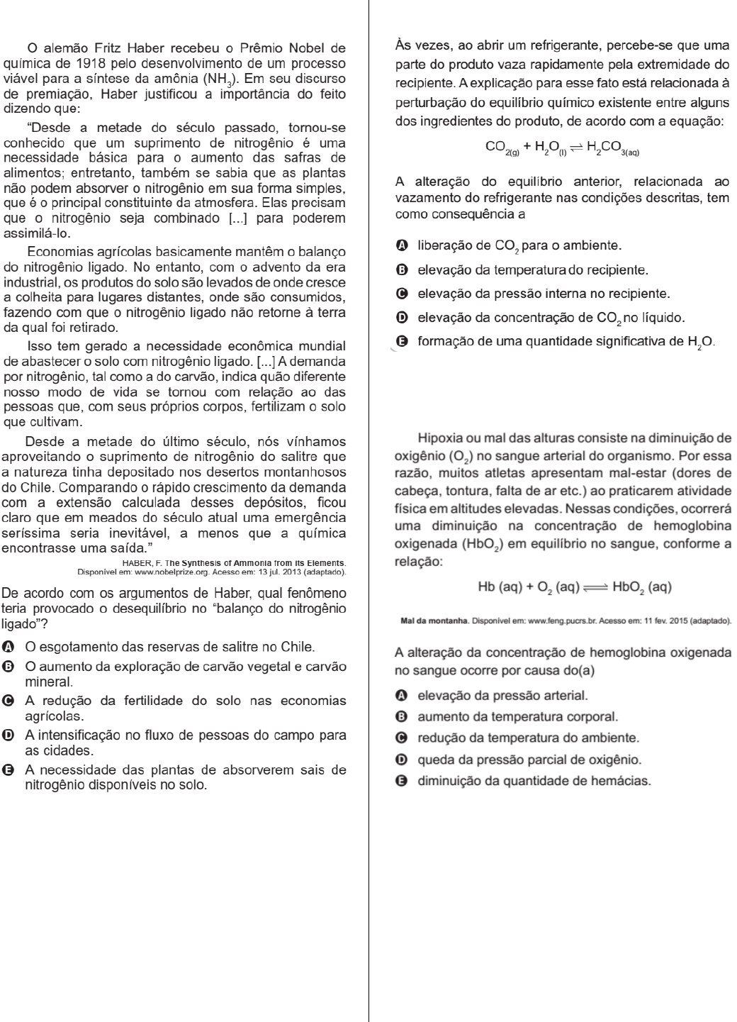 Ficha de exercícios: Equilíbrio Químico Prof. Marconi Costa 1. (ENEM) 2. (ENEM) 3. (ENEM) 4. (ENEM) 5. (SSA) Um reator de 5,0 L é utilizado para a produção de cloro, seguindo a reação equacionada a seguir: O gráfico abaixo mostra como as quantidades de reagentes variam com o tempo, a uma dada temperatura. Qual o valor da constante de equilíbrio para essa reação nessa temperatura? a) 0,08 b) 0,80 c) 8,00 d) 80,00 e) 800,00 6. (SSA) As lentes fotocromáticas mudam de cor de acordo com a intensidade luminosa. Elas ficam praticamente incolores em locais com baixa luminosidade, embora adquiram uma coloração escura quando ficam expostas à luz. Esse processo exemplifica o Princípio de Le Chatelier e está associado à reação química, envolvendo um elemento metálico, indicada pela seguinte equação: 7. (SSA) Os galinhos do tempo são peças decorativas, que mudam de coloração de acordo com as condições climáticas. O efeito é baseado na presença de cloreto de cobalto II, utilizado na tinta que reveste o galo, estabelecendo o seguinte equilíbrio químico: o íon [CoCl4] 2- apresenta a cor azul, ao passo que o íon [Co(H2O)6] , a cor rosa. Sobre isso, assinale a alternativa CORRETA. a) Quando o tempo está seco, o equilíbrio é deslocado para a direita, e o galinho fica rosa. b) Quando o tempo está seco, o equilíbrio é deslocado para a esquerda, e o galinho fica azul. c) Quando o tempo está úmido, o equilíbrio é deslocado para a direita, e o galinho fica azul. d) Quando o tempo está seco, o equilíbrio é deslocado para a esquerda, e o galinho fica rosa. e) Quando o tempo está úmido, o equilíbrio é deslocado para a esquerda, e o galinho fica azul. 8. 9. (UFPE) No início do século XX, a expectativa da Primeira Guerra Mundial gerou uma grande necessidade de compostos nitrogenados. Haber foi o pioneiro na produção de amônia, a partir do nitrogênio do ar. Se a amônia for colocada num recipiente fechado, sua decomposição ocorrerá de acordo com a seguinte equação química não balanceada: As variações das concentrações com o tempo estão ilustradas na figura a seguir. A partir da análise da figura, podemos afirmar que as curvas A, B e C representam a variação temporal das concentrações dos seguintes componentes da reação, respectivamente: 10. 11. 12. (ITA) Num recipiente de volume constante igual a 1 litro, inicialmente evacuado, foi introduzido 1 mol de pentacloreto de fósforo gasoso e puro. O recipiente foi mantido a 250 °C e no equilíbrio final foi verificada a existência de 0,47 mol de gás cloro. Das opções abaixo, identifique a que contém o valor aproximado da constante (KC) do equilíbrio estabelecido dentro do cilindro e representado pela seguinte equação química: a) 0,179 b) 0,22 c) 0,42 d) 2,38 e) 4,52 13. (OBQ) Em um recipiente fechado, uma amostra gasosa de iodeto de hidrogênio (HI) se dissocia espontaneamente originando os gases formadores desta substância estabelecendo um equilíbrio químico descrito na equação a seguir. Independentemente da quantidade inicial de HI colocada no recipiente, observa-se que cerca de 9% das moléculas se dissociam a 30°C. Com base nas informações fornecidas, pode-se dizer que a constante de equilíbrio em termos de concentração (KC) desta reação a 30°C é: a) 2,2 x 10-1 b) 2,2 x 10-2 c) 4,9 x 10-2 d) 2,4 x 10-3 e) 5,4 x 10-4 14. Julgue as afirmações a seguir como verdadeiras (V) ou falsas (F): ( ) Se houver um líquido ou um sólido num sistema em equilíbrio, a concentração destes ou suas pressões parciais não são incluídas nos cálculos de KC e KP. ( ) A adição de um catalisador num sistema em equilíbrio desloca-o no sentido da reação de menor energia de ativação. ( ) O aumento da pressão num sistema em equilíbrio desloca-o no sentido da contração de volume. ( ) O aumento da temperatura num sistema em equilíbrio desloca-o no sentido da reação exotérmica. ( ) A redução da quantidade de reagentes num sistema em equilíbrio, desloca-o no sentido da formação de mais produtos. 15. (OBQ) Em um recipiente de 1,0 L foram colocados 4,0 mol de H2 e 4,0 mol de Cℓ2, ambos gasosos. Em seguida, o recipiente foi aquecido a uma temperatura , e logo se estabeleceu o equilíbrio químico H2(g) + Cℓ2(g) ⇌ 2 HCℓ(g), com uma constante de equilíbrio de 0,25. A partir destas informações, responda o que se pede: a) Determine as concentrações de todas as espécies químicas no equilíbrio. b) Calcule o valor de KC da equação inversa. c) Calcule o valor de KP da equação direta. d) Mantendo a temperatura constante, descreva o que se observa no valor de KC, com o aumento da concentração de Cℓ2(g). 16. (ITA) Considere a reação química hipotética realizada em sistema fechado a pressão e temperatura constantes representada pela equação . Supondo que no início da reação haja apenas os reagentes X e Y, e considerando um intervalo de tempo que se estende de t = 0 até um instante t após o equilíbrio ter sido atingido, assinale a opção que apresenta a variação da energia livre de Gibbs. a) b) c) d) e) 17. (IME) Considere a reação, em equilíbrio, de produção do alvejante gasoso dióxido de cloro, que ocorre em um sistema reacional: Cl2(g) + 2NaClO2(s) ⇄ 2ClO2(g) + 2NaCl(s) Nessa situação, assinale a alternativa correta. a) A adição de mais NaClO2 ao sistema desloca o equilíbrio da reação, de forma a produzir mais alvejante gasoso. b) A razão entre as constantes de equilíbrio KP/KC é igual a 0,0820568.T, em que T é a temperatura do sistema reacional, medida em Kelvin. c) A retirada parcial de NaCl do sistema desloca o equilíbrio da reação, de forma a produzir menos alvejante gasoso. d) A constante de equilíbrio KP é igual à constante de equilíbrio KC. e) Para duas diferentes temperaturas do sistema reacional, desde que elevadas e compatíveis com a manutenção do equilíbrio, o valor numérico da constante de equilíbrio