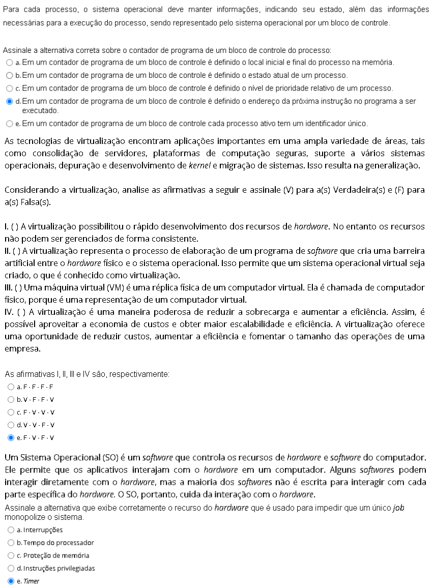 Para cada processo, sistema operacional deve manter informações, indicando seu estado, além das informações necessárias para a execução do processo, sendo representado pelo sistema operacional por um bloco de controle. Assinale a alternativa correta sobre contador de programa de um bloco de controle do processo: a. Em um contador de programa de um bloco de controle é definido local inicial e final do processo na memória. b.Em um contador de programa de um bloco de controle é definido estado atual de um processo. c. Em um contador de programa de um bloco de controle é definido nível de prioridade relativo de um processo. d. Em um contador de programa de um bloco de controle é definido endereço da próxima instrução no programa a ser executado. e. Em um contador de programa de um bloco de controle cada processo ativo tem um identificador único. As tecnologias de virtualização encontram aplicações importantes em uma ampla variedade de áreas, tais como consolidação de servidores, plataformas de computação seguras, suporte a vários sistemas operacionais, depuração e desenvolvimento de kernel e migração de sistemas. Isso resulta na generalização. Considerando a virtualização, analise as afirmativas a seguir e assinale (V) para a(s) Verdadeira(s) e (F) para a(s) Falsa(s). I. ( ) A virtualização possibilitou rápido desenvolvimento dos recursos de hardware. No entanto os recursos não podem ser gerenciados de forma consistente. II. A virtualização representa processo de elaboração de um programa de software que cria uma barreira artificial entre hardware físico e sistema operacional. Isso permite que um sistema operacional virtual seja criado, que é conhecido como virtualização. III. Uma máquina virtual (VM) é uma réplica física de um computador virtual. Ela é chamada de computador físico, porque é uma representação de um computador virtual. IV. A virtualização é uma maneira poderosa de reduzir a sobrecarga e aumentar a eficiência. Assim, é possível aproveitar a economia de custos e obter maior escalabilidade e eficiência. A virtualização oferece uma oportunidade de reduzir custos, aumentar a eficiência e fomentar tamanho das operações de uma empresa. As afirmativas II, III e IV são, Um Sistema Operacional (SO) é um software que controla os recursos de hardware e software do computador. Ele permite que os aplicativos interajam com hardware em um computador. Alguns softwares podem interagir diretamente com hardware, mas a maioria dos softwares não é escrita para interagir com cada parte específica do SO, portanto, cuida da interação com hardware. Assinale a alternativa que exibe corretamente recurso do hardware que é usado para impedir que um único job monopolize sistema. a. Interrupções b. Tempo do processador Proteção de memória d. Instruções privilegiadas e. TimerLeia conteúdo apresentado a seguir. A execução simultânea de múltiplos sistemas operacionais em um único computador físico é possível graças à que é uma combinação de suporte entre hardware e software. Para usuário, cada rodando no computador parece ser um sistema de computação completamente independente. Assinale a alternativa que apresenta correta e respectivamente os elementos que completam as lacunas a. virtualização do hardware, máquina virtual, host b. virtualização do software, máquina virtual, host c. virtualização do software, máquina física, físico d. virtualização do software, máquina física, host e. virtualização do hardware, máquina física, físico Um sistema operacional é também um programa de computador, que controla a execução de outros programas ou aplicativos, sendo assim uma interface entre usuário e hardware do computador. Assinale a alternativa correta que descreve os dois objetivos dos sistemas operacionais: a. Conveniência e eficiência. b. Eficiência e Mobilidade e d. Eficiência e eficácia. e. Conveniência e retratação. Os sistemas operacionais exigem uma alocação regular de memória, com a finalidade de garantir que eles mantenham a memória principal e os demais processos. Portanto, um recurso fundamental de qualquer sistema operacional é a memória principal. Considerando suporte ao sistema operacional, analise as afirmativas a seguir e assinale (V) para a(s) Verdadeira(s) e (F) para a(s) Falsa(s). I. ( ) As partições desiguais de tamanho fixo e de tamanho variável são eficazes no uso da memória. II. ( ) Os pedaços de um programa, conhecidos como frames, poderiam ser atribuídos aos pedaços disponíveis de memória, conhecidos como páginas. III. Em um programa, cada endereço lógico representa um número de frames e um endereço relativo na página. As afirmativas I, e III são, respectivamente: a.V.F.F e.V.F.VOs dados e as instruções de um programa precisam estar na memória física para que haja a execução de um processo. Isso significa que os processos têm um tamanho limitado, porque toda a memória física disponível é usada. Para obter um uso mais eficiente da memória, os processos são carregados dinamicamente. Considerando suporte ao sistema operacional, analise as afirmativas a seguir e assinale (V) para a(s) Verdadeira(s) e (F) para a(s) Falsa(s). I. ( ) Um endereço base é expresso como um local real na memória principal. II. Um endereço lógico é expresso como um local relativo ao final do programa. III. Um endereço físico é expresso como local inicial atual do processo. As afirmativas I, e III são, respectivamente: a.F.F.F e.F.V.F Leia conteúdo apresentado a seguir. É de grande interesse aumentar a agilidade, a flexibilidade e a escalabilidade da Tecnologia da Informação (TI), ao mesmo tempo em que são geradas economias significativas de custo. A de operações de E/S para E/S mapeada na memória e instruções de E/S é implementada pelo suporte estendido a interrupções, definido na estrutura de controle da Uma interrupção do é c