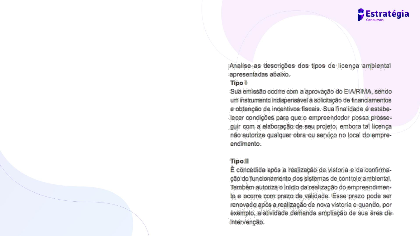 CESGRANRIO/EPE - 2010 Os dois tipos de licença ambiental descritos são, respectivamente, licença a) Prévia e de Operação. b) de Operação e Prévia. c) de Operação e de Instalação. d) de Instalação e de Pré-operação. e) de Instalação e Prévia. Prof. André Rocha @profandrerocha