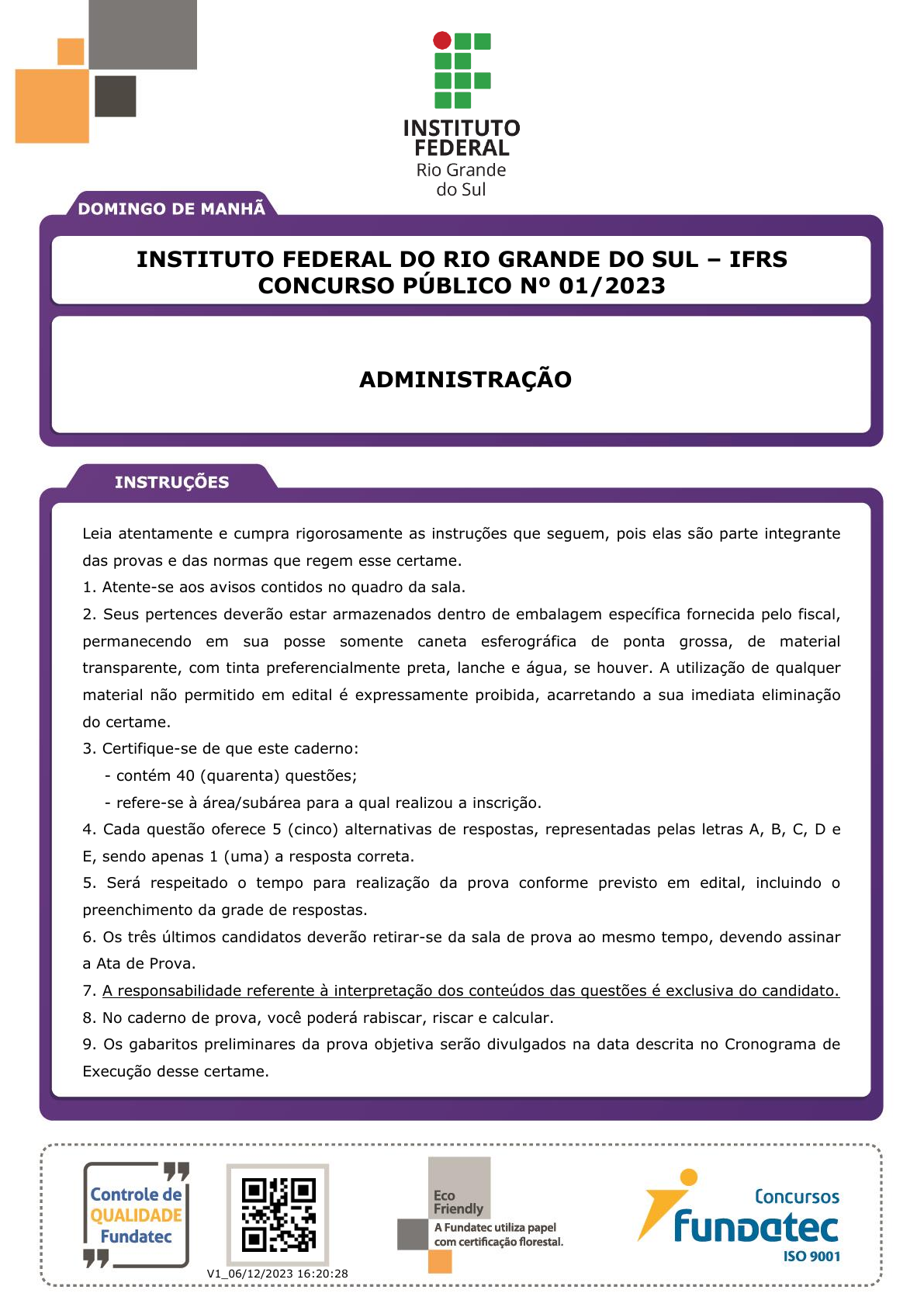 pcimarkpci MDAwMDowMDAwOjAwMDA6MDAwMDowMDAwOmZmZmY6Yzg5MDoxYmZl:VHVlLCAxMSBGZWIgMjAyNSAxMjowMToxMiAtMDMwMA== www.pciconcursos.com.br INSTITUTO FEDERAL DO RIO GRANDE DO SUL – IFRS CONCURSO PÚBLICO Nº 01/2023 Leia atentamente e cumpra rigorosamente as instruções que seguem, pois elas são parte integrante das provas e das normas que regem esse certame. 1. Atente-se aos avisos contidos no quadro da sala. 2. Seus pertences deverão estar armazenados dentro de embalagem específica fornecida pelo fiscal, permanecendo em sua posse somente caneta esferográfica de ponta grossa, de material transparente, com tinta preferencialmente preta, lanche e água, se houver. A utilização de qualquer material não permitido em edital é expressamente proibida, acarretando a sua imediata eliminação do certame. 3. Certifique-se de que este caderno: - contém 40 (quarenta) questões; - refere-se à área/subárea para a qual realizou a inscrição. 4. Cada questão oferece 5 (cinco) alternativas de respostas, representadas pelas letras A, B, C, D e E, sendo apenas 1 (uma) a resposta correta. 5. Será respeitado o tempo para realização da prova conforme previsto em edital, incluindo o preenchimento da grade de respostas. 6. Os três últimos candidatos deverão retirar-se da sala de prova ao mesmo tempo, devendo assinar a Ata de Prova. 7. A responsabilidade referente à interpretação dos conteúdos das questões é exclusiva do candidato. 8. No caderno de prova, você poderá rabiscar, riscar e calcular. 9. Os gabaritos preliminares da prova objetiva serão divulgados na data descrita no Cronograma de Execução desse certame. V1_06/12/2023 16:20:28 ADMINISTRAÇÃO pcimarkpci MDAwMDowMDAwOjAwMDA6MDAwMDowMDAwOmZmZmY6Yzg5MDoxYmZl:VHVlLCAxMSBGZWIgMjAyNSAxMjowMToxMiAtMDMwMA== www.pciconcursos.com.br 807_BASE_NS_DM Execução: Fundatec NÍVEL SUPERIOR 7/12/202312:19:46 LÍNGUA PORTUGUESA Por que escrevo? Por Martha Medeiros 01 02 03 04 05 06 07 08 09 10 11 12 13 14 15 16 17 18 19 20 21 22 23 24 25 26 27 28 29 30 31 32 33 34 35 Escrevo para dar exclusividade ___ solidão que vive em mim. Para não parecer tão esquisita como pareceria se fosse uma solitária que não escreve. Escrevo para não desperdiçar a minha sinceridade. Sozinhos, somos mais sinceros do que quando socializamos. Escrevo para ficar quieta por mais tempo. Para não falar sobre ___ vida dos outros — escrever sobre eles dá menos problema. Escrevo porque não sei tocar guitarra, porque não aprendi a esculpir em madeira, porque meus glúteos são muito largos para o balé. Escrevo porque teria dificuldade de decorar o texto para uma peça, porque só sei desenhar uma casinha — e mal. Escrevo porque a literatura é uma arte discreta. Escrevo porque não existe horário para começar, nem terminar, nem dia útil, nem dia inútil, nem ônibus para pegar, nem parada para descer, nem apito de fábrica, nem gerente, nem chefe (nem carteira assinada também, é o ônus). Escrevo porque gosto muito de ficar em casa. Nunca escrevo em quartos de hotéis, em trens, em espaços de coworking. Escrevo porque ninguém me acusa de estar me escondendo, mesmo que eu esteja. Escrevo porque dizem que a maioria dos homens não suporta mulheres que escrevem. Abençoo esta triagem. Só os corajosos me atraem. Escrevo para me relacionar melhor com a morte. A morte não traz benefícios para quem fabrica guarda-chuvas, atende em consultórios ou limpa vidraças. Mas ela costuma ser generosa com escritores: inspira e, se você for uma Clarice Lispector, eterniza. Escrevo porque não é um trabalho de equipe. Escrevo para uma única pessoa: você, que ao me ler estará sozinho também (mesmo cercado de gente) e em silêncio. Prefiro relações a dois. Escrevo para dar voz às minhas feras, bruxas, demônios. Escrevo porque posso ser malvada, traidora, desaforada, matar e morrer — e acordar ilesa na segunda-feira. Escrevo para me consolar dos traumas de infância e para transformar as dores de amor em royalties — é uma compensação justa. Escrevo porque escrever ativa ___ esperança. A esperança de ser lida, compreendida e amada. E a esperança de que meu texto sirva para fazer alguém se sentir menos estranho para si mesmo. Escrevo porque, se eu parecer louca, ninguém vai dar muita atenção. Periga até eu ganhar um prêmio. Escrevo porque enquanto estou escrevendo, estou lembrando. Escrevo porque nunca sei sobre o que irei escrever. É uma aventura constante revelar para mim mesma o que permanece desconhecido em mim. Em meu primeiro livro, ainda muito jovem, publiquei um verso que dizia: quanto mais escrava, mais escrevo. O tempo passou, me libertei de quase tudo o que me oprimia e devo isso a todos os livros que li, e aos meus. É por ela, a liberdade, que escrevo. (Disponível em: https://gauchazh.clicrbs.com.br/donna/colunistas/martha-medeiros/ – texto adaptado especialmente para esta prova). QUESTÃO 01 – Considerando o exposto pelo texto, analise as assertivas a seguir: I. A autora justifica por que escreve elencando uma série de inaptidões suas. II. Assim como para quem fabrica guarda-chuvas, atende em consultórios ou limpa vidraças, a morte não será benéfica para a autora. III. A escrita ajudou a autora, ao longo dos anos, a livrar-se de coisas que a oprimiam. Quais estão corretas? A) Apenas I. B) Apenas II. C) Apenas I e II. D) Apenas I e III. E) Apenas II e III. pcimarkpci MDAwMDowMDAwOjAwMDA6MDAwMDowMDAwOmZmZmY6Yzg5MDoxYmZl:VHVlLCAxMSBGZWIgMjAyNSAxMjowMToxMiAtMDMwMA== www.pciconcursos.com.br 807_BASE_NS_DM Execução: Fundatec NÍVEL SUPERIOR 7/12/202312:19:46 QUESTÃO 02 – Assinale a alternativa que indica uma característica que NÃO poderia identificar a autora com base nas descrições que ela apresenta de si somente ao longo do texto. A) Solitária. B) Caseira. C) Depressiva. D) Esperançosa. E) Sincera. QUESTÃO 03 – Considerando o emprego do acento indicativo de crase, assinale a alternativa que completa, correta e