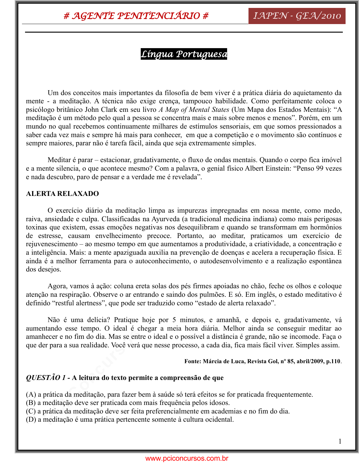 pcimarkpci MDAwMDowMDAwOjAwMDA6MDAwMDowMDAwOmZmZmY6YzhiZDo3M2U0:VHVlLCAwNiBKdWwgMjAyMSAxNjoyNzozMSAtMDMwMA== # AGENTE PENITENCIÁRIO # IAPEN - GEA/2010 1 Língua Portuguesa Um dos conceitos mais importantes da filosofia de bem viver é a prática diária do aquietamento da mente - a meditação. A técnica não exige crença, tampouco habilidade. Como perfeitamente coloca o psicólogo britânico John Clark em seu livro A Map of Mental States (Um Mapa dos Estados Mentais): “A meditação é um método pelo qual a pessoa se concentra mais e mais sobre menos e menos”. Porém, em um mundo no qual recebemos continuamente milhares de estímulos sensoriais, em que somos pressionados a saber cada vez mais e sempre há mais para conhecer, em que a competição e o movimento são contínuos e sempre maiores, parar não é tarefa fácil, ainda que seja extremamente simples. Meditar é parar – estacionar, gradativamente, o fluxo de ondas mentais. Quando o corpo fica imóvel e a mente silencia, o que acontece mesmo? Com a palavra, o genial físico Albert Einstein: “Penso 99 vezes e nada descubro, paro de pensar e a verdade me é revelada”. ALERTA RELAXADO O exercício diário da meditação limpa as impurezas impregnadas em nossa mente, como medo, raiva, ansiedade e culpa. Classificadas na Ayurveda (a tradicional medicina indiana) como mais perigosas toxinas que existem, essas emoções negativas nos desequilibram e quando se transformam em hormônios de estresse, causam envelhecimento precoce. Portanto, ao meditar, praticamos um exercício de rejuvenescimento – ao mesmo tempo em que aumentamos a produtividade, a criatividade, a concentração e a inteligência. Mais: a mente apaziguada auxilia na prevenção de doenças e acelera a recuperação física. E ainda é a melhor ferramenta para o autoconhecimento, o autodesenvolvimento e a realização espontânea dos desejos. Agora, vamos à ação: coluna ereta solas dos pés firmes apoiadas no chão, feche os olhos e coloque atenção na respiração. Observe o ar entrando e saindo dos pulmões. E só. Em inglês, o estado meditativo é definido “restful alertness”, que pode ser traduzido como “estado de alerta relaxado”. Não é uma delícia? Pratique hoje por 5 minutos, e amanhã, e depois e, gradativamente, vá aumentando esse tempo. O ideal é chegar a meia hora diária. Melhor ainda se conseguir meditar ao amanhecer e no fim do dia. Mas se entre o ideal e o possível a distância é grande, não se incomode. Faça o que der para a sua realidade. Você verá que nesse processo, a cada dia, fica mais fácil viver. Simples assim. Fonte: Márcia de Luca, Revista Gol, nº 85, abril/2009, p.110. QUESTÃO 1 - A leitura do texto permite a compreensão de que (A) a prática da meditação, para fazer bem à saúde só terá efeitos se for praticada frequentemente. (B) a meditação deve ser praticada com mais frequência pelos idosos. (C) a prática da meditação deve ser feita preferencialmente em academias e no fim do dia. (D) a meditação é uma prática pertencente somente à cultura ocidental. www.pciconcursos.com.br pcimarkpci MDAwMDowMDAwOjAwMDA6MDAwMDowMDAwOmZmZmY6YzhiZDo3M2U0:VHVlLCAwNiBKdWwgMjAyMSAxNjoyNzozMSAtMDMwMA== # AGENTE PENITENCIÁRIO # IAPEN - GEA/2010 2 (E) a prática da meditação ajuda a limpar a mente, previne doenças, aumenta a longevidade, a capacidade de concentração e a inteligência. QUESTÃO 2 - O trecho que mostra a fala do físico Albert Einstein possui uma relação de sentido equivalente ao que diz o trecho (A) “se entre o ideal e o possível a distância é grande, não se incomode. Faça o que der”. (B) “a meditação é um método pelo qual a pessoa se concentra mais e mais sobre menos e menos”. (C) “você verá que nesse processo, a cada dia, fica mais fácil viver. Simples assim”. (D) “parar não é tarefa fácil, ainda que seja extremamente simples”. (E) “o ideal é chegar a meia hora diária. Melhor ainda se conseguir meditar ao amanhecer e no fim do dia”. QUESTÃO 3 - O texto mostra que meditar é parar, estacionar gradativamente, o fluxo de ondas mentais. Relacionando essa ideia com a vida diária das pessoas, que exige cada vez mais conhecimento em função da constante competição na sociedade é CORRETO afirmar que (A) é impossível praticar a meditação. (B) a prática da meditação não se insere nas sociedades ocidentais. (C) apesar das exigências do mundo moderno, é possível estabelecer certas paradas em prol de uma vida melhor. (D) pessoas que têm uma vida muito ativa não estão preparadas para praticar a meditação. (E) meditar requer muita disciplina e comprometimento, portanto não combina com a vida urbana. QUESTÃO 4 – Analisando o trecho do texto, que segue: “Agora, vamos à ação: coluna ereta solas dos pés firmes apoiadas no chão, feche os olhos e coloque atenção na respiração. Observe o ar entrando e saindo dos pulmões. E só,” verifica-se que o principal propósito é (A) orientar e instruir, objetivamente, a realização de uma tarefa. (B) expor às pessoas uma receita de vida saudável. (C) relatar um exemplo de relaxamento. (D) fornecer exemplo de uma pessoa que se utiliza da meditação para viver bem. (E) mostrar uma fórmula sobre como se deve evitar o stress diariamente. QUESTÃO 5 – Pode-se dizer que, pelo objetivo do texto, verifica-se (A) uma relação muito estreita entre os locutores do texto. (B) um distanciamento entre os locutores. (C) relação de antagonismo entre autor e leitor. (D) uma imparcialidade necessária ao texto. (E) aproximação relativa do autor com o leitor. QUESTÃO 6 – O texto é finalizado com uma proposta de (A) reflexão sobre a vida do leitor. (B) aconselhamento ao leitor. (C) mudança total da vida do leitor. (D) garantia de vida equilibrada ao leitor. (E) encaminhamentos diversos ao leitor. www.pciconcursos.com.br pcimarkpci MDAwMDowMDAwOjAwMDA6MDAwMDowMDAwOmZmZmY6YzhiZDo3M2U0:VHVlLCA
