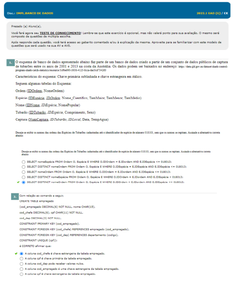Disc.: IMPL.BANCO DE DADOS 2022.1 EAD Prezado (a) Aluno(a), Você fará agora seu TESTE DE CONHECIMENTO! Lembre-se que este exercício é opcional, mas não valerá ponto para sua avaliação. mesmo será composto de questões de múltipla escolha. Após responde cada você terá acesso ao gabarito comentado e/ou à explicação da mesma. Aproveite para se familiarizar com este modelo de questões que será usado na sua AV e AVS. 1. esquema de banco de dados apresentado abaixo faz parte de um banco de dados criado a partir de um conjunto de dados públicos de captura de tubarões entre os anos de 2001 e 2013 na costa da Os dados podem ser baixados no endereço: Caracteristicas do esquema: Chave primária sublinhada e chave estrangeira em Seguem algumas tabelas do Esquema: Ordem NomeOrdem) Espécie IDOrdem TamMédio) Nome (IDNome NomePopular) Tubarão Comprimento, Sexo) Captura ID Tubarão, IDLocal, Data, TempAgua) Deseja-se exibir das ordens das de cadastradas até identificador de espécie de número sem que nomes se repitam Assinale a alternativa correta abaixo: Deseja-se exibir das ordens das de cadastradas até identificador de espécie de número sem que nomes se repitam Assinale a alternativa correta abaixo: SELECT FROM Ordem Espécie E WHERE O.IDOrdem E.IDordem AND E.IDEspécie3. De acordo com modelo de dados definido pelas tabelas seguir, indique a instrução SQL adequada ID- PK FK PARA EMPREGADO PK ID DEPTO FK PARA DEPARTAMENTO Column Type ID GERENTE FK PARA EMPREGADO ID NUMBER(7) NOME VARCHAR2(40 VENDEDOR NUMBER(7) Y Column Type Nullable ID NUMBER(7) _NOME VARCHAR2(20 PRIM_NOME VARCHAR2(20 CARGO VARCHAR2(30) SALARIO NUMBER(7.2) DT_ADMISSAO DATE CPF CHAR(11) ID PK ID_DEPTO NUMBER(7) NUMBER(7) DEPARTAMENTO Column Type ID NUMBER(7) - NOME VARCHAR2(40) Apresentar apenas nome completo do Empregado que atende Cliente ¿Ponto SELECT ULT_NOME FROM EMPREGADO E. CLIENTE C WHERE C.NOME='Ponto SELECT PRIM_NOME II II ULT_NOME FROM EMPREGADO E, CLIENTE C WHERE C.VENDEDOR = E.ID AND C.NOME= SELECT PRIM_NOME II II ULT_NOME FROM EMPREGADO CLIENTE C WHERE E.VENDEDOR = C.ID AND Ponto SELECT PRIM_NOME ULT_NOME FROM EMPREGADO E. CLIENTE C WHERE C.VENDEDOR = E.ID AND Ponto SELECT ULT_NOME FROM EMPREGADO C. CLIENTE E WHERE C.VENDEDOR E.ID AND Ponto 4. As três cláusulas de uma consulta SQL são: select, up, what. from, to. from, who. select, where. select, initial, final. 5. Considere a relação abaixo: AUTOMÓVEL (placa, fabricante, modelo, cor, data_de_fabricação) A consulta SQL que responde a questão "Liste todos os automóveis (placa, modelo, cor) fabricados pela VW ou pela Fiat" é: SELECT PLACA, COR FROM AUTOMOVEL WHERE FABRICANTE IS FIAT); SELECT PLACA, COR FROM AUTOMOVEL WHERE FABRICANTE = VW AND FABRICANTE = SELECT PLACA, COR FROM AUTOMOVEL WHERE FABRICANTE BETWEEN VW AND Nenhuma das resposta acima. SELECT PLACA, COR FROM AUTOMOVEL WHERE FABRICANTE IN (VW, FIAT); 6. esquema de banco de dados apresentado abaixo faz parte de um banco de dados criado a partir de um conjunto de dados públicos de captura de tubarões entre os anos de 2001 e 2013 na costa da Os dados podem ser baixados no endereço: 4125-8cca-dac0cd734263 Características do esquema: Chave primária sublinhada e chave estrangeira em itálico. Seguem algumas tabelas do Esquema: Espécie (IDEspécie, IDOrdem. TamMaior, TamMenor, TamMédio)Nome (IDNome, IDEspécie, NomePopular) Tubarão (IDTubarão, IDEspécie, Comprimento, Sexo) Captura (NumCaptura, IDTubarão, IDLocal, Data, TempAgua) Assinale em qual das consultas abaixo são selecionados nomes populares de tubarões, sem repetição, que foram capturados com temperatura da água igual a 25 e 27 graus: SELECT NomePopular FROM NOME N. ESPÉCIE E. TUBARÃO CAPTURA C WHERE N.IDESPÉCIE = E.IDESPECIE AND E.IDESPECIE = AND C.IDTUBARÃO AND TEMPAGUA BETWEEN 25 AND 27; SELECT DISTINCT NomePopular FROM NOME ESPÉCIE E. TUBARÃO T, CAPTURA C WHERE N.IDESPÉCIE E.IDESPECIE AND E.IDESPECIE T.IDESPECIE AND C.IDTUBARÃO AND TEMPAGUA SELECT NomePopular FROM NOME N. ESPÉCIE E. TUBARÃO CAPTURA C WHERE E.IDESPECIE AND C.IDTUBARÃO AND TEMPAGUA NOT BETWEEN 25 AND 27: SELECT DISTINCT NomePopular FROM NOME N. ESPÉCIE E. TUBARÃO T, CAPTURA WHERE - E.IDESPECIE AND E.IDESPECIE - AND C.IDTUBARÃO AND TEMPAGUA 25 SELECT DISTINCT NomePopular FROM NOME ESPÉCIE E. TUBARÃO T, CAPTURA WHERE N.IDESPÉCIE E.IDESPECIE AND T.IDTUBARÃO C.IDTUBARÃO AND TEMPAGUA IN(25,27); 7. Um programador precisa em uma aplicação conectada a um banco de dados Oracle, uma instrução SQL para exibir apenas os nomes de funcionários da tabela func cujo campo nome se inicie pela letra P. A instrução correta que deve ser utilizada é SELECT nome FROM func LIKE SELECT nome FROM func WHERE nome LIKE SELECT nome FROM func WHERE nome CONTAINS SELECT nome FROM func WHERE SELECT nome FROM func WITH P% IN nome: 8. Aluno TCC Professor MatA: NUMERICO(8) IDTCC: NUMERICO(10) MatP: NUMERICO(S) MatP: NUMERICO(S) NomeP: Texto(50) (1,1) NomeA Texto(50) (1,1) Titulo: Texto(40) NUMERICO(11) TelA: NUMERICO(11) Resumo: Texto(150) emailP: TEXTO(60) NUMERICO(11) DTDefesa: DATA TEXTO(6) emailA: TEXTO(60) NUMERICO(3,1) Diagrama acima representa a estrutura de um banco de dados de uma instituição de ensino para defesa de Trabalhos de Conclusão de Curso (TCC). Esta estrutura já foi implementada e alguns dados já foram também vinte professores, cinco alunos cinco TCC Assinale abaixo qual das alternativas resulta corretamente nos dados exibidos na figura acima: SELECT DISTINCT NOMEP "Nome do Professor" FROM PROFESSOR TCC ALUNO A WHERE P.MATP = A.MATP AND A.MATA = T.MATA: SELECT NOMEP "Nome do Professor" FROM PROFESSOR TCC T. ALUNO A WHERE P.MATP A.MATP AND A.MATA = T.MATA: SELECT NOMEP FROM PROFESSOR TCC ALUNO A WHERE = A.MATP AND A.MATA = T.MATA: SELECT DISTINCT NOMEP FROM PROFESSOR TCC ALUNO A: SELECT DISTINCT NOMEP "Nome do Professor" FROM PROFESSOR TCC T. ALUNO A: