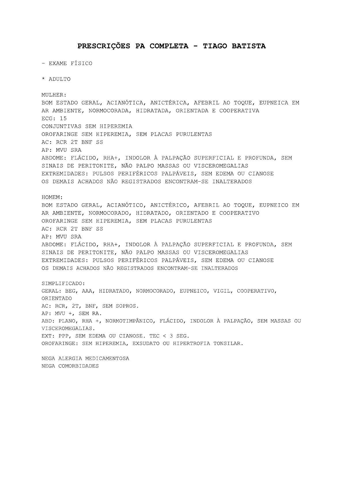 PRESCRIÇÕES PA COMPLETA - TIAGO BATISTA - EXAME FÍSICO * ADULTO MULHER BOM ESTADO GERAL, ACIANÓTICA, ANICTÉRICA, AFEBRIL AO TOQUE, EUPNEICA EM AR AMBIENTE, NORMOCORADA, HIDRATADA, ORIENTADA E COOPERATIVA ECG: 15 CONJUNTIVAS SEM HIPEREMIA OROFARINGE SEM HIPEREMIA, SEM PLACAS PURULENTAS AC: RCR 2T BNF SS AP: MVU SRA ABDOME: FLÁCIDO, RHA+, INDOLOR À PALPAÇÃO SUPERFICIAL E PROFUNDA, SEM SINAIS DE PERITONITE, NÃO PALPO MASSAS OU VISCEROMEGALIAS EXTREMIDADES: PULSOS PERIFÉRICOS PALPÁVEIS, SEM EDEMA OU CIANOSE DEMAIS ACHADOS NÃO REGISTRADOS ENCONTRAM-SE INALTERADOS HOMEM: BOM ESTADO GERAL, ACIANÓTICO, ANICTÉRICO, AFEBRIL AO TOQUE, EUPNEICO EM AR AMBIENTE, NORMOCORADO, HIDRATADO, ORIENTADO E COOPERATIVO OROFARINGE SEM HIPEREMIA, SEM PLACAS PURULENTAS AC: RCR 2T BNF SS AP: MVU SRA ABDOME: FLÁCIDO, RHA+, INDOLOR À PALPAÇÃO SUPERFICIAL E PROFUNDA, SEM SINAIS DE PERITONITE, NÃO PALPO MASSAS OU VISCEROMEGALIAS EXTREMIDADES: PULSOS PERIFÉRICOS PALPÁVEIS, SEM EDEMA OU CIANOSE DEMAIS ACHADOS NÃO REGISTRADOS ENCONTRAM-SE INALTERADOS SIMPLIFICADO: GERAL: BEG, AAA, HIDRATADO, NORMOCORADO, EUPNEICO, VIGIL, COOPERATIVO, ORIENTADO AC: RCR, 2T, BNF, SEM SOPROS. AP: MVU +, SEM RA. ABD: PLANO, RHA +, FLÁCIDO, INDOLOR À PALPAÇÃO, SEM MASSAS OU EXT: PPP, SEM EDEMA OU CIANOSE. TECRECEITUÁRIOS POR DOENCA * ARBOVIROSES USO ORAL 1. DIPIRONA 500MG 10 COMPRIMIDOS TOMAR 01 COMPRIMIDO ATÉ DE 6 EM 6 HORAS SE APRESENTAR DOR OU FEBRE (TEMPERATURA MAIOR QUE SE APRESENTAR DOR MUITO INTENSA, TOMAR 02 COMPRIMIDOS DE 6 EM 6 HORAS. 2. PARACETAMOL 500MG 10 COMPRIMIDOS TOMAR 01 COMPRIMIDO ATÉ DE 6 EM 6 HORAS SE APRESENTAR DOR OU FEBRE (TEMPERATURA MAIOR QUE 37,8°C) QUE NÃO ALIVIAM PELO MENOS 1 HORA APÓS TOMAR DIPIRONA. 2. TYLEX / PACO / PARACETAMOL + CODEÍNA 500MG + 7,5MG OU 500MG + 30MG 10 COMPRIMIDOS TOMAR 01 COMPRIMIDO ATÉ 06/06 HORAS, SE DOR MUITO FORTE E REFRATÁRIA À DIPIRONA + PARACETAMOL 3. METOCLOPRAMIDA 10MG 10 COMPRIMIDOS TOMAR 01 COMPRIMIDO ATÉ DE 8 EM 8H SE APRESENTAR TONTURAS, NÁUSEAS OU VÔMITOS 4. HIXIZINE 25MG 10 COMPRIMIDOS TOMAR 01 COMPRIMIDO DE 8/8 HORAS POR 03 DIAS, SE COCEIRA NA PELE 4. LORATADINA 10MG 05 COMPRIMIDOS TOMAR 01 COMPRIMIDO A NOITE POR 5 DIAS, SE COCEIRA NA PELE 4. CLARITIN D (LORATADINA 5 MG + PSEUDOEFEDRINA 120 MG) 30 CP TOMAR 01 COMPRIMIDO DE 12 EM 12 HORAS 5. SAIS DE REIDRATAÇÃO ORAL 04 ENVELOPES DISSOLVER O CONTEÚDO EM PÓ DE 01 ENVELOPE EM 01 LITRO DE ÁGUA POTÁVEL (FILTRADA, FERVIDA OU MINERAL) TOMAR 01 LITRO DESSA MISTURA POR DIA, ALÉM DE 80ML/KG/DIA DE OUTROS LÍQUIDOS SAUDÁVEIS COMO ÁGUA, ÁGUA DE COCO, CHÁS E SUCOS. NÃO UTILIZAR MEDICAMENTOS AAS, E/OU CORTICÓIDES, TAIS COMO: AAS, IBUPROFENO, CETOPROFENO, NAPROXENO, DICLOFENACO, MELOXICAM, PREDNISONA, PREDNISOLONA, BETAMETASONA, DEXAMETASONA. RETORNAR PARA REAVALIAÇÃO CASO APRESENTE: SANGRAMENTOS, URINA ESCURA E EM DIMINUÍDA, DESMAIOS, CONVULSÕES, DOR ABDOMINAL FORTE, DOR DE CABEÇA FORTE, MANCHAS ROXAS. SOLICITAR, PELO MENOS, HEMOGRAMA EM PACIENTE ACIMA DE 60 ANOS OU COM ALGUM SINAL DE ALARME. SE SINAIS DE ALARME COM MAL ESTADO GERAL E/OU SINAIS DE GRAVIDADE, SOLICITAR TAMBÉM PROTEÍNA, ALBUMINA E TIPAGEMSANGUÍNEA. ALÉM DE GASO, ELETRÓLITOS, TRANSAMINASES, RX DE TÓRAX E US, SE NECESSÁRIO. EXAMES COMEÇAM A VIR ALTERADOS DE 03 A 05 DIAS. GRUPO C = 20ML/KG/H DE SF 0,9%/RINGER LACTATO. MANUTENÇÃO COM 25ML/KG EM 06 HORAS, SE MELHORAR FAZ 25ML/KG EM 08H,SENDO 1/3 DE SF E 2/3 DE GLICOSADO GRUPO D : 20ML/KG EM ATÉ 20 MINUTOS, PODENDO REPETIR ATÉ 03 VEZES ORIENTO QUE, NA CHIKUNGUNYA, DORES ARTICULARES CESSAM EM APROXIMADAMENTE 02 SEMANAS. CASO NÃO MELHOREM (= FASE PÓS-AGUDA DA , PODE INICIAR TRATAMENTO COM E, SE NECESSÁRIO, CORTICÓIDE, QUE ANTES NÃO PODERIAM SER UTILIZADOS. * Uso Externo 1) Compressas Mornas Uso contínuo Aplicar compressas mornas sobre as pálpebras fechadas, durante 5 min, 4 vezes ao dia, seguidas de higiene conforme item 2. * Utilizar gaze ou algodão umedecido com água filtrada morna. * 2) Shampoo Infantil Neutro ou LANUE® 01 frasco Aplicar pequena quantidade de shampoo, fazer espuma e higienizar as pálpebras fechadas e de 12/12 horas, diariamente Uso Oftalmológico 3) pomada 01 tubo Aplicar 12/12h nas pálpebras do olho afetado, por 14 dias. 4) Colírio lubrificante (Hyabak® / Hylo-Comod® / / 01 frasco Pingar 1 gota, de 6/6 horas, em olho afetado. Uso Oral 5) Ibuprofeno 600mg 12 comprimidos Tomar 01 comprimido, via oral, de 8/8 horas, por 03 dias. * BLEFARITE Uso Externo1) Compressas Mornas Uso contínuo Aplicar compressas mornas sobre as pálpebras fechadas, durante 5 min, 12/12 horas, seguidas de higiene conforme item 2. * Utilizar gaze ou algodão umedecido com água filtrada morna. * 2) LANUE® ou Shampoo Infantil Neutro (Johnson' SR) 01 frasco Aplicar pequena quantidade de shampoo, fazer espuma e higienizar as pálpebras fechadas e de 12/12 horas, diariamente. Uso Oftálmico 3) Cylocort® Pomada 01 tubo Aplicar pequena quantidade, de 12/12 horas, em saco conjuntival, durante 14 dias consecutivos. 4) Colírio lubrificante (Hyabak® / / / 01 frasco Pingar 1 gota, de 6/6 horas, em olho afetado. * CONJUNTIVITES VIRAIS USO TÓPICO 1. Colírio lubrificante (Hyabak® / / Hylo-GEL® / 01 frasco Pingar 1 gota, de 6/6 horas, em olho afetado. 2. COMPRESSA GELADA Uso contínuo Aplicar compressas geladas sobre as pálpebras fechadas, durante 20min, 4x/dia. *Utilizar algodão umedecido com água filtrada gelada* USO ORAL 3. LORATADINA 10MG 10CP TOMAR 1 CP DE 12/12 HORAS POR 5 DIA 4. IBUPROFENO 600MG 20CP TOMAR 1 CP DE 6/6 HORAS POR 5 DIAS OBS.: NÃO UTILIZAR COLÍRIO QUE TENHA CORTICOIDE* CONJUNTIVITES ALÉRGICAS 1) S Colírio 01 frasco Pingar 1 gota, 1 vez ao dia, em ambos olhos, durante 30 dias. 2) Hyabak® Colírio 01 frasco Pingar 1 gota, de 6/6 horas, em ambos olhos. Uso Oral 3) Loratadina 1mg/mL 01 caixa Tomar 10mL, VO, à noite, por 07 dias. 3) Loratadina 10mg 01 caixa Tomar 1 comprimido, VO, à noite, por 07 dias. Uso Externo 4) Compressas Geladas Uso co
