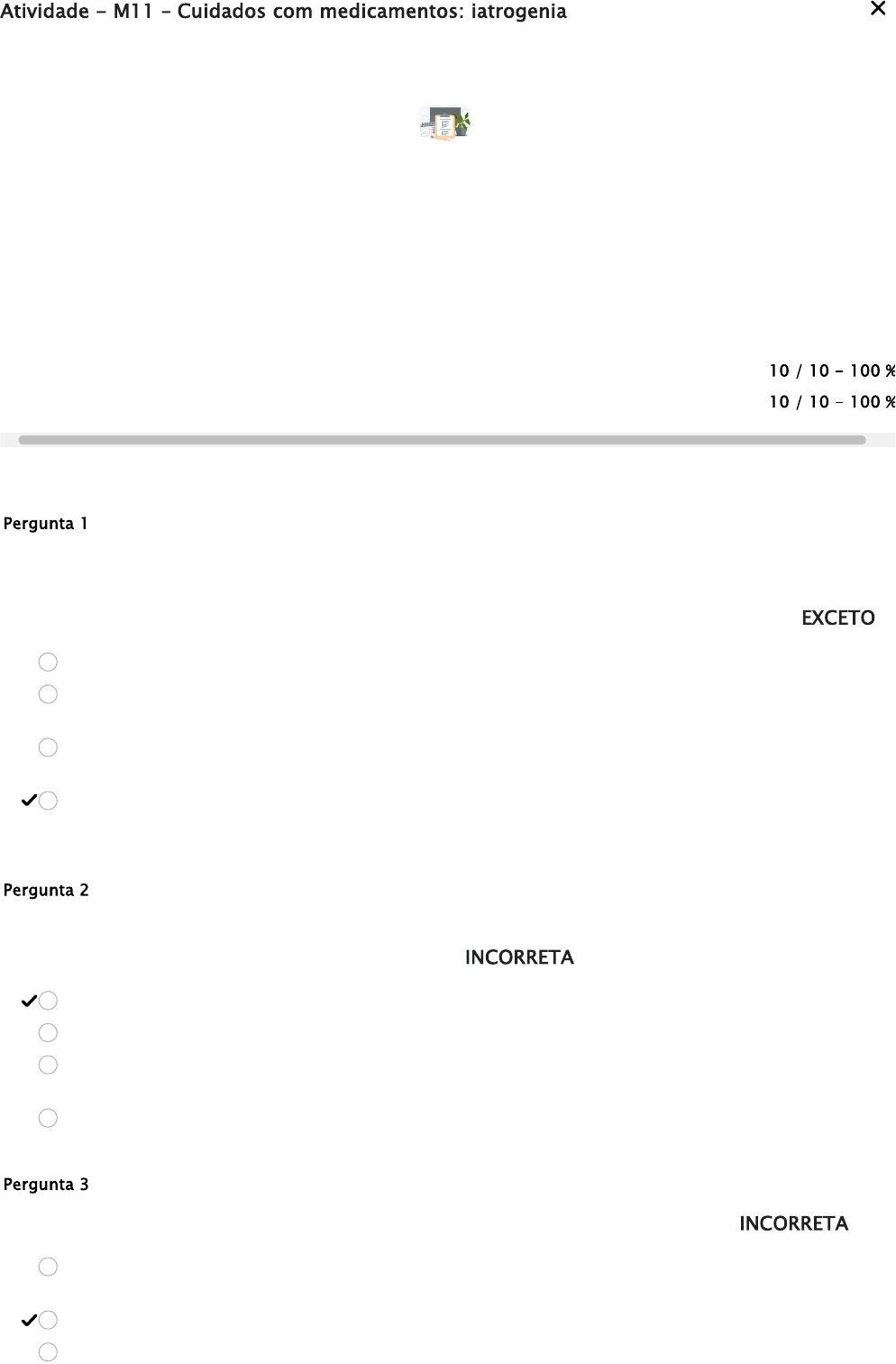 Atividade - M11 – Cuidados com medicamentos: iatrogenia 1 2 Your work has been saved and submitted Por escrito 14 julho, 2024 20:55 - 14 julho, 2024 20:57Attempt 3 of ilimitado Pontuação da tentativa 10 / 10 - 100 % Nota geral (Maior tentativa) 10 / 10 - 100 % Pergunta 1 2 / 2 pontos A alta prevalência de doenças crônicas no idoso leva-os a tomar uma grande quantidade de medicamentos. O uso correto dos medicamentos é fundamental para a recuperação da sua saúde. São medidas para reduzir os riscos da administração inadequada no idoso, EXCETO: Pergunta 2 2 / 2 pontos A iatrogenia é uma das principais síndromes geriátricas e apresenta múltiplas causas. Sobre este gigante da geriatria, assinale a alternativa INCORRETA: Pergunta 3 2 / 2 pontos Em relação aos cuidados com medicamentos em casa, assinale a alternativa INCORRETA: A automedicação é um problema muito sério e pode ter consequências graves no idoso. Ocorrem alterações no organismo do idoso que alteram tanto a farmacocinética, quanto à farmacodinâmica. O uso inadequado dos medicamentos pode causar danos aos pacientes, portanto, só devem ser administrados sob prescrição médica. Qualquer alteração apresentada pelo idoso, o cuidador não precisa se preocupar, pois é comum que os medicamentos causam vários efeitos colaterais, como as quedas, agitação, vômito, tosse, constipação intestinal, entre outros. A iatrogenia é qualquer intervenção realizada pelo profissional médico. Geralmente é subdiagnosticada, e as pessoas tendem a associar as queixas do idoso à "idade". O excesso de intervenções reabilitadoras, assim como o excesso de profissionais, pode levar a consequências desfavoráveis para o idoso. O prolongamento artificial da vida sem perspectiva de reversibilidade com sofrimento para o idoso e para a família é uma iatrogenia. Não guardar medicamentos no banheiro, partes quentes, ou úmidas, com alta exposição solar e com produtos de limpeza, perfumaria e alimentos. Medicamentos que precisam de refrigeração devem ser guardados na porta da geladeira. Se o idoso utiliza porta-comprimidos para guardar os medicamentos, deve-se mantê-los em sua embalagem original. Pergunta 4 2 / 2 pontos A via parenteral inclui a via subcutânea, que é a administração do medicamento abaixo da superfície da pele. Em relação a esta via, assinale a alternativa INCORRETA: Pergunta 5 2 / 2 pontos A via de administração é a maneira como o medicamento entra em contato com o organismo, ou seja, sua porta de entrada. Portanto, em idosos frágeis com disfagia, a administração por sondas pode ser inevitável, e a absorção pode ocorrer no estômago ou intestino. Em relação à via enteral, assinale a alternativa INCORRETA: Manter os medicamentos de uso contínuo separados dos que já foram suspensos. É muito usada para a administração da insulina, que deve ser misturada em movimentos circulares e suaves, antes da sua aplicação, até que todo conteúdo esteja homogêneo. É importante aplicar a insulina todos os dias no mesmo local, que geralmente é o local de preferência do idoso. Caso tenha atingido algum vaso sanguíneo, não administrar a insulina. Retirar a agulha e iniciar novamente todo processo em outro local. Ao tirar a agulha, pressionar o local com algodão sem massagear. Os comprimidos devem ser triturados e dissolvidos em 20 ml de água filtrada. Mesmo os medicamentos líquidos devem ser misturados em 20 ml de água filtrada. Ao administrar mais de um medicamento no mesmo horário, triturá-los e administrá-los juntos. Lavar a sonda antes e após a administração dos medicamentos com 20 a 40 ml de água.