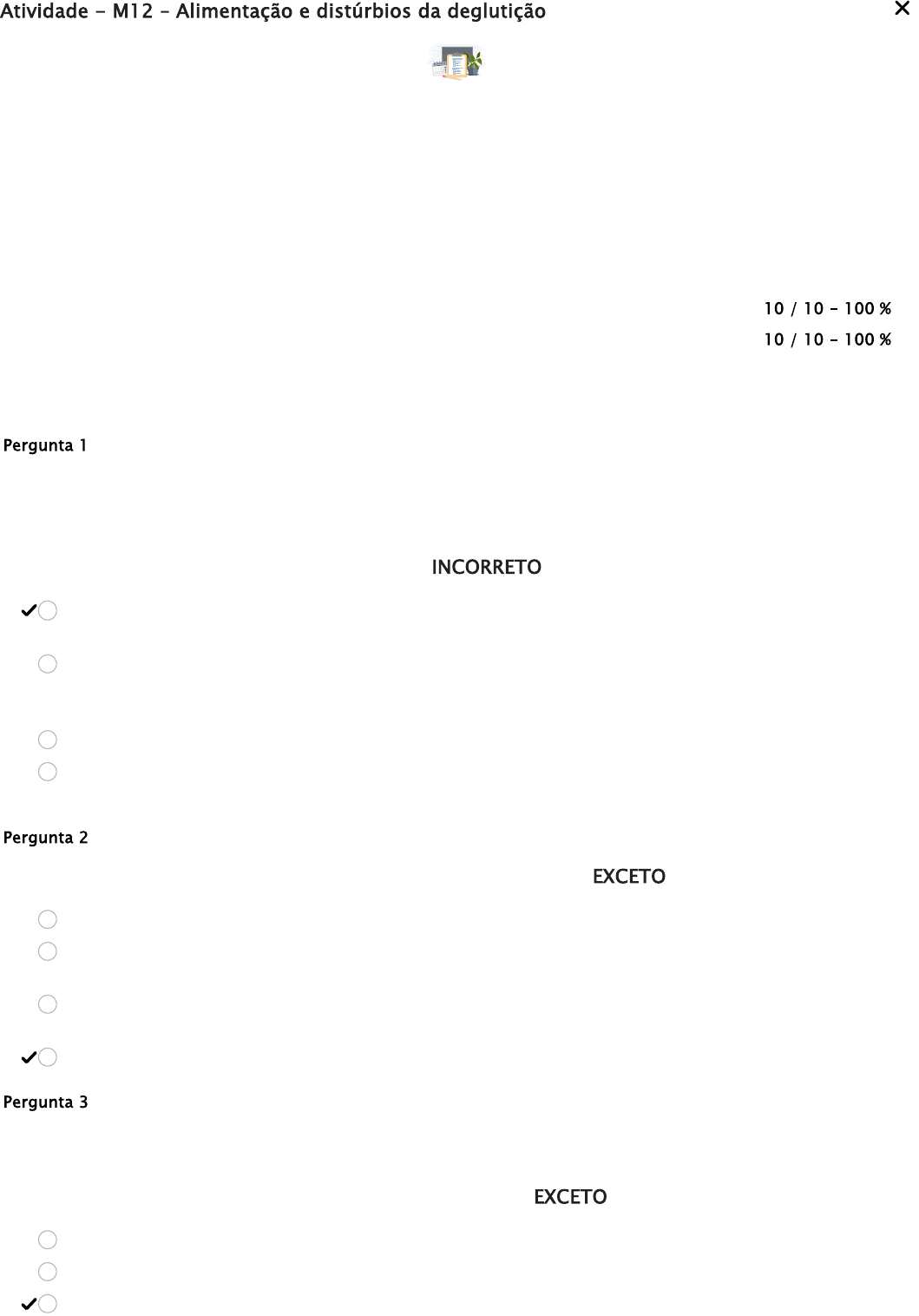 Atividade - M12 – Alimentação e distúrbios da deglutição 1 2 Your work has been saved and submitted Por escrito 14 julho, 2024 20:58 - 14 julho, 2024 20:59Attempt 1 of ilimitado Pontuação da tentativa 10 / 10 - 100 % Nota geral (Maior tentativa) 10 / 10 - 100 % Pergunta 1 2 / 2 pontos A alimentação faz parte da rotina de qualquer pessoa e está associada a momentos prazerosos de socialização. O ato de se alimentar é muito importante para o bem- estar do idoso, mesmo frágil. E, ao longo do envelhecimento, as modificações na dieta também são necessárias. Sobre a alimentação e problemas de deglutição, é INCORRETO afirmar que: Pergunta 2 2 / 2 pontos A alimentação do idoso demanda alguns cuidados especiais, EXCETO: Pergunta 3 2 / 2 pontos A disfagia é qualquer dificuldade na condução do alimento da boca até o estômago, podendo gerar grandes complicações clínicas para o idoso, como pneumonia de aspiração. Por isto o cuidador deve estar atento a alguns sinais e sintomas, EXCETO: As alterações na acuidade sensorial (visão, audição, olfato, gustação e tato) não interferem de maneira nenhuma na alimentação de idosos. A capacidade de mastigar pode estar alterada quando há perda de dentes, próteses mal ajustadas ou doenças dentais. A consulta ao dentista é fundamental para verificar a extensão desse problema e propor soluções. Refeições monótonas reduzem o apetite e desnutrem o idoso. A desidratação reduz a produção de saliva e a boca fica seca (xerostomia), o que prejudica a mastigação e a deglutição. Alguns medicamentos pioram ou são a causa dessa situação. O idoso reduz o consumo de proteína, o que aumenta o risco de sarcopenia. O ovo é excelente fonte de proteína e seu consumo diário, não aumenta o colesterol ou o risco cardiovascular. A vitamina D no idoso é importante para evitar a osteoporose, por isto a exposição diária de 15 minutos entre 10 e 14 horas ajuda a suprir a necessidade que o idoso precisa. O idoso necessita de mais proteína, que são encontradas nos vegetais e cereais. Dificuldade em perceber que o alimento está na cavidade oral. Escape de alimentos da cavidade oral, devido à dificuldade de fechar os lábios. Durante a alimentação, o idoso abre muito a boca, o que leva a constante perda de saliva. Pergunta 4 2 / 2 pontos A comida de verdade é composta basicamente de alimentos in natura ou minimamente processados. Assinale a alternativa INCORRETA em relação a estes alimentos: Pergunta 5 2 / 2 pontos Algumas dicas são extremamente importantes antes, durante e após a oferta de alimento, EXCETO: Redução do reflexo de deglutição e da tosse, favorecendo a pneumonias aspirativas e pigarro. São mais saudáveis e têm mais nutrientes. É mais cara do que uma alimentação baseada em alimentos ultraprocessados. O consumo de sal aumenta a pressão arterial e o risco de doenças do coração. O azeite de oliva é um tipo de gordura saudável, mas não se sugere cozinhar com azeite, pois perde suas propriedades. Oferecer líquidos durante as refeições para facilitar a deglutição do idoso. Oferecer o alimento apenas se o idoso estiver alerta, assentado ou com a cabeceira elevada de 30 a 40 graus. Deixar o alimento na frente do idoso para estimular a salivação e deixar que ele sinta o cheiro do alimento. Antes de oferecer a próxima colherada, pedir ao idoso para abrir a boca e certificar-se que engoliu toda a comida.