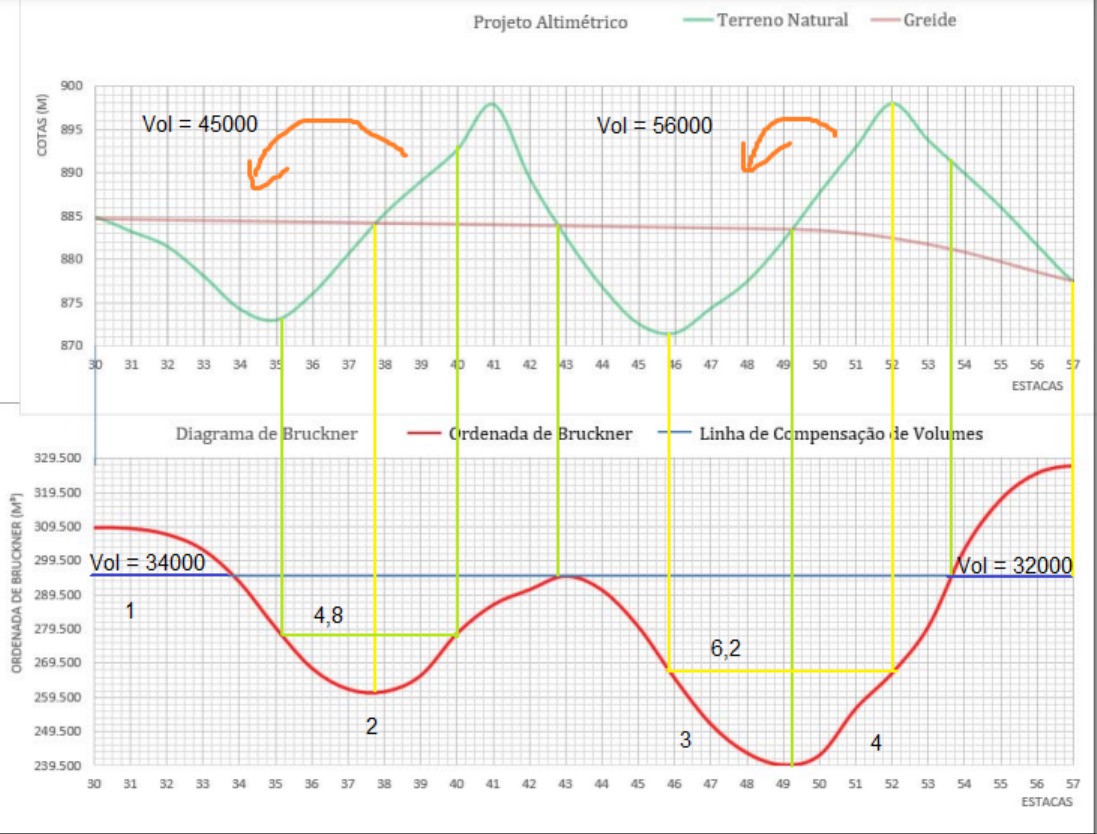 Projeto Altimétrico Terreno Natural Greide 900 895 Vol = 45000 Vol 56000 890 885 880 875 870 30 31 32 33 34 35 36 37 38 39 41 42 43 44 45 16 47 48 49 50 51 52 53 54 55 56 57 Diagrama de Bruckner Ordenada de Bruckner Linha de Compensação de Volumes 329.500 319.500 309.500 299.500 Vol = 34000 Vol = 32000 289.500 1 4,8 279.500 6,2 269.500 259.500 249.500 2 3 4 239.500 30 31 32 33 34 35 36 37 38 39 40 41 42 43 44 45 46 47 48 49 50 51 52 53 54 55 56 571 bota fora : d 2 34 500 m sentido as DMT : = 4,8m 3 56000 ao 6,2m 4 de e lota 32.000 m