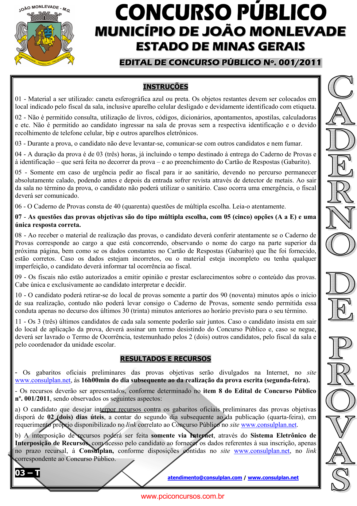 pcimarkpci MDAwMDowMDAwOjAwMDA6MDAwMDowMDAwOmZmZmY6OTU0ZTpiOTcw:VHVlLCAxMSBGZWIgMjAyNSAwNDoxNDo0NyAtMDMwMA== www.pciconcursos.com.br INSTRUÇÕES 01 - Material a ser utilizado: caneta esferográfica azul ou preta. Os objetos restantes devem ser colocados em local indicado pelo fiscal da sala, inclusive aparelho celular desligado e devidamente identificado com etiqueta. 02 - Não é permitido consulta, utilização de livros, códigos, dicionários, apontamentos, apostilas, calculadoras e etc. Não é permitido ao candidato ingressar na sala de provas sem a respectiva identificação e o devido recolhimento de telefone celular, bip e outros aparelhos eletrônicos. 03 - Durante a prova, o candidato não deve levantar-se, comunicar-se com outros candidatos e nem fumar. 04 - A duração da prova é de 03 (três) horas, já incluindo o tempo destinado à entrega do Caderno de Provas e à identificação – que será feita no decorrer da prova – e ao preenchimento do Cartão de Respostas (Gabarito). 05 - Somente em caso de urgência pedir ao fiscal para ir ao sanitário, devendo no percurso permanecer absolutamente calado, podendo antes e depois da entrada sofrer revista através de detector de metais. Ao sair da sala no término da prova, o candidato não poderá utilizar o sanitário. Caso ocorra uma emergência, o fiscal deverá ser comunicado. 06 - O Caderno de Provas consta de 40 (quarenta) questões de múltipla escolha. Leia-o atentamente. 07 - As questões das provas objetivas são do tipo múltipla escolha, com 05 (cinco) opções (A a E) e uma única resposta correta. 08 - Ao receber o material de realização das provas, o candidato deverá conferir atentamente se o Caderno de Provas corresponde ao cargo a que está concorrendo, observando o nome do cargo na parte superior da próxima página, bem como se os dados constantes no Cartão de Respostas (Gabarito) que lhe foi fornecido, estão corretos. Caso os dados estejam incorretos, ou o material esteja incompleto ou tenha qualquer imperfeição, o candidato deverá informar tal ocorrência ao fiscal. 09 - Os fiscais não estão autorizados a emitir opinião e prestar esclarecimentos sobre o conteúdo das provas. Cabe única e exclusivamente ao candidato interpretar e decidir. 10 - O candidato poderá retirar-se do local de provas somente a partir dos 90 (noventa) minutos após o início de sua realização, contudo não poderá levar consigo o Caderno de Provas, somente sendo permitida essa conduta apenas no decurso dos últimos 30 (trinta) minutos anteriores ao horário previsto para o seu término. 11 - Os 3 (três) últimos candidatos de cada sala somente poderão sair juntos. Caso o candidato insista em sair do local de aplicação da prova, deverá assinar um termo desistindo do Concurso Público e, caso se negue, deverá ser lavrado o Termo de Ocorrência, testemunhado pelos 2 (dois) outros candidatos, pelo fiscal da sala e pelo coordenador da unidade escolar. RESULTADOS E RECURSOS - Os gabaritos oficiais preliminares das provas objetivas serão divulgados na Internet, no site www.consulplan.net, às 16h00min do dia subsequente ao da realização da prova escrita (segunda-feira). - Os recursos deverão ser apresentados, conforme determinado no item 8 do Edital de Concurso Público nº. 001/2011, sendo observados os seguintes aspectos: a) O candidato que desejar interpor recursos contra os gabaritos oficiais preliminares das provas objetivas disporá de 02 (dois) dias úteis, a contar do segundo dia subsequente ao da publicação (quarta-feira), em requerimento próprio disponibilizado no link correlato ao Concurso Público no site www.consulplan.net. b) A interposição de recursos poderá ser feita somente via Internet, através do Sistema Eletrônico de Interposição de Recursos, com acesso pelo candidato ao fornecer os dados referentes à sua inscrição, apenas no prazo recursal, à Consulplan, conforme disposições contidas no site www.consulplan.net, no link correspondente ao Concurso Público. 03 – T MMMUUUNNNIIICCCÍÍÍPPPIIIOOO DDDEEE JJJOOOÃÃÃOOO MMMOOONNNLLLEEEVVVAAADDDEEE EEESSSTTTAAADDDOOO DDDEEE MMMIIINNNAAASSS GGGEEERRRAAAIIISSS EEEDDDIIITTTAAALLL DDDEEE CCCOOONNNCCCUUURRRSSSOOO PPPÚÚÚBBBLLLIIICCCOOO NNNººº... 000000111///222000111111 atendimento@consulplan.com / www.consulplan.net www.pciconcursos.com.br pcimarkpci MDAwMDowMDAwOjAwMDA6MDAwMDowMDAwOmZmZmY6OTU0ZTpiOTcw:VHVlLCAxMSBGZWIgMjAyNSAwNDoxNDo0NyAtMDMwMA== www.pciconcursos.com.br CCCOOONNNCCCUUURRRSSSOOO PPPÚÚÚBBBLLLIIICCCOOO ––– MMMUUUNNNIIICCCÍÍÍPPPIIIOOO DDDEEE JJJOOOÃÃÃOOO MMMOOONNNLLLEEEVVVAAADDDEEE///MMMGGG AUXILIAR DE CONSULTÓRIO ODONTOLÓGICO www.consulplan.net / atendimento@consulplan.com - 2 - CCAARRGGOO:: AAUUXXIILLIIAARR DDEE CCOONNSSUULLTTÓÓRRIIOO OODDOONNTTOOLLÓÓGGIICCOO TEXTO: A música Música é uma das formas de arte que toca profundamente pessoas de todas as culturas e idades. Para alguns estudiosos, o ser humano, antes mesmo de aprender a pintar, a esculpir, a escrever ou a dançar, já fazia arte com os sons. A palavra música deriva de “arte das musas”, em referência à mitologia grega e à cultura da Antiguidade Clássica. Hoje já se faz música com objetos, ruídos e o corpo. Por meio da experimentação e da construção, o ser humano reinventa a música, reconstruindo um universo de sons. A origem dos instrumentos musicais acompanha a trajetória da própria civilização humana. Desde a imitação dos sons e de seres da natureza pelos primitivos até a cultura atual, o ser humano vem criando e utilizando instrumentos musicais para expressar sentimentos, ideias e saberes por meio da música. Essa criação se dá por meio de uma linguagem intuitiva ou de normas universais. Difícil precisar com rigor a época e o lugar em que surgiu o primeiro instrumento musical. Muitos deles existiram em mais de uma civilização antiga. Os estudiosos da música acreditam que a criação de instrumentos