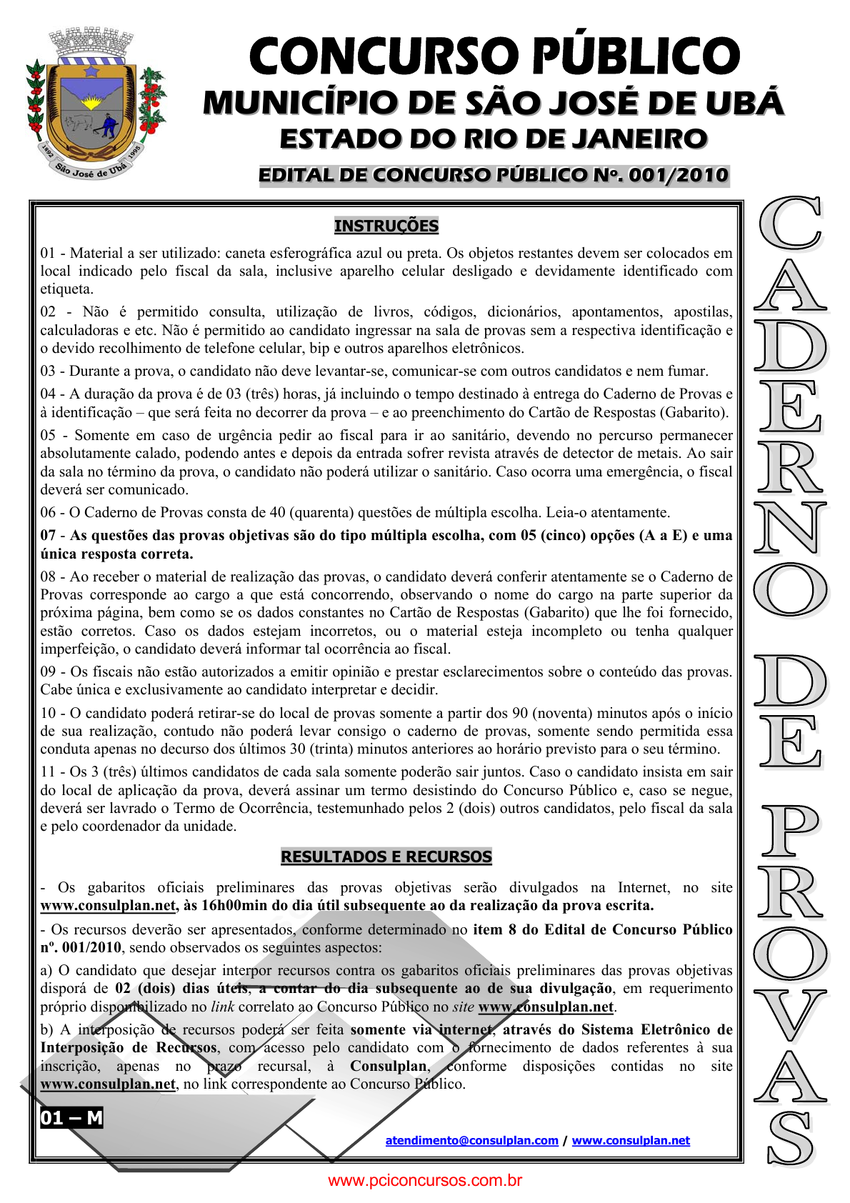 pcimarkpci MDAwMDowMDAwOjAwMDA6MDAwMDowMDAwOmZmZmY6OTU0ZTpiOTcw:VHVlLCAxMSBGZWIgMjAyNSAwNDoxNDowNyAtMDMwMA== www.pciconcursos.com.br INSTRUÇÕES 01 - Material a ser utilizado: caneta esferográfica azul ou preta. Os objetos restantes devem ser colocados em local indicado pelo fiscal da sala, inclusive aparelho celular desligado e devidamente identificado com etiqueta. 02 - Não é permitido consulta, utilização de livros, códigos, dicionários, apontamentos, apostilas, calculadoras e etc. Não é permitido ao candidato ingressar na sala de provas sem a respectiva identificação e o devido recolhimento de telefone celular, bip e outros aparelhos eletrônicos. 03 - Durante a prova, o candidato não deve levantar-se, comunicar-se com outros candidatos e nem fumar. 04 - A duração da prova é de 03 (três) horas, já incluindo o tempo destinado à entrega do Caderno de Provas e à identificação – que será feita no decorrer da prova – e ao preenchimento do Cartão de Respostas (Gabarito). 05 - Somente em caso de urgência pedir ao fiscal para ir ao sanitário, devendo no percurso permanecer absolutamente calado, podendo antes e depois da entrada sofrer revista através de detector de metais. Ao sair da sala no término da prova, o candidato não poderá utilizar o sanitário. Caso ocorra uma emergência, o fiscal deverá ser comunicado. 06 - O Caderno de Provas consta de 40 (quarenta) questões de múltipla escolha. Leia-o atentamente. 07 - As questões das provas objetivas são do tipo múltipla escolha, com 05 (cinco) opções (A a E) e uma única resposta correta. 08 - Ao receber o material de realização das provas, o candidato deverá conferir atentamente se o Caderno de Provas corresponde ao cargo a que está concorrendo, observando o nome do cargo na parte superior da próxima página, bem como se os dados constantes no Cartão de Respostas (Gabarito) que lhe foi fornecido, estão corretos. Caso os dados estejam incorretos, ou o material esteja incompleto ou tenha qualquer imperfeição, o candidato deverá informar tal ocorrência ao fiscal. 09 - Os fiscais não estão autorizados a emitir opinião e prestar esclarecimentos sobre o conteúdo das provas. Cabe única e exclusivamente ao candidato interpretar e decidir. 10 - O candidato poderá retirar-se do local de provas somente a partir dos 90 (noventa) minutos após o início de sua realização, contudo não poderá levar consigo o caderno de provas, somente sendo permitida essa conduta apenas no decurso dos últimos 30 (trinta) minutos anteriores ao horário previsto para o seu término. 11 - Os 3 (três) últimos candidatos de cada sala somente poderão sair juntos. Caso o candidato insista em sair do local de aplicação da prova, deverá assinar um termo desistindo do Concurso Público e, caso se negue, deverá ser lavrado o Termo de Ocorrência, testemunhado pelos 2 (dois) outros candidatos, pelo fiscal da sala e pelo coordenador da unidade. RESULTADOS E RECURSOS - Os gabaritos oficiais preliminares das provas objetivas serão divulgados na Internet, no site www.consulplan.net, às 16h00min do dia útil subsequente ao da realização da prova escrita. - Os recursos deverão ser apresentados, conforme determinado no item 8 do Edital de Concurso Público nº. 001/2010, sendo observados os seguintes aspectos: a) O candidato que desejar interpor recursos contra os gabaritos oficiais preliminares das provas objetivas disporá de 02 (dois) dias úteis, a contar do dia subsequente ao de sua divulgação, em requerimento próprio disponibilizado no link correlato ao Concurso Público no site www.consulplan.net. b) A interposição de recursos poderá ser feita somente via internet, através do Sistema Eletrônico de Interposição de Recursos, com acesso pelo candidato com o fornecimento de dados referentes à sua inscrição, apenas no prazo recursal, à Consulplan, conforme disposições contidas no site www.consulplan.net, no link correspondente ao Concurso Público. 01 – M atendimento@consulplan.com / www.consulplan.net MMMUUUNNNIIICCCÍÍÍPPPIIIOOO DDDEEE SSSÃÃÃOOO JJJOOOSSSÉÉÉ DDDEEE UUUBBBÁÁÁ EEESSSTTTAAADDDOOO DDDOOO RRRIIIOOO DDDEEE JJJAAANNNEEEIIIRRROOO EEEDDDIIITTTAAALLL DDDEEE C CCOOONNNCCCUUURRRSSSOOO PPPÚÚÚBBBLLLIIICCCOOO NNNººº... 000000111///222000111000 www.pciconcursos.com.br pcimarkpci MDAwMDowMDAwOjAwMDA6MDAwMDowMDAwOmZmZmY6OTU0ZTpiOTcw:VHVlLCAxMSBGZWIgMjAyNSAwNDoxNDowNyAtMDMwMA== www.pciconcursos.com.br CCCOOONNNCCCUUURRRSSSOOO PPPÚÚÚBBBLLLIIICCCOOO ––– MMMUUUNNNIIICCCÍÍÍPPPIIIOOO DDDEEE SSSÃÃÃOOO JJJOOOSSSÉÉÉ DDDEEE UUUBBBÁÁÁ///RRRJJJ AUXILIAR DE CONSULTÓRIO DENTÁRIO - ESF www.consulplan.net atendimento@consulplan.com - 2 - CCAARRGGOO:: AAUUXXIILLIIAARR DDEE CCOONNSSUULLTTÓÓRRIIOO DDEENNTTÁÁRRIIOO –– EESSFF Crônica do amor Ninguém ama outra pessoa pelas qualidades que ela tem, caso contrário os honestos, simpáticos e não fumantes teriam uma fila de pretendentes batendo a porta. O amor é chegado a fazer contas, não obedece a razão. O verdadeiro amor acontece por empatia, por magnetismo, por conjunção estelar. Ninguém ama outra pessoa porque ela é educada, veste-se bem e é fã do Caetano. Isso são só referenciais. Ama-se pelo cheiro, pelo mistério, pela paz que o outro lhe dá, ou pelo tormento que provoca. Ama-se pelo tom de voz, pela maneira que os olhos piscam, pela fragilidade que se revela quando menos se espera. Você ama aquela petulante. Você escreveu dúzias de cartas que ela não respondeu, você deu flores que ela deixou a seco. Você gosta de rock e ela de chorinho, você gosta de praia e ela tem alergia a sol, você abomina Natal e ela detesta Ano Novo, nem no ódio vocês combinam. Então? Então, que ela tem um jeito de sorrir que o deixa imobilizado, o beijo dela é mais viciante do que LSD, você adora brigar com ela e ela adora implicar com você. Isso tem nome. Você ama aquele cafajeste. Ele diz que vai e não liga, 