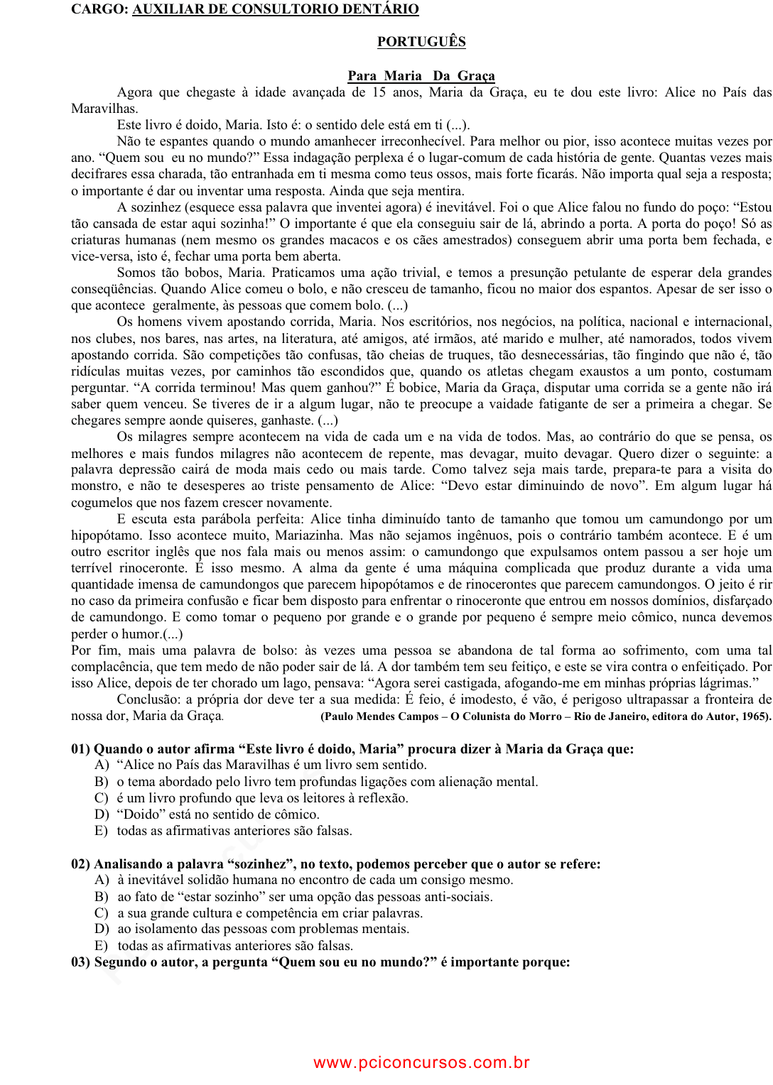 pcimarkpci MDAwMDowMDAwOjAwMDA6MDAwMDowMDAwOmZmZmY6OTU0ZTpiOTcw:VHVlLCAxMSBGZWIgMjAyNSAwNDoxMjo1NiAtMDMwMA== www.pciconcursos.com.br CARGO: AUXILIAR DE CONSULTORIO DENTÁRIO PORTUGUÊS Para Maria Da Graça Agora que chegaste à idade avançada de 15 anos, Maria da Graça, eu te dou este livro: Alice no País das Maravilhas. Este livro é doido, Maria. Isto é: o sentido dele está em ti (...). Não te espantes quando o mundo amanhecer irreconhecível. Para melhor ou pior, isso acontece muitas vezes por ano. “Quem sou eu no mundo?” Essa indagação perplexa é o lugar-comum de cada história de gente. Quantas vezes mais decifrares essa charada, tão entranhada em ti mesma como teus ossos, mais forte ficarás. Não importa qual seja a resposta; o importante é dar ou inventar uma resposta. Ainda que seja mentira. A sozinhez (esquece essa palavra que inventei agora) é inevitável. Foi o que Alice falou no fundo do poço: “Estou tão cansada de estar aqui sozinha!” O importante é que ela conseguiu sair de lá, abrindo a porta. A porta do poço! Só as criaturas humanas (nem mesmo os grandes macacos e os cães amestrados) conseguem abrir uma porta bem fechada, e vice-versa, isto é, fechar uma porta bem aberta. Somos tão bobos, Maria. Praticamos uma ação trivial, e temos a presunção petulante de esperar dela grandes conseqüências. Quando Alice comeu o bolo, e não cresceu de tamanho, ficou no maior dos espantos. Apesar de ser isso o que acontece geralmente, às pessoas que comem bolo. (...) Os homens vivem apostando corrida, Maria. Nos escritórios, nos negócios, na política, nacional e internacional, nos clubes, nos bares, nas artes, na literatura, até amigos, até irmãos, até marido e mulher, até namorados, todos vivem apostando corrida. São competições tão confusas, tão cheias de truques, tão desnecessárias, tão fingindo que não é, tão ridículas muitas vezes, por caminhos tão escondidos que, quando os atletas chegam exaustos a um ponto, costumam perguntar. “A corrida terminou! Mas quem ganhou?” É bobice, Maria da Graça, disputar uma corrida se a gente não irá saber quem venceu. Se tiveres de ir a algum lugar, não te preocupe a vaidade fatigante de ser a primeira a chegar. Se chegares sempre aonde quiseres, ganhaste. (...) Os milagres sempre acontecem na vida de cada um e na vida de todos. Mas, ao contrário do que se pensa, os melhores e mais fundos milagres não acontecem de repente, mas devagar, muito devagar. Quero dizer o seguinte: a palavra depressão cairá de moda mais cedo ou mais tarde. Como talvez seja mais tarde, prepara-te para a visita do monstro, e não te desesperes ao triste pensamento de Alice: “Devo estar diminuindo de novo”. Em algum lugar há cogumelos que nos fazem crescer novamente. E escuta esta parábola perfeita: Alice tinha diminuído tanto de tamanho que tomou um camundongo por um hipopótamo. Isso acontece muito, Mariazinha. Mas não sejamos ingênuos, pois o contrário também acontece. E é um outro escritor inglês que nos fala mais ou menos assim: o camundongo que expulsamos ontem passou a ser hoje um terrível rinoceronte. É isso mesmo. A alma da gente é uma máquina complicada que produz durante a vida uma quantidade imensa de camundongos que parecem hipopótamos e de rinocerontes que parecem camundongos. O jeito é rir no caso da primeira confusão e ficar bem disposto para enfrentar o rinoceronte que entrou em nossos domínios, disfarçado de camundongo. E como tomar o pequeno por grande e o grande por pequeno é sempre meio cômico, nunca devemos perder o humor.(...) Por fim, mais uma palavra de bolso: às vezes uma pessoa se abandona de tal forma ao sofrimento, com uma tal complacência, que tem medo de não poder sair de lá. A dor também tem seu feitiço, e este se vira contra o enfeitiçado. Por isso Alice, depois de ter chorado um lago, pensava: “Agora serei castigada, afogando-me em minhas próprias lágrimas.” Conclusão: a própria dor deve ter a sua medida: É feio, é imodesto, é vão, é perigoso ultrapassar a fronteira de nossa dor, Maria da Graça. (Paulo Mendes Campos – O Colunista do Morro – Rio de Janeiro, editora do Autor, 1965). 01) Quando o autor afirma “Este livro é doido, Maria” procura dizer à Maria da Graça que: A) “Alice no País das Maravilhas é um livro sem sentido. B) o tema abordado pelo livro tem profundas ligações com alienação mental. C) é um livro profundo que leva os leitores à reflexão. D) “Doido” está no sentido de cômico. E) todas as afirmativas anteriores são falsas. 02) Analisando a palavra “sozinhez”, no texto, podemos perceber que o autor se refere: A) à inevitável solidão humana no encontro de cada um consigo mesmo. B) ao fato de “estar sozinho” ser uma opção das pessoas anti-sociais. C) a sua grande cultura e competência em criar palavras. D) ao isolamento das pessoas com problemas mentais. E) todas as afirmativas anteriores são falsas. 03) Segundo o autor, a pergunta “Quem sou eu no mundo?” é importante porque: www.pciconcursos.com.br pcimarkpci MDAwMDowMDAwOjAwMDA6MDAwMDowMDAwOmZmZmY6OTU0ZTpiOTcw:VHVlLCAxMSBGZWIgMjAyNSAwNDoxMjo1NiAtMDMwMA== www.pciconcursos.com.br A) leva-nos a nos conhecer melhor. B) é importante para o ser humano não deixar pergunta sem resposta, mesmo que seja falsa. C) funciona como um treinamento no estilo “estímulo/ resposta.” D) a maioria das pessoas perde a sua identidade quando vive em grupo. E) todas as afirmativas anteriores são falsas. 04) No sexto parágrafo o autor se refere a uma situação costumeira do mundo moderno, que é: A) a prática de corridas e caminhadas por grande parte da população para melhorar a qualidade de vida. B) as competições interpessoais na vida cotidiana. C) o empate verificado na maioria das competições esportivas. D) o sentimento de derrota na maioria dos homens. E) todas as opções anteriores são falsas. 05) No sétimo parágrafo o a