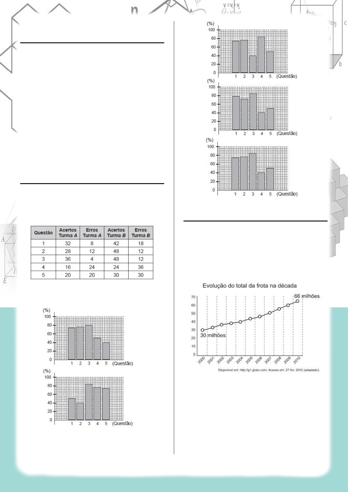 101 E) III e I. Questão 6 (ENEM) Uma companhia de seguros levantou dados sobre os carros de determinada cidade e constatou que são roubados, em média, 150 carros por ano. O número de carros roubados da marca X é o dobro do número de carros roubados da marca Y, e as marcas X e Y juntas respondem por cerca de 60% dos carros roubados. O número esperado de carros roubados da marca Y é A) 20. B) 30. C) 40. D) 50. E) 60. Estatística Questão 1 A tabela a seguir mostra as quantidades de alunos que acertaram e que erraram as 5 questões de uma prova aplicada em duas turmas. Cada questão valia dois pontos. O gráfico que melhor representa o percentual de acerto por questão de todos os alunos é: A) B) C) D) E) Questão 2 Nos últimos anos, a frota de veículos no Brasil tem crescido de forma acentuada. Observando o gráfico, é possível verificar a variação do número de veículos (carros, motocicletas e caminhões), no período de 2000 a 2010. Projeta-se que a taxa de crescimento relativo no período de 2000 a 2010 mantenha-se para década seguinte. Qual será o número de veículos no ano de 2020? A) 79,2 milhões. B) 102,0 milhões. C) 132,0 milhões. D) 138,0 milhões. E) 145,2 milhões.
