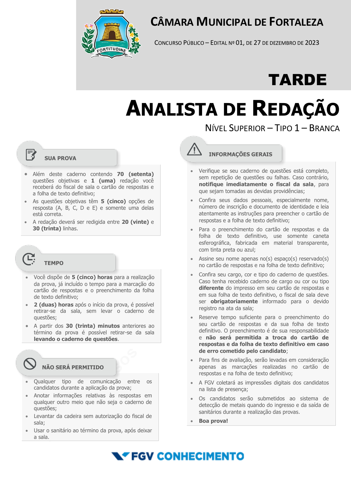 pcimarkpci MDAwMDowMDAwOjAwMDA6MDAwMDowMDAwOmZmZmY6YzkzNzoyZTNl:V2VkLCAxMiBGZWIgMjAyNSAwOTo0MzowMiAtMDMwMA== www.pciconcursos.com.br CÂMARA MUNICIPAL DE FORTALEZA CONCURSO PÚBLICO – EDITAL Nº 01, DE 27 DE DEZEMBRO DE 2023 TARDE ANALISTA DE REDAÇÃO NÍVEL SUPERIOR – TIPO 1 – BRANCA Além deste caderno contendo 70 (setenta) questões objetivas e 1 (uma) redação você receberá do fiscal de sala o cartão de respostas e a folha de texto definitivo; As questões objetivas têm 5 (cinco) opções de resposta (A, B, C, D e E) e somente uma delas está correta. A redação deverá ser redigida entre 20 (vinte) e 30 (trinta) linhas. Você dispõe de 5 (cinco) horas para a realização da prova, já incluído o tempo para a marcação do cartão de respostas e o preenchimento da folha de texto definitivo; 2 (duas) horas após o início da prova, é possível retirar-se da sala, sem levar o caderno de questões; A partir dos 30 (trinta) minutos anteriores ao término da prova é possível retirar-se da sala levando o caderno de questões. Qualquer tipo de comunicação entre os candidatos durante a aplicação da prova; Anotar informações relativas às respostas em qualquer outro meio que não seja o caderno de questões; Levantar da cadeira sem autorização do fiscal de sala; Usar o sanitário ao término da prova, após deixar a sala. Verifique se seu caderno de questões está completo, sem repetição de questões ou falhas. Caso contrário, notifique imediatamente o fiscal da sala, para que sejam tomadas as devidas providências; Confira seus dados pessoais, especialmente nome, número de inscrição e documento de identidade e leia atentamente as instruções para preencher o cartão de respostas e a folha de texto definitivo; Para o preenchimento do cartão de respostas e da folha de texto definitivo, use somente caneta esferográfica, fabricada em material transparente, com tinta preta ou azul; Assine seu nome apenas no(s) espaço(s) reservado(s) no cartão de respostas e na folha de texto definitivo; Confira seu cargo, cor e tipo do caderno de questões. Caso tenha recebido caderno de cargo ou cor ou tipo diferente do impresso em seu cartão de respostas e em sua folha de texto definitivo, o fiscal de sala deve ser obrigatoriamente informado para o devido registro na ata da sala; Reserve tempo suficiente para o preenchimento do seu cartão de respostas e da sua folha de texto definitivo. O preenchimento é de sua responsabilidade e não será permitida a troca do cartão de respostas e da folha de texto definitivo em caso de erro cometido pelo candidato; Para fins de avaliação, serão levadas em consideração apenas as marcações realizadas no cartão de respostas e na folha de texto definitivo; A FGV coletará as impressões digitais dos candidatos na lista de presença; Os candidatos serão submetidos ao sistema de detecção de metais quando do ingresso e da saída de sanitários durante a realização das provas. Boa prova! SUA PROVA TEMPO NÃO SERÁ PERMITIDO INFORMAÇÕES GERAIS pcimarkpci MDAwMDowMDAwOjAwMDA6MDAwMDowMDAwOmZmZmY6YzkzNzoyZTNl:V2VkLCAxMiBGZWIgMjAyNSAwOTo0MzowMiAtMDMwMA== www.pciconcursos.com.br pcimarkpci MDAwMDowMDAwOjAwMDA6MDAwMDowMDAwOmZmZmY6YzkzNzoyZTNl:V2VkLCAxMiBGZWIgMjAyNSAwOTo0MzowMiAtMDMwMA== www.pciconcursos.com.br CÂMARA MUNICIPAL DE FORTALEZA FGV CONHECIMENTO ANALISTA DE REDAÇÃO – TARDE TIPO BRANCA – PÁGINA 3 CONHECIMENTOS GERAIS Língua Portuguesa 1 Uma carta (traduzida) de Van Gogh a seu irmão Théo, diz o seguinte: A respeito do Meerestille de Heine, que eu tinha copiado no teu caderno, não é? Há algum tempo atrás eu vi um quadro de Thijs Maris que me fez pensar nele. Uma velha cidade da Holanda, com fileiras de casas num castanho avermelhado com oitões em escadinha e patamares nas portas, telhados cinzas, e portas brancas ou amarelas, vãos e cornijas, canais com barcos e uma grande ponte levadiça branca sob a qual se encontra uma chata com um homem ao leme, a casinha do guarda da ponte que se vê pela janela sentado em sua pequena escrivaninha. Um pouco mais longe no canal, uma ponte de pedra sobre a qual passam pessoas e uma charrete com cavalos brancos. É movimento por toda parte; um homem com um carrinho de mão, um outro apoiado no parapeito, olhando para a água, mulheres de preto com toucas brancas. No primeiro plano, um cais com lajotas e um parapeito preto. Assinale a afirmação correta sobre esse fragmento textual. (A) Trata-se de texto basicamente descritivo, com exceção do penúltimo parágrafo, de tipo narrativo. (B) Há possíveis problemas na tradução do texto, como a ambiguidade no emprego de “nele”, no primeiro parágrafo. (C) Ocorre nítida incoerência no segmento “portas brancas ou amarelas”, no segundo parágrafo. (D) Há emprego indevido da preposição “sob” em lugar de “sobre” no segundo parágrafo. (E) A expressão “Um pouco mais longe no canal”, no terceiro parágrafo, mostra ilogicidade, pois um quadro, sendo um plano, não tem profundidade. 2 Observe a seguinte reflexão: A abelha vive fazendo cera. Sempre. E com tudo isto acontecendo, como é que a abelha consegue ser a imagem do labor incessante? Sobre a estrutura e a composição desse pensamento, assinale a afirmativa inadequada. (A) O advérbio “Sempre” é redundante, pois o verbo “viver” já indica uma ação interminável. (B) A expressão “fazendo cera” aparece nesse pensamento com duplo sentido. (C) O segmento “tudo isto” traz a ideia de uma grande quantidade de ações, sentido adequado ao contexto. (D) A forma do pronome demonstrativo “isto” deveria ser substituída por “isso”, por referir-se a um termo anterior. (E) A expressão “é que” é empregada enfaticamente, sem ligações sintáticas com os outros termos. 3 Um escritor americano deu a seguinte opinião sobre os aborígenes, ou seja, os primitivos habitantes de um país: Gente de valor escasso que atravanca o solo de u
