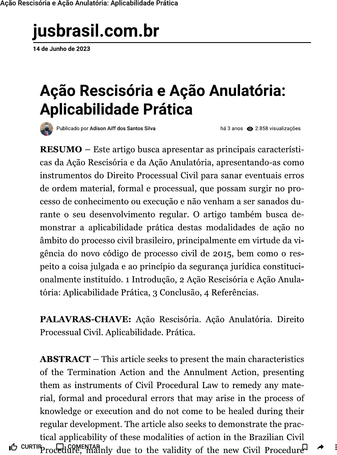 Ação Rescisória e Ação Anulatória: Aplicabilidade Prática jusbrasil.com.br 14 de Junho de 2023 Ação Rescisória e Ação Anulatória: Aplicabilidade Prática Publicado por Adison Aiff dos Santos Silva há 3 anos 2.858 visualizações RESUMO - Este artigo busca apresentar as principais característi- cas da Ação Rescisória e da Ação Anulatória, apresentando-as como instrumentos do Direito Processual Civil para sanar eventuais erros de ordem material, formal e processual, que possam surgir no pro- cesso de conhecimento ou execução e não venham a ser sanados du- rante o seu desenvolvimento regular. O artigo também busca de- monstrar a aplicabilidade prática destas modalidades de ação no âmbito do processo civil brasileiro, principalmente em virtude da vi- gência do novo código de processo civil de 2015, bem como o res- peito a coisa julgada e ao princípio da segurança jurídica constituci- onalmente instituído. 1 Introdução, 2 Ação Rescisória e Ação Anula- tória: Aplicabilidade Prática, 3 Conclusão, 4 Referências. PALAVRAS-CHAVE: Ação Rescisória. Ação Anulatória. Direito Processual Civil. Aplicabilidade. Prática. ABSTRACT - This article seeks to present the main characteristics of the Termination Action and the Annulment Action, presenting them as instruments of Civil Procedural Law to remedy any mate- rial, formal and procedural errors that may arise in the process of knowledge or execution and do not come to be healed during their regular development. The article also seeks to demonstrate the prac- tical applicability of these modalities of action in the Brazilian Civil CURTIR Procedure, COMENTAR mainly due to the validity of the new Civil ProcedureCode of 2015, as well as respect for res judicata and the principle of Ação Rescisória e Ação Anulatória: Aplicabilidade Prática constitutionally established legal certainty. 1 Introduction, 2 Action Rescessory And Action Anulatory: Practical Applicability, 3 Conclu- sion, 4 References. KEY WORDS: Termination. Related searches. civil procedural law. Applicability. Practice. Introdução O direito processual civil é um ramo do direito público que visa con- duzir os processos civis a sua devida solução por intermédio do uso da jurisdição que é imanente a natureza soberana do Estado. Desta forma, o Direito Processual Civil Brasileiro é dotado de um conjunto de princípios e normas que objetivam a efetividade das leis materi- ais, tendo o objetivo de instrumentalizar o Direito Civil e os demais ramos do direito civilista e subsidiariamente a outros segmentos processuais, para a sua devida aplicação prática, mas com o advento do Novo Código de Processo Civil de 2015, inúmeras duvidas surgi- ram em face do novo diploma legal e a sua efetivação, dada a vivaci- dade do direito e suas ciências que crescem e se desenvolvem junta- mente com a sociedade, variadas construções jurídicas vieram se formalizando diante dos casos concretos que iam se apresentando aos julgadores, suscitando novas dúvidas e questionamentos entre os operadores do direito, bem como entre os teóricos processualis- tas do direito civil. A coisa julgada é um dos elementos mais importantes do direito, pois é parte integrante do princípio da segurança jurídica, que é in- dispensável para a manutenção de qualquer sistema jurídico, onde a imutabilidade das decisões judiciais garantem a estabilidade do sis- tema e a pacificação social garantindo o direito como meio de satis- fação racional, civilizada e democrática dos interesses tanto particu- lares quanto públicos dos indivíduos integrantes da nação.Todavia, em nosso ordenamento jurídico inexiste a figura de um di- Ação Rescisória e Ação Anulatória: Aplicabilidade Prática reito ou princípio absoluto, eles apenas se autobalanceiam propici- ando o equilíbrio do jurídico do sistema, conforme pontuou Robert Alexy em sua Teoria dos Direitos Fundamentais, havendo a colisão entre eles tendo mesmo valor jurídico compete ao julgador fazer a relativização e ao sopesar a situação no caso concreto decidir qual deve ser aplicado no dado momento em análise. Todavia, quando ocorrem erros nas decisões, e tais equívocos ape- nas são descobertos após o trânsito em julgado ou quando determi- nado ato processual é concluído, como solucionar tal problema, haja vista que o trânsito em julgado confere a característica de imutabili- dade e indiscutibilidade da causa conferida pelo princípio da segu- rança jurídica, neste sentido surgem as Ações Rescisórias e Anulató- rias como mecanismos processuais para sanar tais problemáticas. Agora passa-se a tratar de forma mais minuciosa a discorrer sobre o tema. 1. Ação Rescisória e Ação Anulatória: Aplicabilidade Prática A estrutura orgânica do direito brasileiro prima pela manutenção da justiça e todos os efeitos decorrentes de sua aplicação no mundo dos fatos, este pensamento decorre do princípio constitucional da segu- rança jurídica, que se desenha no art. 5°, inciso "XXXVI" da nossa Carta Magna, in verbis: TÍTULO II DOS DIREITOS E GARANTIAS FUNDAMENTAIS CAPÍTULO I DOS DIREITOS E DEVERES INDIVIDUAIS E COLETIVOSArt. Todos são iguais perante a lei, sem distinção de Ação Rescisória e Ação Anulatória: Aplicabilidade qualquer natureza, garantindo-se aos brasileiros e aos es- trangeiros residentes no País a inviolabilidade do direito à vida, à liberdade, à igualdade, à segurança e à proprie- dade, nos termos seguintes: [...] XXXVI - a lei não prejudicará direito adquirido, ato jurídico perfeito e a coisa julgada; (BRASIL, Constituição da Republica Federativa do Brasil de 1988). Todavia, mesmo com toda a estrutura disponível nem sempre a jus- tiça é feita de forma "correta", como o sistema judiciário é operado por seres humanos que são falhos por natureza há de se imaginar que ocorram durante processo de construção ou obten- ção da justiça, em "