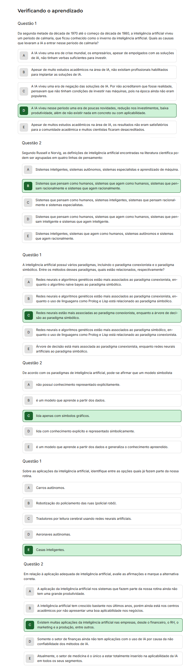 Verificando aprendizado Questão 1 Da segunda metade da década de 1970 até começo da década de 1980, a inteligência artificial viveu um de calmaria, que ficou conhecido como inverno da inteligência artificial. Quais as causas que levaram IA a entrar nesse periodo de calmaria? A IA viveu uma era de crise mundial, os empresários, apesar de empolgados com as soluções de IA, não tinham verbas suficientes para Apesar de muito estudos na área de IA, não existiam profissionais habilitados B para implantar as soluções de IA. A IA viveu uma era de negação das soluções de IA. Por não acreditarem que fosse realidade, pensavam que não tinham condições de investir nas máquinas, pois na época ainda não eram populares. A IA viveu nesse periodo uma era de poucas novidades, redução nos investimentos, baixa D produtividade, além de não existir nada em concreto ou com aplicabilidade. E Apesar de muitos estudos na área de IA, os resultados não eram satisfatórios para a comunidade acadêmica e muitos cientistas ficaram desacreditados. Questão 2 Segundo Russell Norvig, as definições de inteligência artificial encontradas na literatura cientifica po- dem ser agrupadas em quatro linhas de pensamento: A Sistemas inteligentes, sistemas sistemas especialistas e aprendizado de Sistemas que pensam como humanos, sistemas que agem como humanos, sistemas que pen- sam racionalmente e sistemas que agem C Sistemas que pensam como humanos, sistemas inteligentes, sistemas que pensam racional- mente sistemas especialistas. Sistemas que pensam como humanos, sistemas que agem como humanos, sistemas que pen- D sam inteligente e sistemas que agem inteligente. Sistemas inteligentes, sistemas que agem como humanos, sistemas autônomos e sistemas E que agem racionalmente. Questão 1 A inteligência artificial possui vários paradigmas, incluindo paradigma conexionista e paradigma Entre os métodos desses paradigmas, quais estão relacionados, respectivamente? A Redes neurais algoritmos genéticos estão mais associados ao paradigma conexionista, en- quanto algoritmo naive bayes ao paradigma B Redes neurais algoritmos genéticos estão mais associados ao paradigma conexionista, en- quanto uso de linguagens como Prolog Lisp está relacionado ao paradigma Redes neurais estão mais associadas ao paradigma conexionista, enquanto de deci- C são ao paradigma simbolico. D Redes neurais algoritmos genéticos estão mais associados ao paradigma en- quanto uso de linguagens como Prolog Lisp está relacionado ao paradigma E Arvore de decisão está mais associada ao paradigma conexionista, enquanto redes neurais artificiais ao paradigma Questão 2 De acordo com os paradigmas de inteligência artificial, pode-se afirmar que um modelo simbolista não possui conhecimento representado explicitamente. B é um modelo que aprende partir dos C lida apenas com simbolos gráficos. D lida com conhecimento explicito e representado simbolicamente. E é um modelo que aprende partir dos dados e generaliza conhecimento apreendido. Questão 1 Sobre as aplicações da inteligência artificial, identifique entre as opções quais já fazem parte da nossa rotina. A Carros B Robotização do policiamento das ruas (policial robô). Tradutores por leitura cerebral usando redes neurais artificiais. D Aeronaves E Casas inteligentes. Questão 2 Em relação à aplicação adequada de inteligência artificial, avalie as afirmações e marque a alternativa correta. A aplicação da inteligência artificial nos sistemas que fazem parte da nossa rotina ainda não A tem uma grande produtividade. A inteligência artificial tem crescido bastante nos últimos anos, porém ainda está nos centros B acadêmicos por não apresentar uma boa aplicabilidade nos negócios. C Existem muitas aplicações da inteligência artificial nas empresas, desde o financeiro, RH, marketing entre outros. Somente setor de finanças ainda não tem aplicações com uso de IA por causa da não D confiabilidade dos métodos de IA. Atualmente, setor de medicina é estar totalmente inserido na aplicabilidade da IA E em todos os seus segmentos.