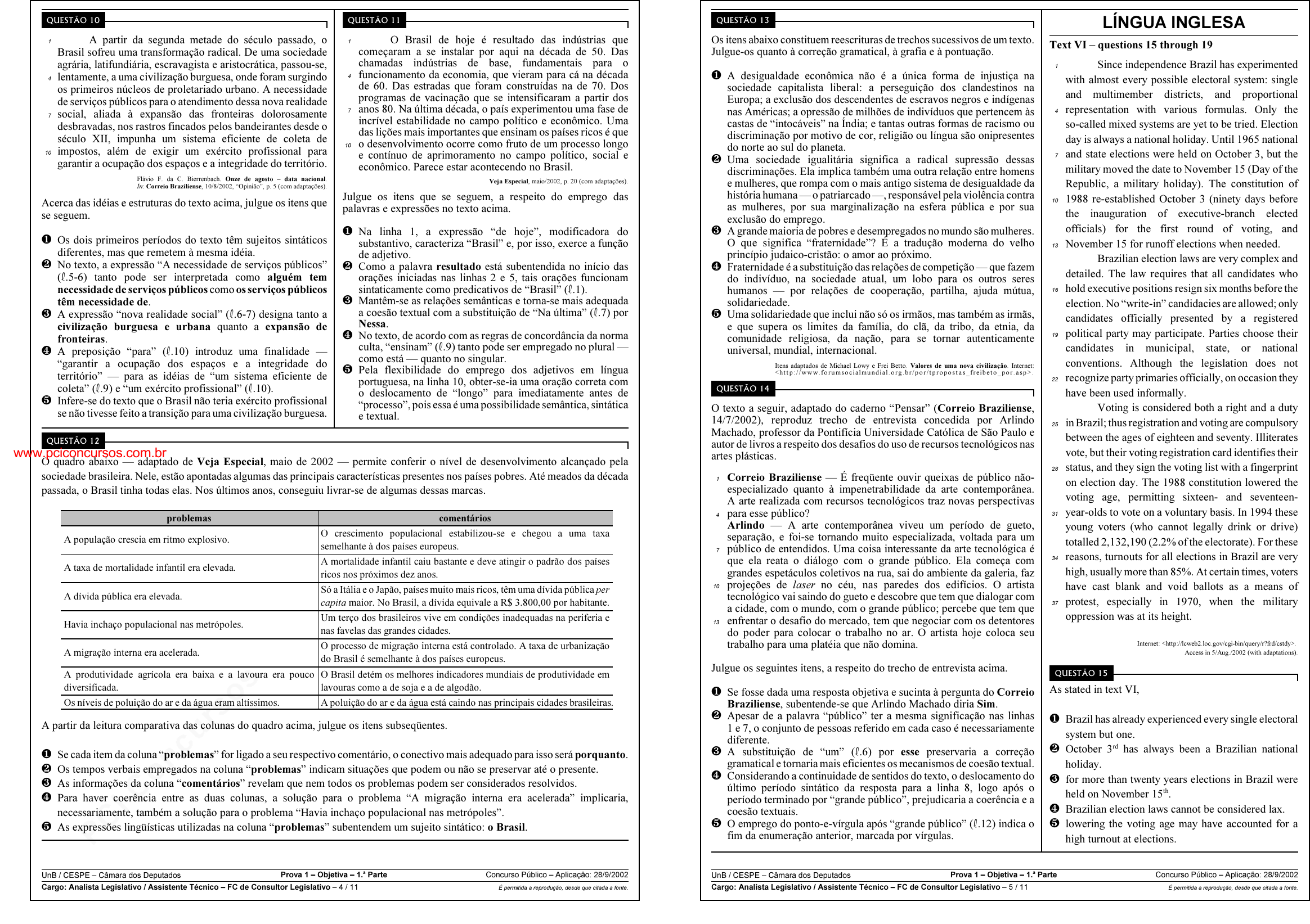 pcimarkpci MDAwMDowMDAwOjAwMDA6MDAwMDowMDAwOmZmZmY6YmZiOTphZTFk:V2VkLCAxMiBGZWIgMjAyNSAxNDoxODo1NiAtMDMwMA== www.pciconcursos.com.br UnB / CESPE – Câmara dos Deputados Prova 1 – Objetiva – 1.a Parte Concurso Público – Aplicação: 28/9/2002 Cargo: Analista Legislativo / Assistente Técnico – FC de Consultor Legislativo – 4 / 11 É permitida a reprodução, desde que citada a fonte. QUESTÃO 10 A partir da segunda metade do século passado, o1 Brasil sofreu uma transformação radical. De uma sociedade agrária, latifundiária, escravagista e aristocrática, passou-se, lentamente, a uma civilização burguesa, onde foram surgindo4 os primeiros núcleos de proletariado urbano. A necessidade de serviços públicos para o atendimento dessa nova realidade social, aliada à expansão das fronteiras dolorosamente7 desbravadas, nos rastros fincados pelos bandeirantes desde o século XII, impunha um sistema eficiente de coleta de impostos, além de exigir um exército profissional para10 garantir a ocupação dos espaços e a integridade do território. Flávio F. da C. Bierrenbach. Onze de agosto – data nacional. In: Correio Braziliense, 10/8/2002, “Opinião”, p. 5 (com adaptações). Acerca das idéias e estruturas do texto acima, julgue os itens que se seguem. Ø Os dois primeiros períodos do texto têm sujeitos sintáticos diferentes, mas que remetem à mesma idéia. Ù No texto, a expressão “A necessidade de serviços públicos” (R.5-6) tanto pode ser interpretada como alguém tem necessidade de serviços públicos como os serviços públicos têm necessidade de. Ú A expressão “nova realidade social” (R.6-7) designa tanto a civilização burguesa e urbana quanto a expansão de fronteiras. Û A preposição “para” (R.10) introduz uma finalidade — “garantir a ocupação dos espaços e a integridade do território” — para as idéias de “um sistema eficiente de coleta” (R.9) e “um exército profissional” (R.10). Ü Infere-se do texto que o Brasil não teria exército profissional se não tivesse feito a transição para uma civilização burguesa. QUESTÃO 11 O Brasil de hoje é resultado das indústrias que1 começaram a se instalar por aqui na década de 50. Das chamadas indústrias de base, fundamentais para o funcionamento da economia, que vieram para cá na década4 de 60. Das estradas que foram construídas na de 70. Dos programas de vacinação que se intensificaram a partir dos anos 80. Na última década, o país experimentou uma fase de7 incrível estabilidade no campo político e econômico. Uma das lições mais importantes que ensinam os países ricos é que o desenvolvimento ocorre como fruto de um processo longo10 e contínuo de aprimoramento no campo político, social e econômico. Parece estar acontecendo no Brasil. Veja Especial, maio/2002, p. 20 (com adaptações). Julgue os itens que se seguem, a respeito do emprego das palavras e expressões no texto acima. Ø Na linha 1, a expressão “de hoje”, modificadora do substantivo, caracteriza “Brasil” e, por isso, exerce a função de adjetivo. Ù Como a palavra resultado está subentendida no início das orações iniciadas nas linhas 2 e 5, tais orações funcionam sintaticamente como predicativos de “Brasil” (R.1). Ú Mantêm-se as relações semânticas e torna-se mais adequada a coesão textual com a substituição de “Na última” (R.7) por Nessa. Û No texto, de acordo com as regras de concordância da norma culta, “ensinam” (R.9) tanto pode ser empregado no plural — como está — quanto no singular. Ü Pela flexibilidade do emprego dos adjetivos em língua portuguesa, na linha 10, obter-se-ia uma oração correta com o deslocamento de “longo” para imediatamente antes de “processo”, pois essa é uma possibilidade semântica, sintática e textual. QUESTÃO 12 O quadro abaixo — adaptado de Veja Especial, maio de 2002 — permite conferir o nível de desenvolvimento alcançado pela sociedade brasileira. Nele, estão apontadas algumas das principais características presentes nos países pobres. Até meados da década passada, o Brasil tinha todas elas. Nos últimos anos, conseguiu livrar-se de algumas dessas marcas. problemas comentários A população crescia em ritmo explosivo. O crescimento populacional estabilizou-se e chegou a uma taxa semelhante à dos países europeus. A taxa de mortalidade infantil era elevada. A mortalidade infantil caiu bastante e deve atingir o padrão dos países ricos nos próximos dez anos. A dívida pública era elevada. Só a Itália e o Japão, países muito mais ricos, têm uma dívida pública per capita maior. No Brasil, a dívida equivale a R$ 3.800,00 por habitante. Havia inchaço populacional nas metrópoles. Um terço dos brasileiros vive em condições inadequadas na periferia e nas favelas das grandes cidades. A migração interna era acelerada. O processo de migração interna está controlado. A taxa de urbanização do Brasil é semelhante à dos países europeus. A produtividade agrícola era baixa e a lavoura era pouco diversificada. O Brasil detém os melhores indicadores mundiais de produtividade em lavouras como a de soja e a de algodão. Os níveis de poluição do ar e da água eram altíssimos. A poluição do ar e da água está caindo nas principais cidades brasileiras. A partir da leitura comparativa das colunas do quadro acima, julgue os itens subseqüentes. Ø Se cada item da coluna “problemas” for ligado a seu respectivo comentário, o conectivo mais adequado para isso será porquanto. Ù Os tempos verbais empregados na coluna “problemas” indicam situações que podem ou não se preservar até o presente. Ú As informações da coluna “comentários” revelam que nem todos os problemas podem ser considerados resolvidos. Û Para haver coerência entre as duas colunas, a solução para o problema “A migração interna era acelerada” implicaria, necessariamente, também a sol