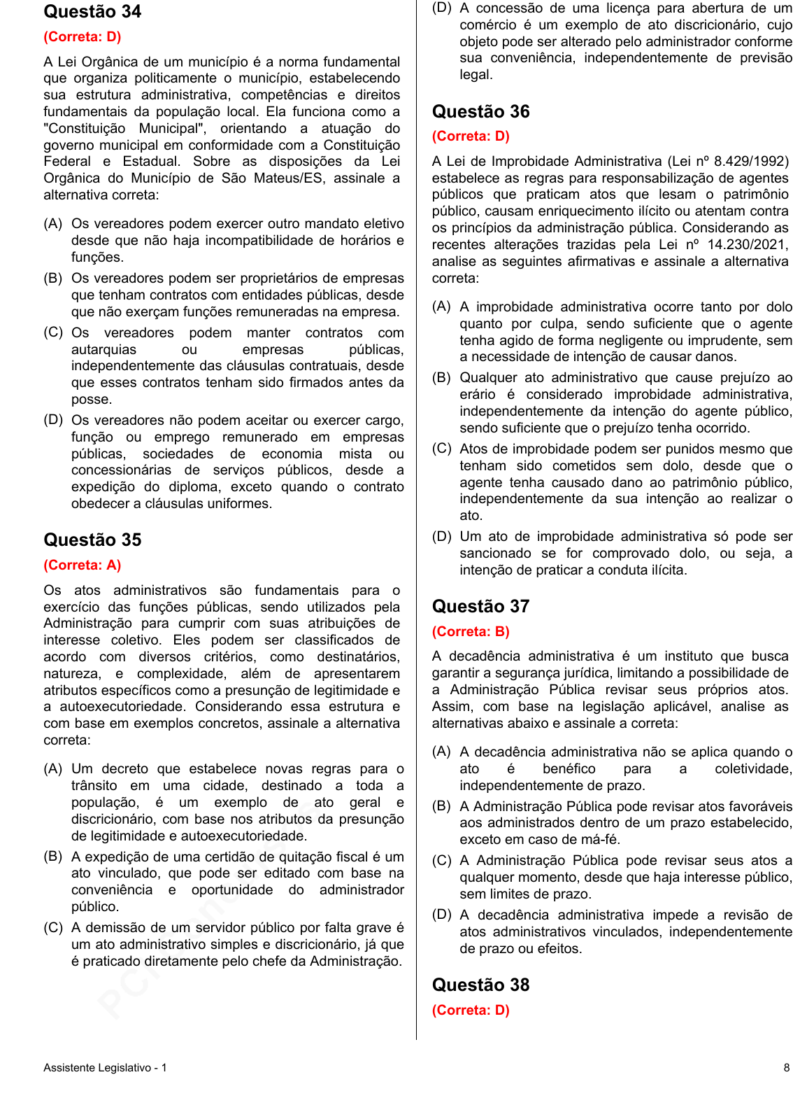 pcimarkpci MDAwMDowMDAwOjAwMDA6MDAwMDowMDAwOmZmZmY6YmZiOTphZTFk:V2VkLCAxMiBGZWIgMjAyNSAxNDoyODozNyAtMDMwMA== www.pciconcursos.com.br Questão 34 (Correta: D) A Lei Orgânica de um município é a norma fundamental que organiza politicamente o município, estabelecendo sua estrutura administrativa, competências e direitos fundamentais da população local. Ela funciona como a "Constituição Municipal", orientando a atuação do governo municipal em conformidade com a Constituição Federal e Estadual. Sobre as disposições da Lei Orgânica do Município de São Mateus/ES, assinale a alternativa correta: (A) Os vereadores podem exercer outro mandato eletivo desde que não haja incompatibilidade de horários e funções. (B) Os vereadores podem ser proprietários de empresas que tenham contratos com entidades públicas, desde que não exerçam funções remuneradas na empresa. (C) Os vereadores podem manter contratos com autarquias ou empresas públicas, independentemente das cláusulas contratuais, desde que esses contratos tenham sido firmados antes da posse. (D) Os vereadores não podem aceitar ou exercer cargo, função ou emprego remunerado em empresas públicas, sociedades de economia mista ou concessionárias de serviços públicos, desde a expedição do diploma, exceto quando o contrato obedecer a cláusulas uniformes. Questão 35 (Correta: A) Os atos administrativos são fundamentais para o exercício das funções públicas, sendo utilizados pela Administração para cumprir com suas atribuições de interesse coletivo. Eles podem ser classificados de acordo com diversos critérios, como destinatários, natureza, e complexidade, além de apresentarem atributos específicos como a presunção de legitimidade e a autoexecutoriedade. Considerando essa estrutura e com base em exemplos concretos, assinale a alternativa correta: (A) Um decreto que estabelece novas regras para o trânsito em uma cidade, destinado a toda a população, é um exemplo de ato geral e discricionário, com base nos atributos da presunção de legitimidade e autoexecutoriedade. (B) A expedição de uma certidão de quitação fiscal é um ato vinculado, que pode ser editado com base na conveniência e oportunidade do administrador público. (C) A demissão de um servidor público por falta grave é um ato administrativo simples e discricionário, já que é praticado diretamente pelo chefe da Administração. (D) A concessão de uma licença para abertura de um comércio é um exemplo de ato discricionário, cujo objeto pode ser alterado pelo administrador conforme sua conveniência, independentemente de previsão legal. Questão 36 (Correta: D) A Lei de Improbidade Administrativa (Lei nº 8.429/1992) estabelece as regras para responsabilização de agentes públicos que praticam atos que lesam o patrimônio público, causam enriquecimento ilícito ou atentam contra os princípios da administração pública. Considerando as recentes alterações trazidas pela Lei nº 14.230/2021, analise as seguintes afirmativas e assinale a alternativa correta: (A) A improbidade administrativa ocorre tanto por dolo quanto por culpa, sendo suficiente que o agente tenha agido de forma negligente ou imprudente, sem a necessidade de intenção de causar danos. (B) Qualquer ato administrativo que cause prejuízo ao erário é considerado improbidade administrativa, independentemente da intenção do agente público, sendo suficiente que o prejuízo tenha ocorrido. (C) Atos de improbidade podem ser punidos mesmo que tenham sido cometidos sem dolo, desde que o agente tenha causado dano ao patrimônio público, independentemente da sua intenção ao realizar o ato. (D) Um ato de improbidade administrativa só pode ser sancionado se for comprovado dolo, ou seja, a intenção de praticar a conduta ilícita. Questão 37 (Correta: B) A decadência administrativa é um instituto que busca garantir a segurança jurídica, limitando a possibilidade de a Administração Pública revisar seus próprios atos. Assim, com base na legislação aplicável, analise as alternativas abaixo e assinale a correta: (A) A decadência administrativa não se aplica quando o ato é benéfico para a coletividade, independentemente de prazo. (B) A Administração Pública pode revisar atos favoráveis aos administrados dentro de umprazo estabelecido, exceto em caso de má-fé. (C) A Administração Pública pode revisar seus atos a qualquer momento, desde que haja interesse público, sem limites de prazo. (D) A decadência administrativa impede a revisão de atos administrativos vinculados, independentemente de prazo ou efeitos. Questão 38 (Correta: D) Assistente Legislativo - 1 8 pcimarkpci MDAwMDowMDAwOjAwMDA6MDAwMDowMDAwOmZmZmY6YmZiOTphZTFk:V2VkLCAxMiBGZWIgMjAyNSAxNDoyODozNyAtMDMwMA== www.pciconcursos.com.br A extinção de atos administrativos pode ocorrer de diferentes maneiras, como a cassação, anulação, revogação e convalidação, dependendo da legalidade, conveniência e validade do ato praticado pela Administração Pública. Com base em exemplos concretos, avalie as proposições a seguir: I.Um contrato administrativo assinado por uma autoridade incompetente, mas que não causa prejuízo a terceiros nem ao interesse público, pode ser convalidado pela autoridade competente para corrigir o vício. II.A autorização para funcionamento de um comércio em área pública pode ser revogada se o titular não cumprir com as condições estabelecidas, como o pagamento de taxas, sem necessidade de observar os direitos adquiridos. III.Um alvará de funcionamento emitido de forma ilegal por um órgão público pode ser anulado, desfazendo todos os efeitos do ato desde o seu início. Assinale a alternativa correta: (A) Apenas a proposição II está correta. (B) Apenas as proposições II e III estão corretas. (C) Apenas a proposição III está correta. (D) Apenas as proposições I e III estão corretas. Questão 39 (Correta: D) A Administração P