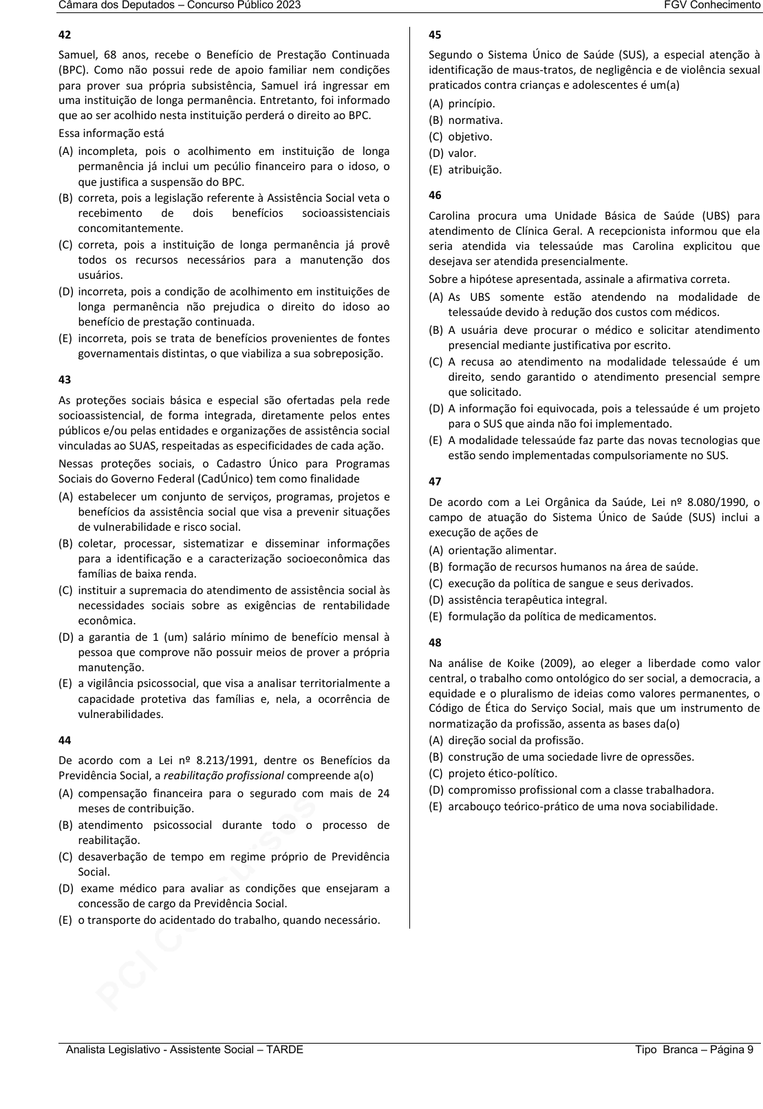 pcimarkpci MDAwMDowMDAwOjAwMDA6MDAwMDowMDAwOmZmZmY6YmZiOTphZTFk:V2VkLCAxMiBGZWIgMjAyNSAxNDoxODozNSAtMDMwMA== www.pciconcursos.com.br Câmara dos Deputados – Concurso Público 2023 FGV Conhecimento Analista Legislativo - Assistente Social – TARDE Tipo Branca – Página 9 42 Samuel, 68 anos, recebe o Benefício de Prestação Continuada (BPC). Como não possui rede de apoio familiar nem condições para prover sua própria subsistência, Samuel irá ingressar em uma instituição de longa permanência. Entretanto, foi informado que ao ser acolhido nesta instituição perderá o direito ao BPC. Essa informação está (A) incompleta, pois o acolhimento em instituição de longa permanência já inclui um pecúlio financeiro para o idoso, o que justifica a suspensão do BPC. (B) correta, pois a legislação referente à Assistência Social veta o recebimento de dois benefícios socioassistenciais concomitantemente. (C) correta, pois a instituição de longa permanência já provê todos os recursos necessários para a manutenção dos usuários. (D) incorreta, pois a condição de acolhimento em instituições de longa permanência não prejudica o direito do idoso ao benefício de prestação continuada. (E) incorreta, pois se trata de benefícios provenientes de fontes governamentais distintas, o que viabiliza a sua sobreposição. 43 As proteções sociais básica e especial são ofertadas pela rede socioassistencial, de forma integrada, diretamente pelos entes públicos e/ou pelas entidades e organizações de assistência social vinculadas ao SUAS, respeitadas as especificidades de cada ação. Nessas proteções sociais, o Cadastro Único para Programas Sociais do Governo Federal (CadÚnico) tem como finalidade (A) estabelecer um conjunto de serviços, programas, projetos e benefícios da assistência social que visa a prevenir situações de vulnerabilidade e risco social. (B) coletar, processar, sistematizar e disseminar informações para a identificação e a caracterização socioeconômica das famílias de baixa renda. (C) instituir a supremacia do atendimento de assistência social às necessidades sociais sobre as exigências de rentabilidade econômica. (D) a garantia de 1 (um) salário mínimo de benefício mensal à pessoa que comprove não possuir meios de prover a própria manutenção. (E) a vigilância psicossocial, que visa a analisar territorialmente a capacidade protetiva das famílias e, nela, a ocorrência de vulnerabilidades. 44 De acordo com a Lei nº 8.213/1991, dentre os Benefícios da Previdência Social, a reabilitação profissional compreende a(o) (A) compensação financeira para o segurado com mais de 24 meses de contribuição. (B) atendimento psicossocial durante todo o processo de reabilitação. (C) desaverbação de tempo em regime próprio de Previdência Social. (D) exame médico para avaliar as condições que ensejaram a concessão de cargo da Previdência Social. (E) o transporte do acidentado do trabalho, quando necessário. 45 Segundo o Sistema Único de Saúde (SUS), a especial atenção à identificação de maus-tratos, de negligência e de violência sexual praticados contra crianças e adolescentes é um(a) (A) princípio. (B) normativa. (C) objetivo. (D) valor. (E) atribuição. 46 Carolina procura uma Unidade Básica de Saúde (UBS) para atendimento de Clínica Geral. A recepcionista informou que ela seria atendida via telessaúde mas Carolina explicitou que desejava ser atendida presencialmente. Sobre a hipótese apresentada, assinale a afirmativa correta. (A) As UBS somente estão atendendo na modalidade de telessaúde devido à redução dos custos com médicos. (B) A usuária deve procurar o médico e solicitar atendimento presencial mediante justificativa por escrito. (C) A recusa ao atendimento na modalidade telessaúde é um direito, sendo garantido o atendimento presencial sempre que solicitado. (D) A informação foi equivocada, pois a telessaúde é um projeto para o SUS que ainda não foi implementado. (E) A modalidade telessaúde faz parte das novas tecnologias que estão sendo implementadas compulsoriamente no SUS. 47 De acordo com a Lei Orgânica da Saúde, Lei nº 8.080/1990, o campo de atuação do Sistema Único de Saúde (SUS) inclui a execução de ações de (A) orientação alimentar. (B) formação de recursos humanos na área de saúde. (C) execução da política de sangue e seus derivados. (D) assistência terapêutica integral. (E) formulação da política de medicamentos. 48 Na análise de Koike (2009), ao eleger a liberdade como valor central, o trabalho como ontológico do ser social, a democracia, a equidade e o pluralismo de ideias como valores permanentes, o Código de Ética do Serviço Social, mais que um instrumento de normatização da profissão, assenta as bases da(o) (A) direção social da profissão. (B) construção de uma sociedade livre de opressões. (C) projeto ético-político. (D) compromisso profissional com a classe trabalhadora. (E) arcabouço teórico-prático de uma nova sociabilidade. pcimarkpci MDAwMDowMDAwOjAwMDA6MDAwMDowMDAwOmZmZmY6YmZiOTphZTFk:V2VkLCAxMiBGZWIgMjAyNSAxNDoxODozNSAtMDMwMA== www.pciconcursos.com.br Câmara dos Deputados – Concurso Público 2023 FGV Conhecimento Analista Legislativo - Assistente Social – TARDE Tipo Branca – Página 10 49 O cumprimento de exigências éticas na pesquisa em Serviço Social não é exatamente recente. O Código de Ética Profissional estabelece como direito do assistente social (A) realizar pesquisas que subsidiem a formulação de políticas, projetos de intervenção e ações profissionais em prol da classe trabalhadora. (B) realizar seus estudos e pesquisas com liberdade, resguardados os direitos de participação de indivíduos ou grupos envolvidos em seus trabalhos. (C) planejar, executar e avaliar pesquisas que possam contribuir para a análise da realidade social e para subsidiar ações profissionais. (D) investigar a