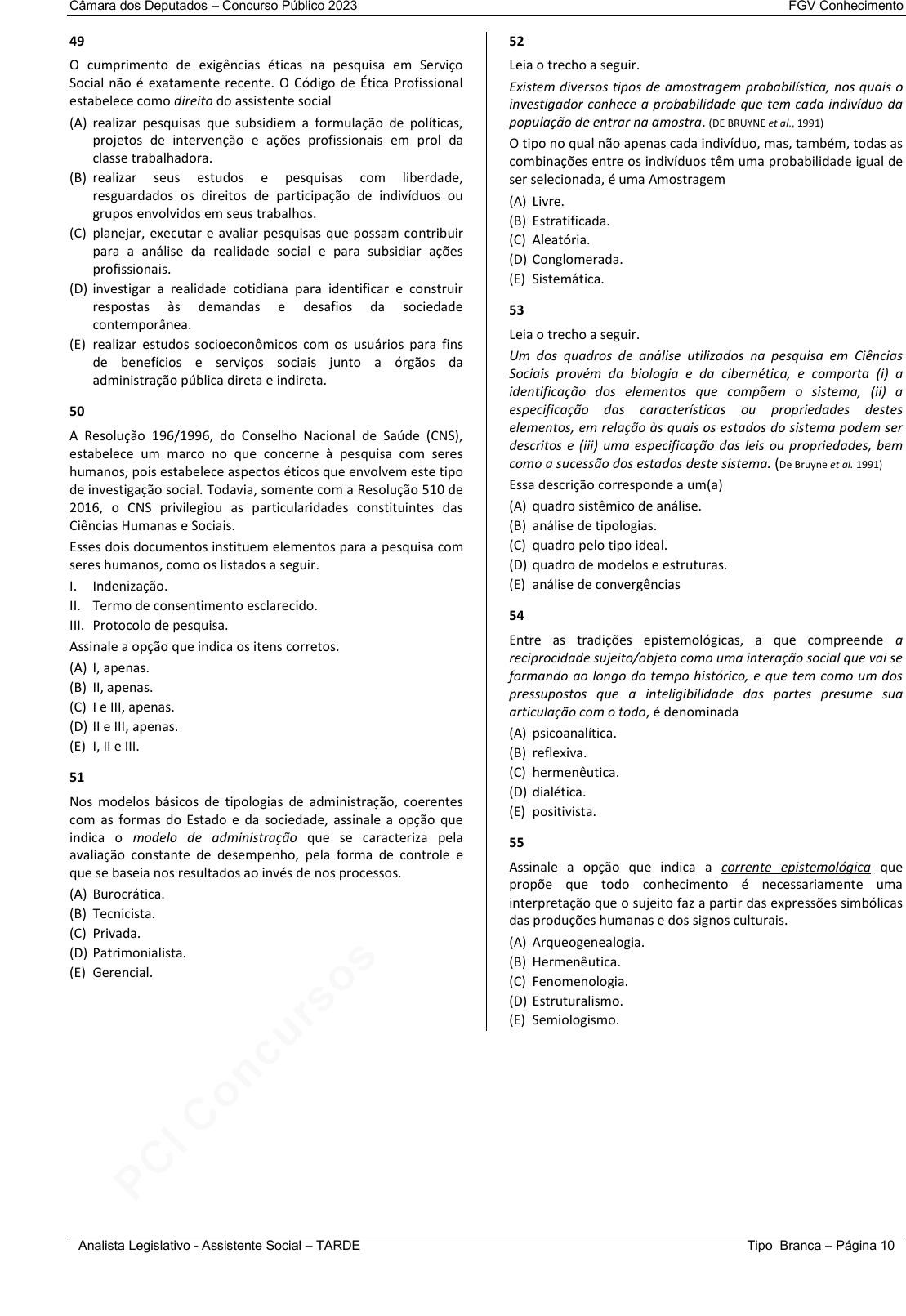 pcimarkpci MDAwMDowMDAwOjAwMDA6MDAwMDowMDAwOmZmZmY6YmZiOTphZTFk:V2VkLCAxMiBGZWIgMjAyNSAxNDoxOTowOSAtMDMwMA== www.pciconcursos.com.br Câmara dos Deputados – Concurso Público 2023 FGV Conhecimento Analista Legislativo - Assistente Social – TARDE Tipo Branca – Página 10 49 O cumprimento de exigências éticas na pesquisa em Serviço Social não é exatamente recente. O Código de Ética Profissional estabelece como direito do assistente social (A) realizar pesquisas que subsidiem a formulação de políticas, projetos de intervenção e ações profissionais em prol da classe trabalhadora. (B) realizar seus estudos e pesquisas com liberdade, resguardados os direitos de participação de indivíduos ou grupos envolvidos em seus trabalhos. (C) planejar, executar e avaliar pesquisas que possam contribuir para a análise da realidade social e para subsidiar ações profissionais. (D) investigar a realidade cotidiana para identificar e construir respostas às demandas e desafios da sociedade contemporânea. (E) realizar estudos socioeconômicos com os usuários para fins de benefícios e serviços sociais junto a órgãos da administração pública direta e indireta. 50 A Resolução 196/1996, do Conselho Nacional de Saúde (CNS), estabelece um marco no que concerne à pesquisa com seres humanos, pois estabelece aspectos éticos que envolvem este tipo de investigação social. Todavia, somente com a Resolução 510 de 2016, o CNS privilegiou as particularidades constituintes das Ciências Humanas e Sociais. Esses dois documentos instituem elementos para a pesquisa com seres humanos, como os listados a seguir. I. Indenização. II. Termo de consentimento esclarecido. III. Protocolo de pesquisa. Assinale a opção que indica os itens corretos. (A) I, apenas. (B) II, apenas. (C) I e III, apenas. (D) II e III, apenas. (E) I, II e III. 51 Nos modelos básicos de tipologias de administração, coerentes com as formas do Estado e da sociedade, assinale a opção que indica o modelo de administração que se caracteriza pela avaliação constante de desempenho, pela forma de controle e que se baseia nos resultados ao invés de nos processos. (A) Burocrática. (B) Tecnicista. (C) Privada. (D) Patrimonialista. (E) Gerencial. 52 Leia o trecho a seguir. Existem diversos tipos de amostragem probabilística, nos quais o investigador conhece a probabilidade que tem cada indivíduo da população de entrar na amostra. (DE BRUYNE et al., 1991) O tipo no qual não apenas cada indivíduo, mas, também, todas as combinações entre os indivíduos têm uma probabilidade igual de ser selecionada, é uma Amostragem (A) Livre. (B) Estratificada. (C) Aleatória. (D) Conglomerada. (E) Sistemática. 53 Leia o trecho a seguir. Um dos quadros de análise utilizados na pesquisa em Ciências Sociais provém da biologia e da cibernética, e comporta (i) a identificação dos elementos que compõem o sistema, (ii) a especificação das características ou propriedades destes elementos, em relação às quais os estados do sistema podem ser descritos e (iii) uma especificação das leis ou propriedades, bem como a sucessão dos estados deste sistema. (De Bruyne et al. 1991) Essa descrição corresponde a um(a) (A) quadro sistêmico de análise. (B) análise de tipologias. (C) quadro pelo tipo ideal. (D) quadro de modelos e estruturas. (E) análise de convergências 54 Entre as tradições epistemológicas, a que compreende a reciprocidade sujeito/objeto como uma interação social que vai se formando ao longo do tempo histórico, e que tem como um dos pressupostos que a inteligibilidade das partes presume sua articulação com o todo, é denominada (A) psicoanalítica. (B) reflexiva. (C) hermenêutica. (D) dialética. (E) positivista. 55 Assinale a opção que indica a corrente epistemológica que propõe que todo conhecimento é necessariamente uma interpretação que o sujeito faz a partir das expressões simbólicas das produções humanas e dos signos culturais. (A) Arqueogenealogia. (B) Hermenêutica. (C) Fenomenologia. (D) Estruturalismo. (E) Semiologismo. pcimarkpci MDAwMDowMDAwOjAwMDA6MDAwMDowMDAwOmZmZmY6YmZiOTphZTFk:V2VkLCAxMiBGZWIgMjAyNSAxNDoxOTowOSAtMDMwMA== www.pciconcursos.com.br Câmara dos Deputados – Concurso Público 2023 FGV Conhecimento Analista Legislativo - Assistente Social – TARDE Tipo Branca – Página 11 56 O procedimento lógico, pelo qual se passa de alguns fatos particulares para um princípio geral, e em que se pode estabelecer uma lei geral a partir da repetição constatada de regularidades em vários casos particulares, é denominado (A) teorização. (B) dedução. (C) objetivação. (D) indução. (E) comparação. 57 De acordo com Minayo (2015), assinale a opção que caracteriza uma entrevista semiestruturada. (A) Combina perguntas fechadas e abertas e o entrevistado tem a possibilidade de discorrer sobre o tema em questão sem se prender à indagação formulada. (B) É elaborada sobre um questionário estruturado, no qual a escolha do entrevistado está condicionada às perguntas feitas pelo pesquisador. (C) É aquela na qual o entrevistado é convidado a falar livremente sobre um tema e as perguntas do pesquisador, quando são feitas, buscam dar mais profundidade às reflexões. (D) Utiliza associações, pois o pesquisador menciona uma palavra e pede que o entrevistado expresse em seguida outra palavra associada. (E) Solicita ao entrevistado que discorra sobre algum material audiovisual previamente escolhido, como filmes, fotos e áudios. 58 No Planejamento Social, segundo Baptista (2015), programa é o (A) documento que delineia as decisões de caráter geral, e grandes linhas políticas. (B) instrumental mais próximo da execução, devendo estabelecer prazos e recursos materiais e humanos. (C) instrumento mais detalhado, com a indicação do tempo, local, recursos e meios de execução. (D) instrumento aplicado na avaliação, pela equipe, de todas as etapas do planejamen