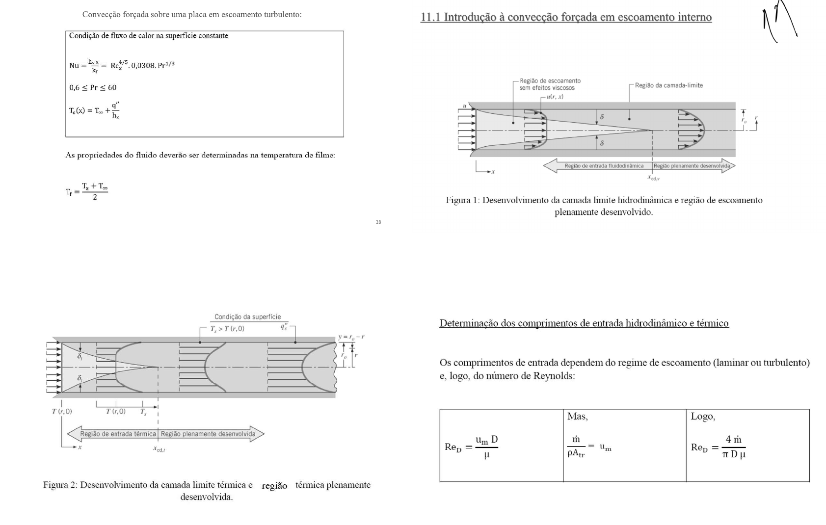 Convecção forçada sobre uma placa em escoamento turbulento: 11.1 Introdução à convecção forçada em escoamento interno Condição de fluxo de calor na superficie constante = Região de escoamento 60 sem efeitos viscosos Região da camada-limite x) 4 8 8 As propriedades do fluido deverão ser determinadas na temperatura de Região de entrada fluidodinâmica Região plenamente desenvolvida Figura 1: Desenvolvimento da camada limite hidrodinâmica e região de escoamento plenamente desenvolvido. 28 Condição da superfície Determinação dos comprimentos de entrada hidrodinâmico e térmico y = r 8, Os comprimentos de entrada dependem do regime de escoamento (laminar ou turbulento) logo, do número de Reynolds: (r.0) Logo, Região de entrada térmica Região plenamente desenvolvida D in 4 m = Figura 2: Desenvolvimento da camada limite térmica e região térmica plenamente desenvolvida.Comprimento de entrada hidrodinâmico: Definição de velocidade temperatura média e fluxo: Laminar Turbulento maior que Para calcular fluxo interno usamos a velocidade média Um e a temperatura média Tm do fluido. Xcd,v 0,05 D Xcd,v 10 D Vazão mássica: Ou. Logo, Escoamento incompressivel em um tubo circular de raio Comprimento de entrada térmico: Laminar Turbulento maior que in = dr 0,05 D Pr Xcd,t 10 D Perfil de velocidades na região plenamente desenvolvida: Gradiente de pressão e fator de atrito em escoamento plenamente desenvolvido: u(r) Para determinar a queda de pressão, é conveniente trabalhar com o fator de atriro de Darcy ou de Moody (f), que é um parâmetro adimensional definido como: Figura 3: Perfil de velocidade em escoamento plenamente desenvolvido. dpPara escoamento turbulento temos a correlação de Colebrook: 2 f 4 f 1 2 Lembrando que, As duas expressões são apresentadas no Gráfico de Moody, Figura 4. 4 e = Para escoamento laminar: 64 Zona Zona de transic ão Zona rugosa Escoamento 0,07 laminar P2 0,06 P1 0.02 0.015 0.01 0.008 A potência de bombas e ventiladores para superar a resistência ao escoamento associado 0.006 0,03 a esta queda de pressão pode ser representada como: 0.025 0.002 0,02 0.001 P=ApQ 0.0002 Tubo galvanizado 1.5 0.0001 comercial 46 Ferro fundido 260 lisos Onde Q é a vazão volumétrica. Concreto 300-3000 0.009 2 2 2 2 Número de Reynolds 0.000.005 Figura 4: Fator de atrito de Darcy em função do número de Reynolds.Taxa de energia térmica transportada pelo fluido = Se defimirmos a temperatura média de tal forma que: Taxa de energia térmica transportada pelo fluido = m Da Lei de Resfriamento de Newton: Obtemos que: Condições térmicas na região plenamente desenvolvida: Condições térmicas na região plenamente desenvolvida: h Desta forma, um requerimento para condições térmicas plenamente desenvolvidas é que: hcd a x o Figura 5: Variação de h com a posição X.Lei de Fourier: Determinação da temperatura média: A determinação da temperatura média é fundamental para a análise de escoamentos internos. Considere o escoamento em um tubo, Figura 6. Lei de Newton: in Tm dr dx- 0 e Saída, S Figura 6: Escoamento de um fluido com troca térmica. Considerando gás ideal ou um fluido incompressível, um balanço de energia no volume Podemos escrever: de controle leva a: = = = Integrando da entrada do tubo até a saída do tubo: - = Essa expressão é usada para calcular a variação axial de A sua solução depende da condição térmica da superfície (T ou fluxo constante).Caso (1): fluxo de calor constante Caso (2): temperatura da superfície constante T Definimos: AT=Ts-Tm Região de entrada Região plenamente desenvolvida = constante Tal que, Integrando a partir de x=0, teremos: dx dx constante dTm dx = Figura 7: Temperatura média ao longo do tubo para fluxo constante. Integrando, A taxa total de calor pode ser determinada via diferença de temperatura média T T. dAT AT = P h dx PL PL ATentrada Chega-se a, T. constante = - PL o L ATentrada Ts Tm,entra Figura 8: Temperatura média ao longo do tubo para temperatura de superficie constante.Caso (3): temperatura do fluido externo constante Too Too - - Tm,entra Tm,sai = exp = exp Escoamento externo Aexterna ATml qconv = Aexterna Escoamento interno + 1 Figura 9: Temperatura do fluido externo constante.