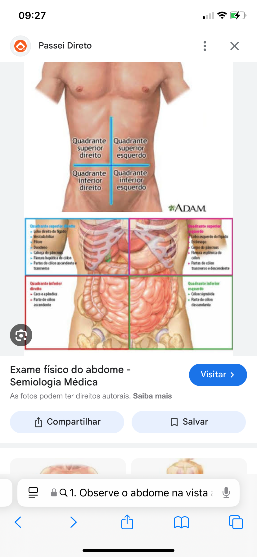 09:27 Passei Direto : X Quadrante Quadrante superior superior direito esquerdo Quadrante Quadrante inferior inferior direito esquerdo drante superior figado do Lobo esquerdo do Corpo de do do do Partes do Partes do colon transverse Quadrante infector Quadrante inferior esquardo Caco sigmoide Parte do Parte Exame físico do abdome - Visitar > Semiologia Médica As fotos podem ter direitos autorais. Saiba mais Compartilhar Salvar Q1. Observe o abdome na vista a
