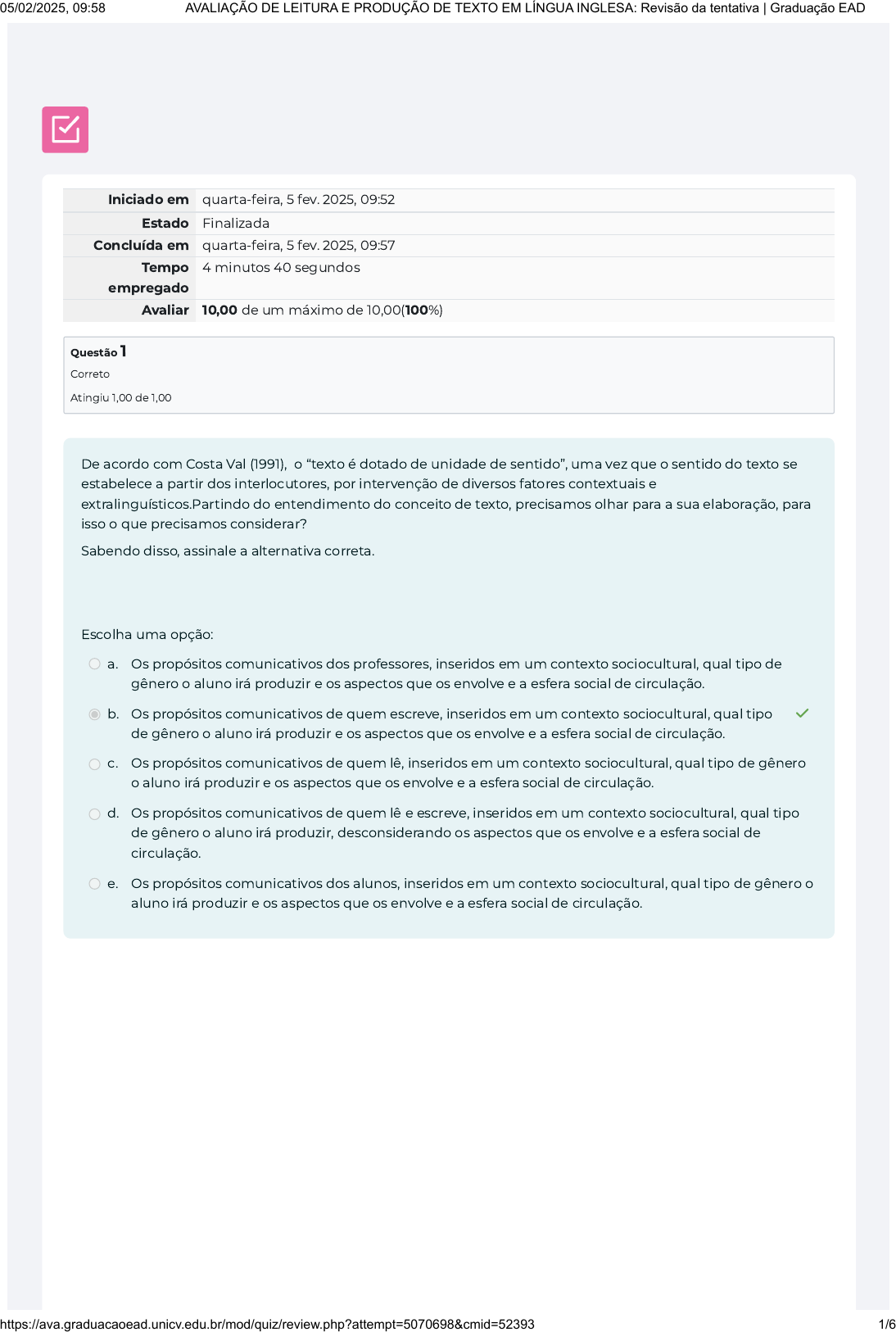 Iniciado em quarta-feira, 5 fev. 2025, 09:52 Estado Finalizada Concluída em quarta-feira, 5 fev. 2025, 09:57 Tempo empregado 4 minutos 40 segundos Avaliar 10,00 de um máximo de 10,00(100%) Questão 1 Correto Atingiu 1,00 de 1,00 De acordo com Costa Val (1991), o “texto é dotado de unidade de sentido”, uma vez que o sentido do texto se estabelece a partir dos interlocutores, por intervenção de diversos fatores contextuais e extralinguísticos.Partindo do entendimento do conceito de texto, precisamos olhar para a sua elaboração, para isso o que precisamos considerar? Sabendo disso, assinale a alternativa correta. Escolha uma opção: a. Os propósitos comunicativos dos professores, inseridos em um contexto sociocultural, qual tipo de gênero o aluno irá produzir e os aspectos que os envolve e a esfera social de circulação. b. Os propósitos comunicativos de quem escreve, inseridos em um contexto sociocultural, qual tipo de gênero o aluno irá produzir e os aspectos que os envolve e a esfera social de circulação. ✓ c. Os propósitos comunicativos de quem lê, inseridos em um contexto sociocultural, qual tipo de gênero o aluno irá produzir e os aspectos que os envolve e a esfera social de circulação. d. Os propósitos comunicativos de quem lê e escreve, inseridos em um contexto sociocultural, qual tipo de gênero o aluno irá produzir, desconsiderando os aspectos que os envolve e a esfera social de circulação. e. Os propósitos comunicativos dos alunos, inseridos em um contexto sociocultural, qual tipo de gênero o aluno irá produzir e os aspectos que os envolve e a esfera social de circulação. 05/02/2025, 09:58 AVALIAÇÃO DE LEITURA E PRODUÇÃO DE TEXTO EM LÍNGUA INGLESA: Revisão da tentativa | Graduação EAD https://ava.graduacaoead.unicv.edu.br/mod/quiz/review.php?attempt=5070698&cmid=52393 1/6 Questão 2 Correto Atingiu 1,00 de 1,00 Questão 3 Correto Atingiu 1,00 de 1,00 É um conjunto de características as quais constituem o texto e fazem com que ele seja visto como tal, não como um conjunto de palavras e frases que não compõem um todo significativo. Como é chamado esse conjunto de características? A esse respeito, assinale a alternativa correta. Escolha uma opção: a. Aceitabilidade. b. Textualidade. ✓ c. Gênero textual. d. Coesão. e. Texto. Conforme informações disponibilizadas no seu material de estudo, a leitura em língua inglesa, assim como em outras línguas, depende de vários fatores: conhecimento do código linguístico, dos gêneros textuais a serem lidos, dos temas presentes no texto; O professor, mediador do conhecimento, deve auxiliar aos alunos na construção dos objetivos a serem alcançados na leitura, para que assim definam o nível de compreensão que precisam ou desejam atingir. Para que isso ocorra, é preciso considerar algumas estratégias de leitura. A partir disso, como o material define a estratégia “Prediction”? Assinale a alternativa correta. Escolha uma opção: a. Trata-se de localizar as palavras repetidas, as palavras-chave, as palavras cognatas e as palavras derivadas, assim o leitor poderá relacioná-las a seus conhecimentos linguísticos anteriores e ao contexto no qual elas apareceram, estabelecendo um sentido a essas palavras. b. Pode ser tanto um nível de leitura quanto uma pré-leitura, ou seja, o leitor irá predizer informações que muito provavelmente estará no texto. Assim o leitor poderá predizer elementos linguísticos, ideias, conceitos que o texto apresentará, função social do gênero lido entre outros. ✓ c. Diz respeito à capacidade do leitor selecionar, num texto, aspectos importantes tais como: palavras, parágrafos, seções, porções que considera importantes para compreender melhor sem ter que ler o texto na íntegra. d. Busca de informações específicas em locais do texto já previstos, como por exemplo, os principais aspectos presentes na introdução, as características das personagens, tempo, espaço e conflito presentes no desenvolvimento de uma narrativa, nesta estratégia de leitura, ainda busca informações pontuais. e. Significa “olhada” geral, rápida por todo o texto para apreender o que for compreensível à primeira vista, com objetivo de realizar uma compreensão global do assunto e do enfoque que lhe é dado, através das informações não-verbais, dos títulos, subtítulos, início e fim de parágrafos, entre outros, permitindo reconhecer o gênero e fazer algumas predições. 05/02/2025, 09:58 AVALIAÇÃO DE LEITURA E PRODUÇÃO DE TEXTO EM LÍNGUA INGLESA: Revisão da tentativa | Graduação EAD https://ava.graduacaoead.unicv.edu.br/mod/quiz/review.php?attempt=5070698&cmid=52393 2/6 Questão 4 Correto Atingiu 1,00 de 1,00 Conforme informações disponibilizadas no seu material de estudo, quando o assunto é texto, devemos considerar a comunicação que ele estabelece e a produção de sentidos presente entre o produtor do texto e o receptor. (ROCHA, 2015). Portanto, o texto deve ser entendido como uma “unidade formal, material''. Seus constituintes devem se mostrar reconhecivelmente integrados, de modo a permitir que ele seja percebido como um todo coeso”. (COSTA VAL, 1991). Ainda de acordo com a autora, analise as assertivas a seguir a respeito do conceito de texto. I. Para que seja bem compreendido, é necessário apresentar três aspectos. II. O aspecto pragmático, isto é, o funcionamento no que diz respeito à atuação informacional e comunicativa. III. O aspecto semântico-conceitual refere-se à coerência. IV. O formal, o qual concerne à sua coesão. Assinale a alternativa correta: Escolha uma opção: a. Apenas I está correta. b. Apenas III e IV estão corretas. c. I, II, III e IV estão corretas. ✓ d. Apenas II está correta. e. Apenas II e III estão corretas. 05/02/2025, 09:58 AVALIAÇÃO DE LEITURA E PRODUÇÃO DE TEXTO EM LÍNGUA INGLESA: Revisão da tentativa | Graduação EAD https://ava.graduacaoead.unicv.edu.br/mod/