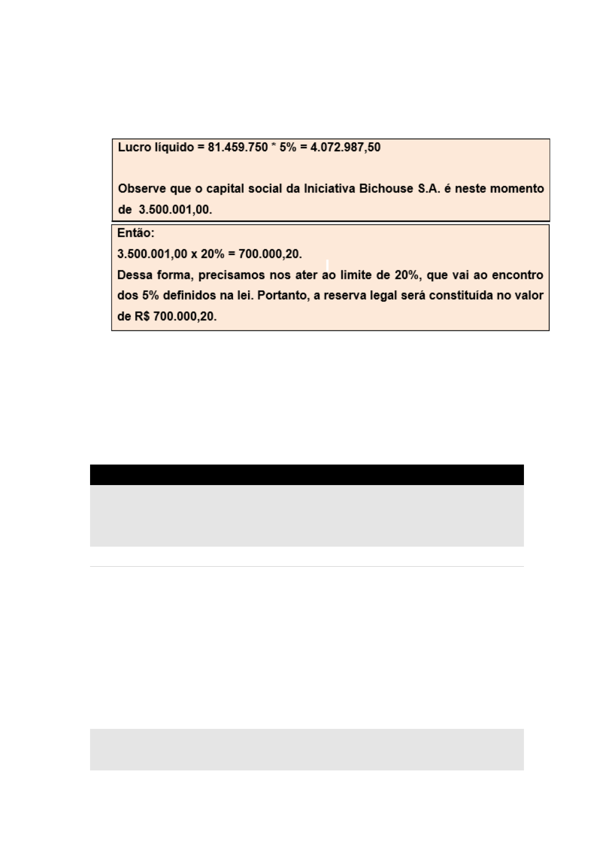 Pergunta 1 0,17/0,17 O Cálculo do valor da Reserva legal da Iniciativa Bichouse S. A. foi o seguinte: Se, no entanto, o lucro Líquido da Iniciativa Bichouse S. A. fosse de R$ 400.000,00 para um capital social de R$ 600.000,00 e já houvesse uma reserva legal constituída no valor de R$ 70.000,00 de períodos anteriores, mais uma reserva de capital de R$ 100.000,00 qual seria o valor a ser contabilizado como reserva legal ? Mostrar opções de resposta 20.000,00 120.000,00 1.456.000,00 2.000,00 Pergunta 2 0,17/0,17 O Sr. Renato Amoreira Stillwalker, personagem do caso “A Iniciativa de Anny Bichouse” integralizou sua participação na entidade com o capital social de significativo R$ 1,00 com uma moeda suja de piche, por conta de um ressentimento que tinha com a Anny Bichouse, que o abandonou no passado. À parte dessa situação, o Sr. Renato ou um sócio/acionista tem a possibilidade de integralizar capital com outro tipo de bem que não dinheiro? Mostrar opções de resposta Sim, o capital social pode ser integralizado com obrigações (dívidas). Não, o capital social deve ser integralizado exclusivamente em dinheiro. Não, a única exceção é feita com moedas estrangeiras, desde que a conversão cambial seja aprovada pelo Banco Central. Sim, o capital social pode ser integralizado com outros bens, como imóveis, veículos, estoques. Pergunta 3 0,17/0,17 A empresa Iniciativa Bichouse S.A. é uma sociedade anônima de capital fechado, ou seja, não tem ações negociadas na bolsa de valores. Se fosse uma empresa com ações negociadas na bolsa de valores, (teria ações pulverizadas em poder de acionista anônimos no mercado), na Demonstração do Resultado do Exercício de 31/12/20XX (apresentada abaixo) estaria faltando algum aspecto importante, de acordo com a Lei 6.404/76, complementada pelas leis 11.638/07 e 11.941/09? Mostrar opções de resposta Sim, faltaria o passivo circulante. Sim, faltaria o nome dos cinco principais acionistas. Sim, faltaria o custo dos serviços vendidos. Sim, faltaria o lucro líquido por ação. Pergunta 4 0,17/0,17 A seguir, aponte a única alternativa que não traz um componente do patrimônio que não deve ser considerado “Caixa e equivalente de caixa”: Mostrar opções de resposta Dinheiro guardado no cofre, na sede da empresa. Cheques de viagem (Moeda estrangeira na forma de tickets ou cartão para viagens – Traveller checks). Estoques. Maços de notas de euros, dólares e libras esterlinas.