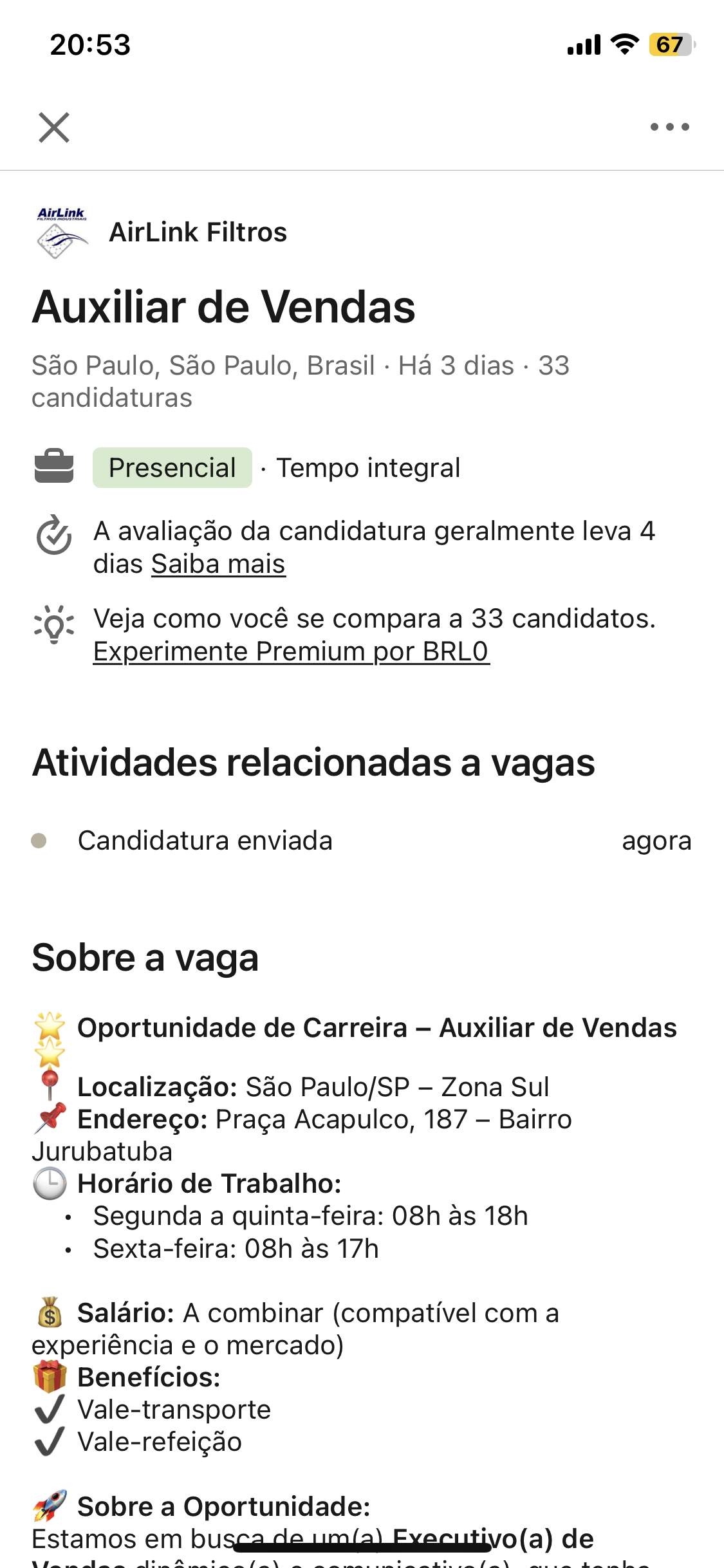 20:53 67 X AirLink AirLink Filtros Auxiliar de Vendas São Paulo, São Paulo, Brasil Há 3 dias 33 candidaturas Presencial Tempo integral A avaliação da candidatura geralmente leva 4 dias Saiba mais Veja como você se compara a 33 candidatos. Experimente Premium por BRLO Atividades relacionadas a vagas Candidatura enviada agora Sobre a vaga Oportunidade de Carreira - Auxiliar de Vendas Localização: São Paulo/SP - Zona Sul Endereço: Praça Acapulco, 187 - Bairro Jurubatuba Horário de Trabalho: Segunda a quinta-feira: 08h às 18h Sexta-feira: 08h às 17h $ Salário: A combinar (compatível com a experiência e o mercado) Benefícios: Vale-transporte Vale-refeição Sobre a Oportunidade: Estamos em busca de um(a) Executivo(a) de