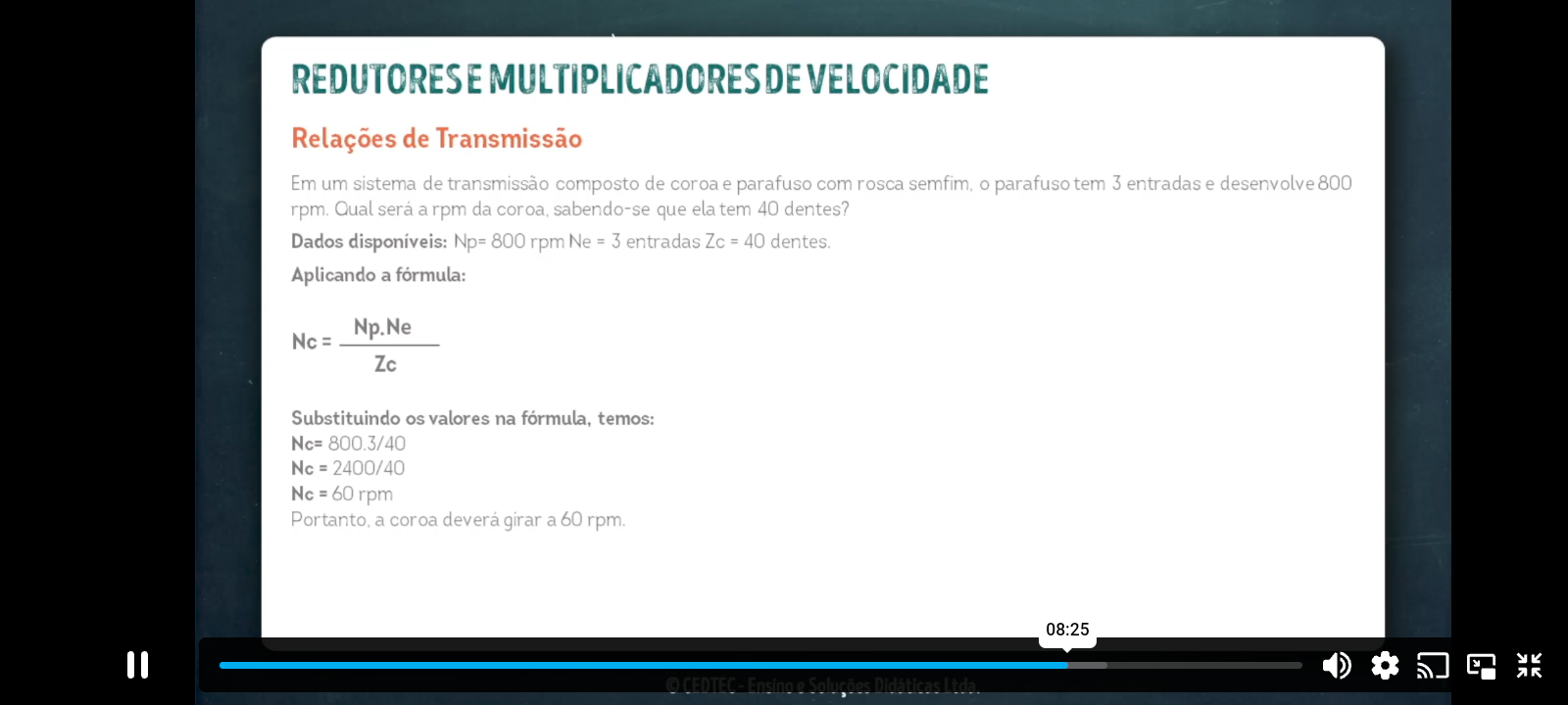 REDUTORES E MULTIPLICADORES DE VELOCIDADE Relações de Transmissão Em um sistema de transmissão composto de coroa e parafuso com rosca parafuso tem 3 entradas e desenvolve 800 rpm. Qual será a rpm da coroa sabendo-se que ela tem 40 dentes? Dados disponíveis: Np= 800 rpm entradas = 40 Aplicando a fórmula: Np.Ne Nc = Zc Substituindo os valores na fórmula, temos: Nc= 800.3/40 Nc = 2400/40 Nc = 60 rpm Portanto, a coroa deverá girar a 60 rpm. 08:25