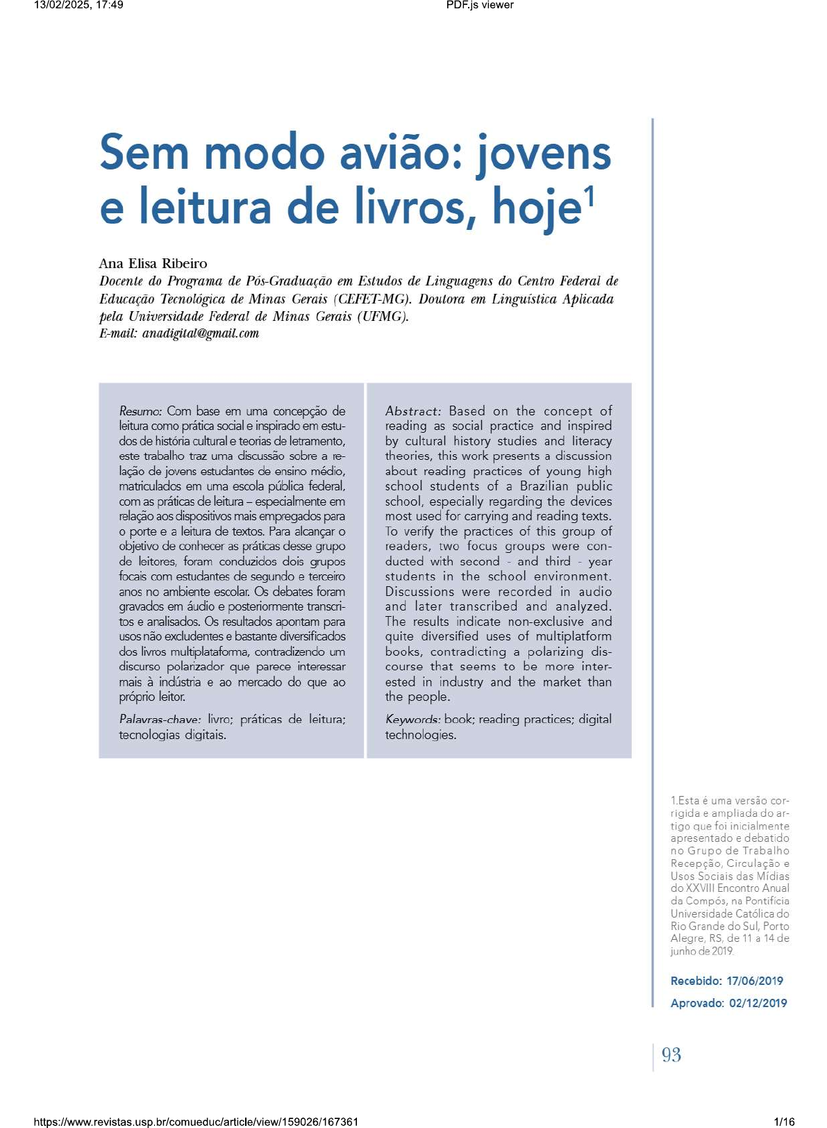 13/02/2025, 17:49 PDF.js viewer Sem modo avião: jovens e leitura de livros, hoje Ana Elisa Ribeiro Docente do Programa de Pós-Graduação em Estudos de Linguagens do Centro Federal de Educação Tecnológica de Minas Gerais (CEFET-MG). Doutora em Linguística Aplicada pela Universidade Federal de Minas Gerais (UFMG). E-mail: anadigital@gmail.com Resumo: Com base em uma concepção de Abstract: Based on the concept of leitura como prática social e inspirado em estu- reading as social practice and inspired dos de história cultural e teorias de letramento, by cultural history studies and literacy este trabalho traz uma discussão sobre a re- theories, this work presents a discussion lação de jovens estudantes de ensino médio, about reading practices of young high matriculados em uma escola pública federal, school students of a Brazilian public com as práticas de leitura - especialmente em school, especially regarding the devices relação aos dispositivos mais empregados para most used for carrying and reading texts. o porte e a leitura de textos. Para alcançar o To verify the practices of this group of objetivo de conhecer as práticas desse grupo readers, two focus groups were con- de leitores, foram conduzidos dois grupos ducted with second - and third - year focais com estudantes de segundo e terceiro students in the school environment. anos no ambiente escolar. Os debates foram Discussions were recorded in audio gravados em áudio e posteriormente transcri- and later transcribed and analyzed. tos e analisados. Os resultados apontam para The results indicate non-exclusive and usos não excludentes e bastante diversificados quite diversified uses of multiplatform dos livros multiplataforma, contradizendo um books, contradicting a polarizing dis- discurso polarizador que parece interessar course that seems to be more inter- mais à indústria e ao mercado do que ao ested in industry and the market than próprio leitor. the people. Palavras-chave: livro; práticas de leitura; Keywords: book; reading practices; digital tecnologias digitais. technologies. 1.Esta é uma versão cor- rigida e ampliada do ar- tigo que foi inicialmente apresentado e debatido no Grupo de Trabalho Recepção, Circulação e Usos Sociais das Mídias do XXVIII Encontro Anual da na Pontifícia Universidade Católica do Rio Grande do Sul, Porto Alegre, RS, de 11 a 14 de junho de 2019. Recebido: 17/06/2019 Aprovado: 02/12/2019 93 https://www.revistas.usp.br/comueduc/article/view/159026/167361 1/1613/02/2025, 17:49 PDF.js viewer comunicação & educação Ano XXV número 1 jan/jun 2020 1. DISCURSOS E PONDERAÇÕES SOBRE LEITURA E LIVRO: 2.MELLO CONSIDERAÇÕES INICIAIS A recepção do e-book no Brasil: uma pesquisa quantitativa com leitores O objetivo maior deste trabalho é tecer considerações sobre modo como nativos e imigrantes di- jovens estudantes de uma escola pública federal entretecem suas práticas de gitais. In: CONGRESSO BRASILEIRO DE CIÊNCIAS leitura, em ambientes digitais e impressos, incluindo os dispositivos que usam DA COMUNICAÇÃO, para isso, a partir de uma investigação que partiu da teoria e foi a campo 2016, São Paulo: Anais São Paulo: Universidade de a sala de aula por meio de grupos focais, a fim de observar e ouvir esses São Paulo, 2016. Disponível em: participantes. Várias pesquisas têm sido feitas e relatadas sobre a relação org.br/anais/nacional2016/ leitor/livro, em particular algumas que buscam conhecer e descrever traços das resumos/R11-2647-1.pdf. Acesso em: 12 maio 2018. práticas reais de adolescentes (estudantes da educação básica) e universitários. Prensky (2001, Os resultados dessas investigações apontam para mesmo sentido que desejamos 1, tradução nossa), os estu- discutir aqui. caso, por exemplo, da pesquisa de José de Mello que dantes aos quais ele se fere "hoje", isto em 2001, investigou mais de 900 estudantes do ensino superior em cinco regiões do Brasil, não mudaram apenas seus modos de falar ou vestir em empregando para isso um método do tipo survey e entrevistas. Após a coleta dos relação a seus predeces- dados, houve tratamento estatístico a fim de demonstrar os usos que os jovens Há "uma realmente grande descontinuidade" fazem dos dispositivos que escolhem ou podem usar para ler. Mello Júnior se entre essas sustenta em classificações de tipos de leitor propostas por Lucia Santaella e por conta da chegada das tecnologias digitais nas úl- na ideia de "nativo de Prensky, levantando e testando a hipótese de timas décadas do século Segundo os que os "nativos digitais" seriam mais aderentes às leituras em telas e por meio estudantes de "hoje" de dispositivos digitais do que seus antecessores, os "imigrantes digitais", que primeira geração a crescer com essa nova tecnologia. teriam a cultura do impresso mais arraigada em suas práticas e preferências. Eles têm gastado suas vi- Após essa robusta pesquisa com centenas de jovens universitários e o trata- das inteiras rodeados por ou usando computadores, mento dos dados, pesquisador conclui que "A aderência destes leitores à leitura videogames, tocadores de digitais, câmeras de em telas é baixa, embora utilizem essa modalidade de Mais adiante, vídeo, telefones celulares, o autor afirma que sua investigação e todos os outros brinque- dos e ferramentas da era digital". Em razão demonstrou não haver diferença estatisticamente significativa entre a amostra de esses jovens pensariam e nativos digitais e a de imigrantes, revelando como falsa a hipótese de que público processariam informações mais jovem, que cresceu sob a influência dos meios eletrônicos, seria mais aderente dife- rentemente de seus prede- a leitura em telas que os em uma veloci- dade e de um modo que os Mello Júnior atribui a lentidão na adesão dos jovens à leitura em telas e de educadores não poderiam supor. Prensky cita pesqui- nossa sociedade em geral a fatores culturais ligados às "práticas de