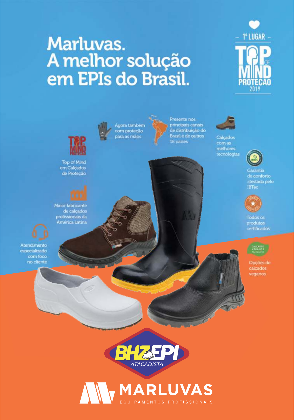 EPI´S / PROTEÇÃO PARA PÉS06 50B26-CB-BP-CX Bo�na Nubuck – Marluvas (CA 13808) Bota de segurança confeccionada em couro nubuck, com estrutura fibrosa e microporosa que ajuda a manter a temperatura dos pés. Ref. : 181 N 35 | 182 N 36 | 183 N 37 | 184 N 38 | 185 N 39 | 186 N 40 187 N41 | 188 N 42 | 189 N 43 | 190 N 44 | 2553 N45 | 1674 N46 Bo�na Café Bournet Adv – Ecosafety (CA 17144) Bota em couro com acabamento em látego, com cadarço preto com bege, solado de borracha costurado nas laterais onde há um reforço dando mais durabilidade no calçado, colarinho acolchoado de espuma com espessura 14mm, língua com sistema fechado, com biqueira de PVC, com forração externa em nylon e com peso de 1 kg em cada par (nós usamos como base a numeração 40). Ref. : 268 N 35 | 269 N 36 | 46 N 37 | 47 N 38 | 48 N 39 | 49 N 40 50 N41 | 51 N 42 | 52 N 43 | 53 N 44 | 270 N 45 Bo�na Nobuck Café – Ecosafety (CA 40677) Calçado ocupacional de uso pro�ssional tipo botina, cabedal confeccionado em vaqueta curtida ao cromo, fechamento em cadarço, palmilha de montagem em não tecido �xada pelo sistema strobel, biqueira de conformação, solado de poliuretano antiderrapante injetado diretamente no cabedal. Ref. : 44 N 35 | 45 N 36 | 36 N 37 | 37 N 38 | 38N 39 | 39N 40 40 N41 | 41 N 42 | 42 N 43 | 43 N 44 | 328 N 45 EPI´S / PROTEÇÃO PARA PÉS06 Bo�na Elás�co 100% Couro Bi-densidade CRIVAL (CA 30257) Costuras simples, duplas e quádruplas Solado em poliuretano (PU) injetado diretamente no cabedal, com função an�derrapante e com alta resistência ao desgaste. Ref .: 740 N37 | 741 N38 | 742 N39 | 743 N40 | 744 N41 745 N42 | 746 N43 | 747 N44 | 748 N45 | 2482 N46 Bo�na Amarrar Bi-densidade Flex C/B Crival (CA 30258) Proteção dos pés do usuário contra riscos de natureza leve e contra agentes abrasivos e escoriantes. Ref .: 1978 N36 | 1979 N 37 | 1980 N 38 | 1981 N 39 | 1982 N40 1983 N41 | 1984 N 42 | 1985 N 43 | 1986 N 44 | 1987 N 45 Bo�na Elás�co Bi-densidade C/B Flex Crival (CA 30257) Bo�na confeccionada em couro Vaqueta Liso, fechamento em elás�co, biqueira de PVC , solado bi densidade injetado direto ao cabedal. Ref. : 2018 N35 | 2019 N 36 | 2020 N 37 | 2021 N 38 | 2022 N 39 | 2023 N40 | 2024 N 41 2025 N 42 | 2026 N 43 | 2027 N 44 | 2028 N45 | 2029 N 46 EPI´S / PROTEÇÃO PARA PÉS07 Ref .: 769 N36 | 770 N37 | 771 N38 | 772 N39 | 773 N40 | 774 N41 775 N42 | 776 N43 | 1326 N44 | 777 N45 60B19M-Crap-Pad Bo�na Elast.B/Comp – Marluvas (CA 25013) Bota de segurança com proteção mecânica confeccionada em couro. A linha 60b19 é uma linha que suporta temperatura. Ref .: 1521 N37 | 1522 N38 | 1523 N39 | 1503 N40 | 1524 N41 1504 N42 | 1505 N43 | 1506 N44 | 1507 N45 30B19-MEX-CPAP-PAD Bo�na Elast.Comp BID Couro – Marluvas (CA 18058) Bota de segurança com proteção elétrica e mecânica, confeccionada em couro. 161 N39 | 162 N40 | 163 N41 | 164 N 42 | 165 N 43 166 N 44 728 N37 | 729 N 38 | 730 N 45 30B19-C-PAD Bo�na Elast. C/B Comp. – Marluvas (CA 32814) Bota de segurança com proteção elétrica e mecânica, confeccionada em couro. Ref.: 2017 N36 | 1158 N37 | 335 N 38 | 336 N 39 | 337 N40 | 794 N41 | 338 N 42 339 N43 | 340 N 44 | 1159 N45 | 1051 N46 BOTINA 50B29-CPAP MANOBREIRO – Marluvas (CA 18053) Bota de segurança com proteção elétrica e mecânica, confeccionada em couro. 30B19-CPAP-PAD Bo�na Elast. Comp. – Marluvas (CA 32813) Bota de segurança com proteção elétrica e mecânica, confeccionada em couro. Ref. : 154 N 38 | 155 N 39 | 156 N 40 | 157 N 41 | 158 N 42 | 159 N 43 160 N44 | 334 N 45 EPI´S / PROTEÇÃO PARA PÉS08 Ref. : 384 N 35 | 54 N 36 | 55 N 37 | 56 N 38 | 57 N 39 | 58 N 40 59 N41 | 60 N 42 | 61 N 43 | 62 N 44 | 63 N 45 Bo�na 10VB 48 B/P Elast. Vulcaflex (CA 43377) VULCAFLEX – 10VB48 – Bota de segurança confeccionada em couro. Modelo com biqueira de polipropileno. Bo�na 10VB 48 B/A Elast. Vulcaflex (CA 28491) VULCAFLEX – 10VB48 – Bota de segurança confeccionada em couro. Modelo com biqueira de aço. Ref. : 64 N 38 | 65 N 39 | 66 N 40 | 67 N 41 | 68 N 42 | 69 N43 70 N44 | 71 N 45 10VB48-A Bo�na Elast.Vulc. Palm A – Marluvas (CA 29392) Bota de segurança confeccionada em couro. Ref : 784 N36 | 785 N37 | 786 N38 | 787 N39 | 788 N40 | 789 N41 790 N42 | 791 N43 | 792 N44 | 2742 N45 Ref .: 1558 N35 | 405 N36 | 10 N37 | 11 N38 | 12 N39 | 13 N40 | 14 N41 15 N42 | 16 N43 | 17 N44 | 18 N45 | 1989 N46 Bo�na CRIVAL Elás�co PU Mono SB (CA 31701) Bo�na de elás�co Imbiseg. Atende as normas ABNT NBR ISO. Bo�na CRIVAL com Elás�co PU Mono B/A (CA 31688) Fechamento em elás�co, palmilha de montagem em não tecido, solado em poliuretano monodensidade e com biqueira de aço. Ref .: 406 N38 | 19 N39 | 20 N40 | 21 N41 | 22 N42 23 N43 | 24 N44 Botina de segurança com fechamento em elástico nas laterais e dorso acolchoado, confeccionada em raspa relax preta e forração interna em tecido não-tecido. Ref .: 781 N 37 | 174 N 38 | 175 N 39 | 176 N 40 | 177 N 41 | 178 N 42 179 N43 | 180 N 44 | 782 N 45 90B19-A Bo�na Elast. B/A – Marluvas (CA 15381) Ref .: 778 N36 | 779 N37 | 167 N38 | 168 N 39 | 169 N 40 | 170 N 41 171 N42 | 172 N 43 | 173 N44 | 780 N45 90B19- BP Bo�na Elast. B/P – Marluvas (CA 15383) Bo�na de segurança com fechamento em elás�co nas laterais e dorso acolchoado, confeccionada em raspa relax preta e forração interna em tecido não-tecido. Ref.: 1315 N39 | 1316 N40 | 1317 N41 | 1318 N42 | 1358 N44 1458 N43 | 1459 N44 | 1562 N38 Bo�na 95B19-BP Biqueira de Polipropileno (CA 41419) Bota de segurança, confeccionada 100% em couro. Biqueira de polipropileno. Fechamento em elás�co nas laterais. Opcional em palmilha de aço. Palmilha de montagem em poliéster resinado. Solado isolante em PU bidensidade com sistema de absorção de impacto, injetado diretamente no cabedal. Bo�na 95B19-A Biqueira de Aço (CA 41429) Bota de segurança, confeccionada 100% em couro. Biqueira de Aço. Fe