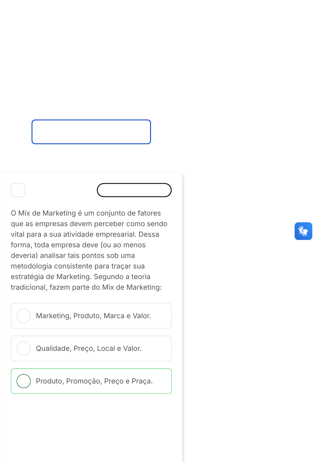 Você acertou 9 de 9 questões Verifique o seu desempenho e continue treinando! Você pode refazer o exercício quantas vezes quiser. Verificar Desempenho A B C 1 Marcar para revisão O Mix de Marketing é um conjunto de fatores que as empresas devem perceber como sendo vital para a sua atividade empresarial. Dessa forma, toda empresa deve (ou ao menos deveria) analisar tais pontos sob uma metodologia consistente para traçar sua estratégia de Marketing. Segundo a teoria tradicional, fazem parte do Mix de Marketing: Marketing, Produto, Marca e Valor. Qualidade, Preço, Local e Valor. Produto, Promoção, Preço e Praça. 14/02/2025, 09:19 estacio.saladeavaliacoes.com.br/exercicio/67ae3cb434fbec2ca5d3917b/gabarito/ https://estacio.saladeavaliacoes.com.br/exercicio/67ae3cb434fbec2ca5d3917b/gabarito/ 1/12 D E Propaganda, Produto, Preço e Marca. Marca, Propaganda, Qualidade e Local. Resposta correta Parabéns, você selecionou a alternativa correta. Confira o gabarito comentado! Gabarito Comentado De acordo com a teoria tradicional do Mix de Marketing, os quatro elementos fundamentais são: Produto, Promoção, Preço e Praça. Esses elementos são conhecidos como os 4Ps do Marketing. O 'Produto' se refere ao bem ou serviço que a empresa oferece. 'Promoção' envolve todas as estratégias de comunicação e publicidade utilizadas para informar ou persuadir os clientes. 'Preço' é o valor que será cobrado pelo produto ou serviço. E 'Praça' se refere ao local onde o produto será vendido ou o serviço será prestado. Portanto, a alternativa correta é a C� Produto, Promoção, Preço e Praça. 2 Marcar para revisão Existem diversos tipos de custos envolvidos no processo de determinação de preço. Custos variáveis são aqueles que: 14/02/2025, 09:19 estacio.saladeavaliacoes.com.br/exercicio/67ae3cb434fbec2ca5d3917b/gabarito/ https://estacio.saladeavaliacoes.com.br/exercicio/67ae3cb434fbec2ca5d3917b/gabarito/ 2/12 A B C D E Incluem o prazo para pagamento, se houver. Oscilam em função do nível da produção. Refletem em lucro líquido positivo das transações. Representam o somatório dos custos totais da empresa. Variam em função da matéria-prima disponível. Resposta correta Parabéns, você selecionou a alternativa correta. Confira o gabarito comentado! Gabarito Comentado Os custos variáveis são aqueles que oscilam em função do nível da produção. Isso significa que eles aumentam ou diminuem de acordo com a quantidade de produtos ou serviços produzidos. Portanto, a alternativa correta é a B� "Oscilam em função do nível da produção". 3 Marcar para revisão Aumentar a parcela de mercado em que atua é um dos objetivos da maior parte das empresas atualmente. Existem diferentes estratégias 14/02/2025, 09:19 estacio.saladeavaliacoes.com.br/exercicio/67ae3cb434fbec2ca5d3917b/gabarito/ https://estacio.saladeavaliacoes.com.br/exercicio/67ae3cb434fbec2ca5d3917b/gabarito/ 3/12 A B C D E empresariais para se alcaçar esse crescimento. Há uma estratégia que a empresa busca aumento de sinergia, incorporando em seu negócio sua cadeia de fornecimento ou de distribuição. Esse estratégia é conhecida como: Crescimento integrado. Crescimento intensivo. Crescimento por diversificação. Crescimento extensivo. Downsizing e alienação de negócios antigos. Resposta correta Parabéns, você selecionou a alternativa correta. Confira o gabarito comentado! Gabarito Comentado A estratégia de crescimento integrado, em que a empresa tenta incorporar ao seu negócio a sua cadeia de fornecimento ou de distribuição, aumenta o controle sobre elas, reduzindo custos por ganhos de sinergia. Entende-se por ganhos de sinergia os ganhos decorrentes da junção de áreas da mesma atividade" uma organização que adquire outra não precisará manter dois setores de contabilidade e finanças (da adquirente e de adquirida), essas atividades Questão 5 de 9 Corretas �9� Em branco �0� 1 2 3 4 5 6 7 8 9 Lista de exercícios Conceitos … Sair 14/02/2025, 09:19 estacio.saladeavaliacoes.com.br/exercicio/67ae3cb434fbec2ca5d3917b/gabarito/ https://estacio.saladeavaliacoes.com.br/exercicio/67ae3cb434fbec2ca5d3917b/gabarito/ 4/12 A B C D E provavelmente ficarão concentradas na empresa adquirente. 4 Marcar para revisão O composto de marketing é o conjunto de quatro fatores que as empresas devem controlar para obterem sucesso em seus negócios. Um desses fatores refere-se ao esforço da venda e da divulgação do produto da empresa. Assinale a alternativa que indica que fator é esse. Praça. Preço. Promoção. Produto. Pessoal. Resposta correta Parabéns, você selecionou a alternativa correta. Confira o gabarito comentado! Gabarito Comentado Promoção: Refere-se ao esforço de venda e divulgação do produto/serviço nos canais de comunicação e de vendas, incluindo-se 14/02/2025, 09:19 estacio.saladeavaliacoes.com.br/exercicio/67ae3cb434fbec2ca5d3917b/gabarito/ https://estacio.saladeavaliacoes.com.br/exercicio/67ae3cb434fbec2ca5d3917b/gabarito/ 5/12 A B C D E a propaganda e a definição da força de vendas. 5 Marcar para revisão Os produtos podem ser classificados de diversas formas: pelas suas características, pela forma como são comprados, pela qualidade, entre outras. Uma dessas classificações são os bens de impulso. Assinale a alternativa que indica a correta definição de bens de impulso. Itens comprados sem um planejamento prévio. Itens que o consumidor não conhece ou até evita conhecer. Itens específicos que demandam bastante tempo do consumidor para conhecer seus detalhes e especificidades. Itens comparados com seus similares ou com outros que suprem a mesma necessidade. Itens emergenciais que são comprados para suprir uma necessidade urgente e imediata. Resposta correta Parabéns, você selecionou a alternativa correta. Confira o 14/02/2025, 09:19 estacio.saladeavaliacoes.com.br/exercicio/67ae3cb434fbec2ca5d3917b/gabarito/ https://estacio.saladeavaliacoes.com.br