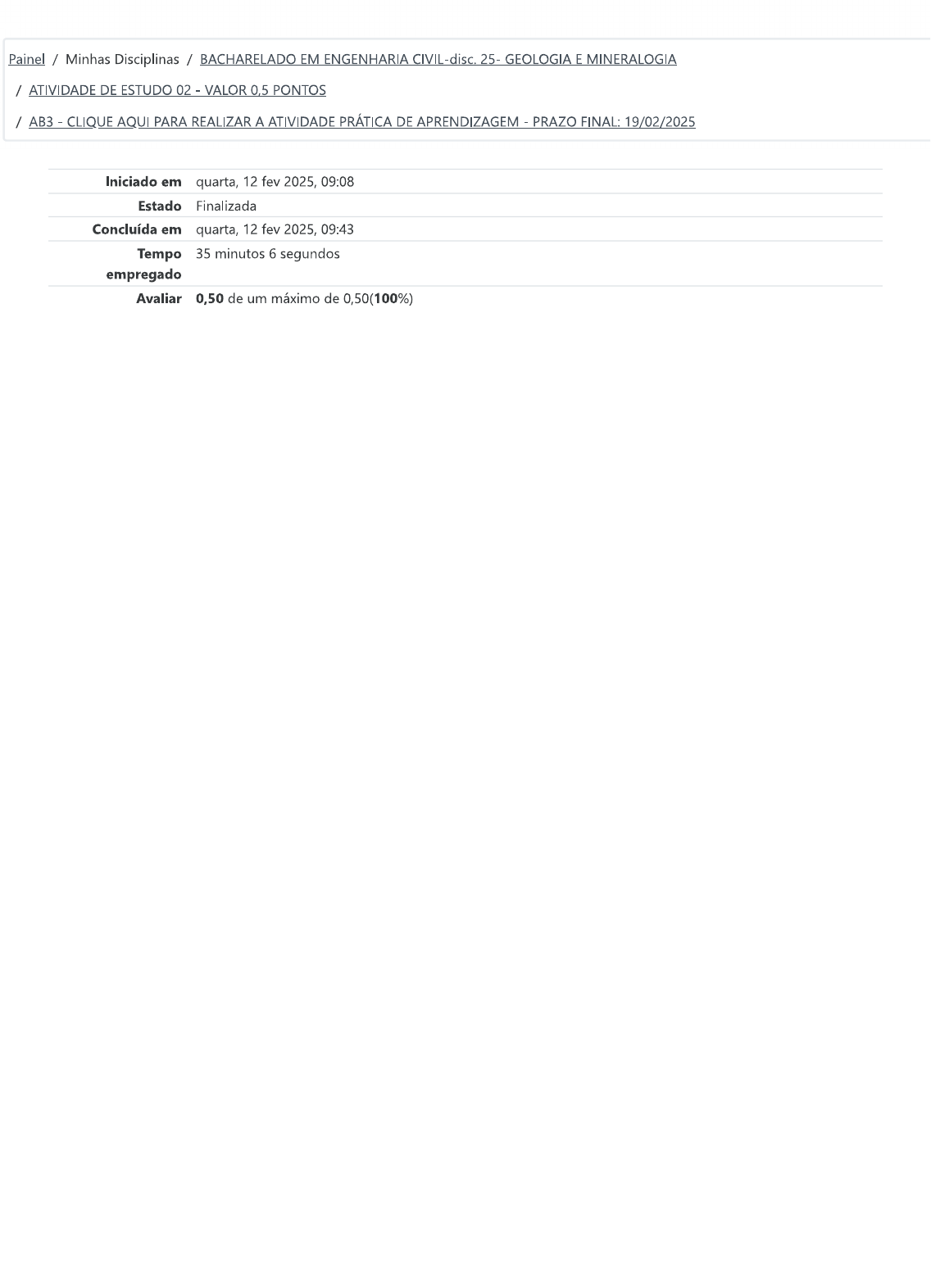 Painel / Minhas Disciplinas / BACHARELADO EM ENGENHARIA CIVIL-disc. 25- - GEOLOGIA E MINERALOGIA / ATIVIDADE DE ESTUDO 02 - VALOR 0,5 PONTOS / AB3 - CLIQUE AQUI PARA REALIZAR A ATIVIDADE PRÁTICA DE APRENDIZAGEM - PRAZO FINAL: 19/02/2025 Iniciado em quarta, 12 fev 2025, 09:08 Estado Finalizada Concluída em quarta, 12 fev 2025, 09:43 Tempo 35 minutos 6 segundos empregado Avaliar 0,50 de um máximo de 0,50(100%)Questão 1 Completo Atingiu 0,05 de 0,05 Os componentes minerais estão presentes nas rochas que compõem a crosta terrestre, nesse sentido, o seu processo de formação está intrinsecamente ligado ao das rochas. "De uma maneira geral, podemos considerar que todos os minerais estão presentes nas várias rochas da crosta terrestre, mas nem todos na mesma proporção" Wetzel et al. (2020, p. 14). Os minerais são formados segundo os arranjos que ocorrem entre os átomos dos elementos presentes na crosta terrestre, em proporções adequadas (Popp, 2017). WETZEL, Raquel S. da; LEÃO, Márcio F.; Silva, Lilia Albuquerque; et al. Mineralogia. Porto Alegre: Sagah, 2020. Grupo A, 2020. E- book. ISBN 9786556900346. Disponível em: Acesso em: 11 out. 2022. POPP, José H. Geologia Geral. edição. Rio de Janeiro: Grupo GEN, 2017. E-book. ISBN 9788521634317. Disponível em: Acesso em: 09 set. 2022. Diante do que foi apresentado no enunciado, análise as afirmativas a seguir: A formação mineralógica está associada ao congelamento da água ou resfriamento do magma. II - processo de cristalização é inerente ao resfriamento ou congelamento, o que determinará o sentido de orientação dos minerais ordenadamente. Durante a cristalização ocorrem ligações e covalentes. III - A formação mineralógica está diretamente relacionada à atuação dos processos físico-químicos, sendo eles: à pressão e à temperatura. A pressão atua na direção de orientação dos minerais perpendicularmente à atuação da força exercida sobre a rocha. Já a temperatura está associada ao desenvolvimento dos cristais. IV - A etapa do arranjo cristalino está relacionada ao agrupamento dos átomos em um arranjo tridimensional ordenado; proporcionado pelas ligações e covalentes, o que formará a estrutura mineral. Assinale a alternativa correta: a. Apenas III e IV estão corretas. b. Apenas II, III e IV estão corretas. C. Apenas e III estão corretas. d. As alternativas I, II, III e IV estão corretas. e. Apenas I e IV estão corretas. Sua resposta está correta.Questão 2 Completo Atingiu 0,05 de 0,05 A identificação dos minerais não ocorre isoladamente, pois os mesmos estão presentes nas rochas constituintes da crosta terrestre. Nesse contexto, em muitas amostras, a análise deverá ser criteriosa e em conjunto com a rocha presente. "Pois uma rocha é uma ocorrência natural de minerais agregados" (Grotzinger; Jordan, 2013, p. 102). GROTZINGER, J; JORDAN, T. Para entender a terra. Porto Alegre: Grupo A, 2013. Disponível em: Acesso em: 13 jun. 2022. Observe a imagem a seguir: Materiais constituintes Ortoclásio Quartzo Biotita Ortoclásio Biotita Quartzo Rocha (granito) Fonte: Extraído de Grotzinger e Jordan (2013, p. 102). Com base nesta informação, analise as asserções abaixo: - A identificação mineralógica é realizada mediante análise de amostras segundo as propriedades macroscópicas (observáveis a olho nu), mecânicas (relacionadas às estruturas físicas), e sua composição química. PORQUE II - As propriedades físicas e químicas são elementos extremamente importantes na identificação mineral, entretanto, o conhecimento prático adquirido por meio da familiarização do manejo mineral é também um dos aspectos que devem ser considerados. A respeito dessas asserções, assinale a opção correta: a. A asserção I é uma proposição falsa e a é uma proposição verdadeira. b. As asserções I e são proposições verdadeiras e a é uma justificativa correta da I.C. As asserções e II são proposições verdadeiras, mas a não é uma justificativa correta da I. d. A asserção é uma proposição verdadeira e a II é uma proposição falsa. e. As asserções e são proposições falsas. Sua resposta está correta.Questão 3 Completo Atingiu 0,05 de 0,05 No escoamento superficial, o gradiente topográfico do relevo está relacionado à velocidade de escoamento da água. A água tende a escoar com maior velocidade em relevos declives e com menos velocidade em superfícies relativamente planas. Observe a imagem a seguir: 490 A A 500 Baixa velocidade de Alta velocidade de escoamento 490 Seção A -A Fonte: Extraído de Queiroz (2016, p. 227). No exposto no enunciado e disposto no material de estudo, assinale a alternativa abaixo que indica corretamente os fatores que diminuem a velocidade do escoamento superficial da água. a. Rochas cristalinas e tipo de solo. b. Baixo volume de água e tipo de solo. C. Cobertura vegetal e infiltração da água no solo. d. Rochas porosas e a cobertura vegetal. e. Cobertura vegetal e o tipo de solo. Sua resposta está correta.Questão 4 Completo Atingiu 0,05 de 0,05 Segundo Wicander e Monroe (2017, p. 262), "porosidade e permeabilidade são importantes propriedades físicas dos materiais da Terra e são, na maioria, responsáveis pela quantidade, pela disponibilidade e pelo movimento das águas subterrâneas". A infiltração da água no solo (percolação) está diretamente relacionada à porosidade e permeabilidade. Nesse sentido, na zona saturada, têm-se as unidades geológicas de infiltração e armazenamento de água subterrânea. Sua ocorrência é associada à porosidade e permeabilidade das rochas, sendo as sedimentares com maior ocorrência destas unidades geológicas, por possuírem uma porosidade e alta permeabilidade. WICANDER, Reed; MONROE, James S. Geologia - Tradução da edição norte-americana. São Paulo - SP: Cengage Learning Brasil, 2017. E-book. ISBN 9788522126194. Disponível em: Acesso em: 08 set. 2022. Diante do e