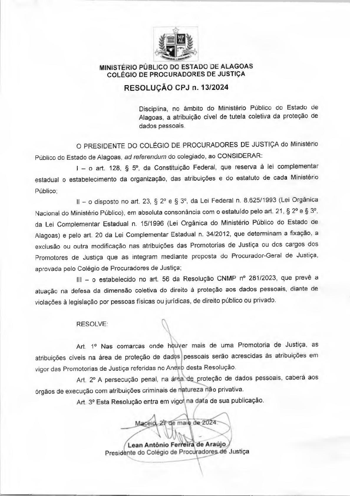 MP MINISTÉRIO PÚBLICO DO ESTADO DE ALAGOAS COLÉGIO DE PROCURADORES DE JUSTIÇA RESOLUÇÃO CPJ n. 13/2024 Disciplina, no âmbito do Ministério Público do Estado de Alagoas, a atribuição civel de tutela coletiva da proteção de dados pessoais. PRESIDENTE DO COLÉGIO DE PROCURADORES DE JUSTIÇA do Ministério Público do Estado de Alagoas, ad referendum do colegiado, ao CONSIDERAR: I - o art. 128, § 5°, da Constituição Federal, que reserva à lei complementar estadual o estabelecimento da organização, das atribuições e do estatuto de cada Ministério Público; II - o disposto no art. 23, § 2° e § 3°, da Lei Federal n. 8.625/1993 (Lei Orgânica Nacional do Ministério Público), em absoluta consonância com o estatuído pelo art. 21, § 2° e § da Lei Complementar Estadual n. 15/1996 (Lei Orgânica do Ministério Público do Estado de Alagoas) e pelo art. 20 da Lei Complementar Estadual n. 34/2012, que determinam a fixação, a exclusão ou outra modificação nas atribuições das Promotorias de Justiça ou dos cargos dos Promotores de Justiça que as integram mediante proposta do Procurador-Geral de Justiça, aprovada pelo Colégio de Procuradores de Justiça; III - - o estabelecido no art. 56 da Resolução CNMP n° 281/2023, que prevê a atuação na defesa da dimensão coletiva do direito à proteção aos dados pessoais, diante de violações à legislação por pessoas físicas ou jurídicas, de direito público ou privado. RESOLVE: Art. 1° Nas comarcas onde houver mais de uma Promotoria de Justiça, as atribuições cíveis na área de proteção de dados pessoais serão acrescidas às atribuições em vigor das Promotorias de Justiça referidas no Anexo desta Resolução. Art. 2° A persecução penal, na de proteção de dados pessoais, caberá aos órgãos de execução com atribuições criminais de natureza não privativa. Art. 3° Esta Resolução entra em na data de sua publicação. 27 de maio de 2024: Lean Antônio Ferreira de Araújo Presidente do Colégio de Procuradores dé JustiçaMP MINISTÉRIO PÚBLICO DO ESTADO DE ALAGOAS COLÉGIO DE PROCURADORES DE JUSTIÇA ANEXO Atribuições na área de proteção de dados pessoais Promotoria de Atribuições acrescidas Justiça da Capital da Capital Atribuições civeis, judiciais e extrajudiciais, na área da proteção de dados de Arapiraca de Penedo pessoais, podendo promover ações e medidas administrativas, de caráter de Delmiro difuso ou coletivo, destinadas a prevenir e reparar a violação aos dados Gouveia de Santana do pessoais nas relações de consumo, nos serviços públicos e de relevância Ipanema pública ou em relações jurídicas de outra natureza, quando se revelar de Palmeira dos Índios afetação à coletividade e nelas oficiar em qualquer juízo da comarca. de São Miguel dos Campos de Rio Largo de União dos Palmares de Coruripe da Porto Calvo de Marechal Deodoro de AtalajaMINISTÉRIO PÚBLICO DOE DIÁRIO OFICIAL DO ESTADO DE ALAGOAS ELETRÔNICO Data de 28 de maio de 2024 Edição n° 1138 03.091.1011.5226 Correições Ordinárias e Extraordinárias do Ministério Público, PO: 000751 Correições Ordinárias e Natureza de despesa: 339014 Diária, pessoal Publique-se, registre-se e WALBER JOSÉ VALENTE DE LIMA SUBPROCURADOR-GERAL ADMINISTRATIVO INSTITUCIONAL *republicada PORTARIA SPGAI n° DE 17 DE MAIO DE 2024 SUBPROCURADOR-GERAL ADMINISTRATIVO-INSTITUCIONAL DO MINISTÉRIO PÚBLICO DO ESTADO DE ALAGOAS. no uso das atribuições, e tendo em vista o contido no Expediente GED 20.08.1290.0001262/2024-98. RESOLVE conceder em favor do Dr. NAPOLEÃO JOSÉ CALHEIROS CORREIA DE MELO AMARAL FRANCO Promotor de Justiça. ora Assessor Técnico da Corregedoria Geral, de portador do CPF n° matrícula 69142, 1/2 (meia) diária, no valor unitário de R$ 343.02 (trezentos e quarenta e três reais e dois centavos), aplicando-se o desconto de R$ (vinte reais e dezessete centavos), por 1/2 (meia) diária, referente ao auxilio-alimentação de acordo com o Ato PGJ n° 7/2014, perfazendo um total de R$ 322,85 (trezentos e vinte e dois reais e oitenta e cinco em face do seu deslocamento à cidade de Arapiraca, no dia 06 de março de 2024, para realizar correição ordinária, correndo a despesa por conta da dotação orçamentária inclusa no Programa de Trabalho Correições Ordinárias e Extraordinárias do Ministério Público, PO: 000751 Correições Ordinárias e Natureza de despesa: 339014 Diária, pessoal civil. Publique-se, registre-se e cumpra-se. WALBER JOSÉ VALENTE DE LIMA SUBPROCURADOR-GERAL ADMINISTRATIVO INSTITUCIONAL *republicada PORTARIA SPGAI n° 156, DE 17 DE MAIO DE 2024 SUBPROCURADOR-GERAL ADMINISTRATIVO-INSTITUCIONAL DO MINISTÉRIO PÚBLICO DO ESTADO DE no uso das atribuições, e tendo em vista o contido no Expediente GED 20.08.1290.0001262/2024-98. RESOLVE conceder em favor do servidor RONALDO AURELIANO DO NASCIMENTO Técnico do Ministério Público de Alagoas, portador do CPF 8251835. 1/2 (meia) diária, no valor unitário de (noventa reais), aplicando-se o desconto de R$ (vinte reais e dezessete centavos), por 1/2 (meia) diária, referente ao auxílio-alimentação de acordo com Ato PGJ 7/2014, perfazendo um total de R$ 69,83 (sessenta e nove reais e oitenta e três centavos), em face do seu deslocamento à cidade de Arapiraca, no dia 06 de março de 2024 para condução de promotores para realizar correição ordinária. correndo a despesa por conta da dotação orçamentária inclusa no Programa de Trabalho 03.091.1011.5226 Correições Ordinárias e Extraordinárias do Ministério Público, PO: 000751 Correições Ordinárias e Natureza de despesa: 339014 Diária, pessoal civil. Publique-se, registre-se e cumpra-se. WALBER JOSÉ VALENTE DE LIMA SUBPROCURADOR-GERAL ADMINISTRATIVO INSTITUCIONAL "republicada Colégio de Procuradores de Justiça Resoluções RESOLUÇÃO CPJ n. 13/2024 Disciplina, no âmbito do Ministério Público do Estado de Alagoas, a atribuição civel de tu