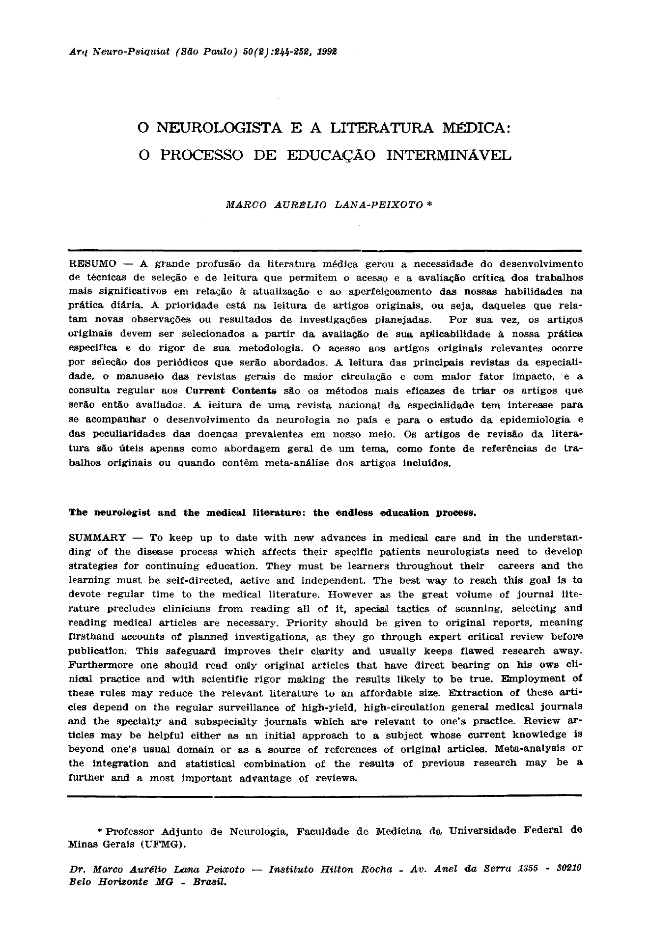 O NEUROLOGISTA E A LITERATURA MÉDICA: O PROCESSO DE EDUCAÇÃO INTERMINÁVEL MARCO AURÉLIO LANA-PEIXOTO * R E S U M O — A grande profusão da literatura médica gerou a necessidade do desenvolvimento de técnicas de seleção e de leitura que permitem o acesso e a avaliação crítica dos trabalhos mais significativos em relação à atualização e ao aperfeiçoamento das nossas habilidades na prática diária. A prioridade está na leitura de artigos originais, ou seja, daqueles que rela tam novas observações ou resultados de investigações planejadas. Por sua vez, os artigos originais devem ser selecionados a partir da avaliação de sua aplicabilidade à nossa prática específica e do rigor de sua metodologia. O acesso aos artigos originais relevantes ocorre por seleção dos periódicos que serão abordados. A leitura das principais revistas da especiali dade, o manuseio das revistas gerais de maior circulação e com maior fator impacto, e a consulta regular aos Current Contents são os métodos mais eficazes de triar os artigos que serão então avaliados. A leitura de uma revista nacional da especialidade tem interesse para se acompanhar o desenvolvimento da neurologia no país e para o estudo da epidemiologia e das peculiaridades das doenças prevalentes em nosso meio. Os artigos de revisão da litera tura são úteis apenas como abordagem geral de um tema, como fonte de referências de tra balhos originais ou quando contêm meta-análise dos artigos incluídos. The neurologist and the medical literature: the endless education process. S U M M A R Y — To keep up to date with new advances in medical care and in the understan ding of the disease process which affects their specific patients neurologists need to develop strategies for continuing education. They must be learners throughout their careers and the learning must be self-directed, active and independent. The best way to reach this goal is to devote regular time to the medical literature. However as the great volume of journal lite rature precludes clinicians from reading all of it, special tactics of scanning, selecting and reading medical articles are necessary. Priority should be given to original reports, meaning firsthand accounts of planned investigations, as they go through expert critical review before publication. This safeguard improves their clarity and usually keeps flawed research away. Furthermore one should read only original articles that have direct bearing on his ows cli nical practice and with scientific rigor making the results likely to be true. Employment of these rules may reduce the relevant literature to an affordable size. Extraction of these arti cles depend on the regular surveillance of high-yield, high-circulation general medical journals and the specialty and subspecialty journals which are relevant to one's practice. Review ar ticles may be helpful either as an initial approach to a subject whose current knowledge is beyond one's usual domain or as a source of references of original articles. Meta-analysis or the integration and statistical combination of the results of previous research may be a further and a most important advantage of reviews. * Professor Adjunto de Neurologia, Faculdade de Medicina da Universidade Federal de Minas Gerais ( U F M G ) . Dr. Marco Aurélio Lama Peixoto — Instituto Hilton Rocha - Av. Anel da Serra 1355 - 30210 Belo Horizonte MG - Brasil. It is astonishing with how Uttle readmg a doctor can practice Medicine but it is not astonishing how badly he may do it. Sir WILLIAM OSLER É inestimável o benefício que o progresso das ciências biomédicas traz para nossa prática diária, tanto em relação à compreensão dos fenômenos da doença quanto à qualidade da assistência que oferecemos a nossos pacientes. No entanto, o volume de informações é tão grande e publicado em um sem-número de diferentes periódicos que muitos médicos se sentem frequentemente impotentes e desorientados diante das estantes das bibliotecas. Mais de dois milhões de artigos são publicados anualmente nas revistas biomédicas i. O primeiro sentimento que o médico pode ter ao deparar com os recém-che gados números das revistas médicas em uma biblioteca é o de espanto e de admiração, seguidos logo pela triste consciência de sua incapacidade de ler e acompanhar todo o desenvolvimento das diferentes áreas da medicina. O simples passar de olhos sobre os índices de alguns periódicos lhe mostrará, de imediato, quão desatualizados já se encontram seus conhecimentos até pela dificuldade de compreensão de alguns títulos dos artigos ali dispostos. As palavras já não são familiares, os novos termos soam agressivos, e aquelas doenças listadas comportadamente em seus livros-textos agora lhe parecem rebeladas, inexoravelmente soltas da estrutura de seu conhecimento, amea çando sua própria auto-confiança. É tão desagradável esta percepção que muitos tombam ao primeiro embate. A literatura médica passa ser vista como esotérica, distante da realidade terrena de nossa vida profissional. As visitas às bibliotecas tornam-se então raras, a maioria das vezes apenas para a busca de uma referência específica. E as soluções dos pro blemas da prática do dia-a-dia, nas enfermarias e consultórios, serão ainda procu radas nos livros-textos e monografias. O resultado de tal comportamento é a disso ciação, cada vez maior, entre a qualidade da assistência efetivamente prestada aos doentes e aquela possível e devida, baseada em novos conceitos advindos de trabalhos realizados e já publicados. O lapso de tempo entre uma informação publicada em um periódico até seu aparecimento em livro-texto é de anos, já que entre a pena do autor e a edição de um livro transcorrem, em geral, mais de dois anos 9. Até que o livro chegue às nossas mãos é possível que os outros dois anos também já tenham passado! Isto sem contar que a latência para a publicaç