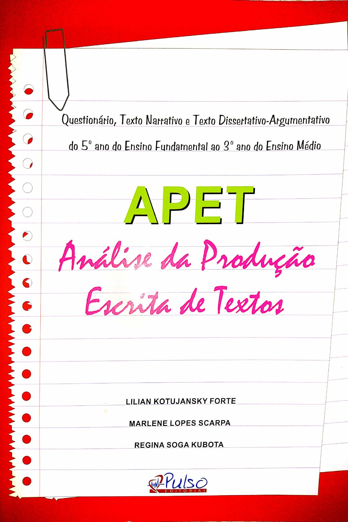 Questionário, Texto Narrativo e Texto do 5° ano do Ensino Fundamental ano do Ensino Médio APET Analise da de Textos LILIAN KOTUJANSKY FORTE MARLENE LOPES SCARPA REGINA SOGA KUBOTA Pulso DITO RIALAPET ANÁLISE DA PRODUÇÃO ESCRITA DE TEXTOS QUESTIONÁRIO, TEXTO NARRATIVO E TEXTO DISSERTATIVO-ARGUMENTATIVO do ano do Ensino Fundamental ao ano do Ensino Médio LILIAN KOTUJANSKY FORTE MARLENE LOPES SCARPA REGINA SOGA KUBOTACopyright 2014 by Pulso Editorial Ltda. ME Avenida Anchieta, 885 (Jardim Nova América) São José dos Campos - SP. CEP 12242-280 - Telefone/Fax: (12) 3942-1302 e-mail: home-page: http://www.pulsoeditorial.com.br Impresso no Brasil/Printed in Brazil, com depósito legal na Biblioteca Nacional conforme Decreto no. 1.825, de 20 de dezembro de Todos os direitos reservados É proibida a reprodução total ou parcial de qualquer parte desta edição. A violação dos direitos de autor (Lei no 5.988/73) é crime estabelecido pelo artigo 184 do Código Penal. Editor responsável: Vicente José Assencio Ferreira Ilustrações: Simone Soga Diagramação e capa: Alexandre Marinho Vicente Impressão e acabamento: Viena Gráfica e Editora Dados Internacionais de Catalogação na Publicação (CIP) (Câmara Brasileira do Livro, SP, Brasil) Forte, Lilian Kotujansky APET : Análise da Produção Escrita de Textos : questionário, texto narrativo e texto dissertativo-argumentativo : 5° ano do ensino fundamental ao ano do ensino médio / Lilian Kotujansky Forte, Marlene Lopes Scarpa, Regina Soga Kubota. -- São José dos Campos, SP : Pulso Editorial, 2014. Bibliografia. ISBN 978-85-8298-007-1 1. Análise do discurso 2. Aprendizagem 3. Comunicação escrita 4. Escrita 5. Fonoaudiologia 6. Leitura Dificuldades 7. Português Gramática 8. Português Redação I. Scarpa, Marlene Lopes. II. Kubota, Regina Soga. III. Título. CDD-616.855 13-11417 Índices para catálogo sistemático: 1. APET : Análise da Produção Escrita de Textos : Fonoaudiologia 616.855SOBRE AS AUTORAS LILIAN KOTUJANSKY FORTE Fonoaudióloga clínica PUC/SP. Pós-graduação lato sensu em Psicopedagogia - Unicid. Aprimoramento em Neurociências e Aprendizagem - Cefac/SP. Formação em Dislexia - Associação Brasileira de Dislexia. Ministra cursos e dá assessoria no uso da Informática Educacional e da Informática Terapêutica. Escreveu o capítulo "A tecnologia informática e suas aplicações em terapia de leitura e escrita" e, em parceria, o capítulo "Internet um trabalho sem fronteiras" do livro "A tecnologia infor- mática na fonoaudiologia". São Paulo: Plexus Editora, 1998. Atuou em Informática Educacional para Educação Infantil e Ensino Fundamental. Associada da International Reading Association e da Associação Brasileira de Dislexia. Ampla experiência clínica na área de Linguagem Oral e Escrita. Escreve no site/blog Fonológica sobre assuntos relacionados à fonoaudiologia. MARLENE LOPES SCARPA Fonoaudióloga clínica - PUC/SP. Aperfeiçoamento em Distúrbios da Comunicação (Programa de Mestrado) - PUC/SP. Aprimoramento em Linguagem, Aprendizagem e Neurociências - Cefac/SP. Aprimoramento prático em Neurociências e Aprendizagem - Cefac/SP. Formação em Dislexia Associação Brasileira de Dislexia. Ministra cursos e palestras sobre as Dificuldades de Leitura e Escrita para pais e professores. Autora do Livro "Exercícios para construir a Leitura, Escrita e Ortografia", Vol. 1 e 2. Pulso Editorial. Autora do livro "Leiturinha - Material de Intervenção para crianças e adolescentes com Dificul- dades de Aprendizagem (em parceria com a fga. Isabela Lopes Scarpa). Pulso Editorial. Há mais de 25 anos atende crianças e adolescentes com Distúrbios de Linguagem Oral e Escrita. REGINA SOGA KUBOTA Fonoaudióloga clínica - Unifesp - Escola Paulista de Medicina. Pós-graduação lato sensu em Psicopedagogia - Unicid. Formação na Metodologia Verbotonal - Centro Suvag de Reabilitação Auditiva e da Fala São Paulo. Ministrou aula para alunos do Curso de Graduação em Fonoaudiologia da Faculdade de Medi- cina da Universidade de São Paulo com o tema "Instituto Santa Teresinha: tradição na educa- ção do deficiente auditivo." Ministrou o Curso Optativo: "O surdo e a aprendizagem" promovido por DOT Educação Espe- cial/Centro Suvag de Reabilitação Auditiva e da Fala. Conhecimento e uso da Língua Brasileira de Sinais (Libras). Atendimento clínico a surdos, desde 1988, no Instituto Santa Teresinha - Escola para surdos. Fonoaudióloga clínica da Prefeitura de Taboão da Serra.AGRADECIMENTOS Ao querido e inesquecível Frank, companheiro maravilhoso, com quem tive o privilégio de conviver e de aprender o verdadeiro amor. Ao meu filho Alexandre, raio de luz em minha vida. Lilian À minha família e especialmente para Lorenzo, Tales, Edgar e Cecília Marlene Para Paulo e às minhas filhas Cinthia e Fernanda. Aos meus pais por sempre me incentivarem e apoiarem, e pela atenção, carinho e amor com que se dedicaram às netas. Regina À amiga fonoaudióloga Elisa Maria Raposo pelas contribuições iniciais nesta jornada. À professora doutora Flávia Benevides Foz cujas observações ajudaram a melhorar a apresentação deste trabalho. fonoaudiólogas Eliza Hitomi Sakata e Isabela Lopes Scarpa pela aplicação da APET em seus pa- cientes. Aos nossos pacientes que nos estimularam a desenvolver a APET Lilian, Marlene e ReginaAPRESENTAÇÃO É com enorme prazer que faço a apresentação da Análise da Produção Escrita de Textos APET. Inicialmente elogio a iniciativa das colegas Lilian, Marlene e Regina que perceberam, no dia a dia da prática clínica com os distúrbios de aprendizagem, a demanda de um material específico para a avaliação das produções escritas. Encorajadas por essa carência, assumiram o compromisso com o desenvolvimento deste material. Certamente dedicaram muito tempo às discussões, estudos, revisões, horas e horas de trabalho, tudo isso com um objetivo comum: enriquecer a fono