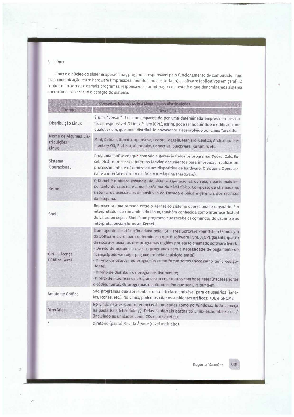 8. Linux Linux é o núcleo do sistema operacional, programa responsável pelo funcionamento do computador, que faz a comunicação entre hardware (impressora, monitor, mouse, teclado) e software (aplicativos em geral). o conjunto do kernel e demais programas responsáveis por interagir com este é o que denominamos sistema operacional. o kernel é coração do sistema. Conceitos básicos sobre Linux e suas distribuições Termo Descrição É uma "versão" do Linux empacotada por uma determinada empresa ou pessoa Distribuição Linux responsável. o Linux é livre (GPL), assim, pode ser adquirido e modificado por qualquer um, que pode distribui-lo novamente. Desenvolvido por Linus Torvalds. Nome de Algumas Dis- Mint, Debian, Ubuntu, openSuse, Fedora, Mageia, Manjaro, CentOS, ArchLinux, ele- tribuições mentary Red Hat, Mandrake, Conectiva, Slackware, Kurumin, etc. Linux Programa (software) que controla e gerencia todos os programas (Word, Calc, Ex- Sistema cel, etc.) e processos internos (enviar documentos para impressão, realizar um Operacional processamento, etc.) dentro de um dispositivo de hardware. o Sistema Operacio- nal é a interface entre usuário e a máquina (hardware). o Kernel o núcleo essencial do Sistema Operacional, ou seja, a parte mais im- portante do sistema e a mais próxima do nível Composto de chamada ao Kernel sistema, de acesso aos dispositivos de Entrada e e gerência dos recursos da máquina. Representa uma camada entre o Kernel do sistema operacional e usuário. É o interpretador de comandos do Linux, também conhecida como Interface Textual Shell do Linux, ou seja, Shell é um programa que recebe os comandos do usuário e os interpreta, enviando-os ao Kernel. É um tipo de classificação criada pela FSF Free Software Foundation (Fundação do Software Livre) para determinar que é software livre. A GPL garante quatro direitos aos usuários dos programas regidos por ela (o chamado software livre): Direito de adquirir e usar os programas sem a necessidade de pagamento de GPL Licença licença (pode-se exigir pagamento pela aquisição em si); Geral Direito de estudar os programas como foram feitos (necessário ter o código- -fonte); Direito de distribuir os programas Direito de modificar os programas ou criar outros com base neles (necessário ter o código fonte). Os programas resultantes têm que ser GPL São programas que apresentam uma interface amigável para os (jane- Ambiente Gráfico las, icones, etc.). No Linux, podemos citar os ambientes gráficos: KDE e GNOME. No Linux não existem referências às unidades como no Windows. Tudo começa Diretórios na pasta Raiz (chamada /). Todas as demais pastas do Linux estão abaixo de / (incluindo as unidades como CDs ou disquetes). (pasta) Raiz da mais alto) Rogério Vassoler 619Conceitos básicos sobre Linux e suas distribuições Termo Descrição que guarda os pessoais dos referente a pasta "Meus /home Diretório que contem os arquivos dos dispositivos (referências ao hardware). /dev Os arquivos dentro deste diretório são atalhos aos equipamentos de hardware (como disco, teclado, mouse, etc.). /root Pasta pessoal ("Meus Documentos") do superusuário (administrador). Possui os arquivos executáveis (programas) - é como "Arquivos de Programas" /bin no Windows. /etc Possui os arquivos de configuração do Sistema Operacional e dos aplicativos. /boot Contém os arquivos de inicialização do sistema. o diretório /dev possui arquivos que representam os dispositivos de hardware do computador. Desde o teclado e mouse até HD e gravador de CD são represen- /Dev (Devices) tados por arquivos de /dev. Esses arquivos ainda não estão prontos para serem acessados diretamente, é necessário usar um comando (mount) para criar uma pasta que os acesse. Ls (List = Listar) Listar o conteúdo de um diretório. cd (Change Diretory = Entrar em um Mudar de Pwd Mostrar diretório onde estou posicionado. mkdir (Make Directory Criar um diretório. Criar Diretório) rmdir (Remover Dire- Apagar um diretório. tório) tree Mostrar a estrutura de Clear Limpar a tela. mv (mover) Mover (renomear) arquivos ou rm (remover arquivos Remover arquivos ou e cp (copiar) Copiar arquivos ou chmod (Change Mode Mudar o modo de acesso ao arquivo. ou Mudar modo) chown (Change Owner Mudar proprietário do arquivo. ou Mudar dono) usaradd (Adicionar Criar uma nova conta de usuário. usuário) groupadd (Adicionar Criar uma novo grupo de usuário. grupo) passwd (password = Alterar a senha do senha) su (Super User ou Su- Atribuir a definição de super a um usuário comum. per 620 InformáticaConceitos básicos sobre Linux e suas distribuições Termo Descrição Who Verificar quem está logado. man (manuais) Acessar as páginas dos manuais do sistema. exit (log-off) Efetuar logoff do sistema. o Linux é um sistema que necessita de autenticação do para ser usado. Podem existir diversos usuários no sistema, entretanto, o da conta root Super (root) é o "Manda Chuva" no Sistema Linux. o usuário root é conhecido como "Super Usuário" ou Administrador e tem acesso a todos os arquivos e pastas do sistema. o Shell solicita comandos através de um prompt. Se o último simbolo do prompt $ for "$", significa que o usuário em questão é um usuário comum. o Shell solicita comandos através de um prompt. Se o último simbolo do prompt # for "#", significa que o usuário em questão é root (super usuário). o Linux é case-sensitive, ou seja, faz diferença entre maiúsculas e nos nomes de arquivos, assim: Editora2b.txt editora2b.txt e EDITORA2B.TXT são Nomenclatura dos Ar- arquivos diferentes. o único caractere que não é aceito pelo ambiente gráfico quivos do sistema Linux para nomear arquivos é a /(barra). São aceitos no 255 caracteres. REFERÊNCIAS 10. Suporte Microsoft em https://su- acesso em 1. Disponível em 11. A. S. Redes de Computadores. Editora acesso em 27/12/2016. Campus, Edição, 2003. 2. CAPRON, H.L. e J.A. Introdução à 12