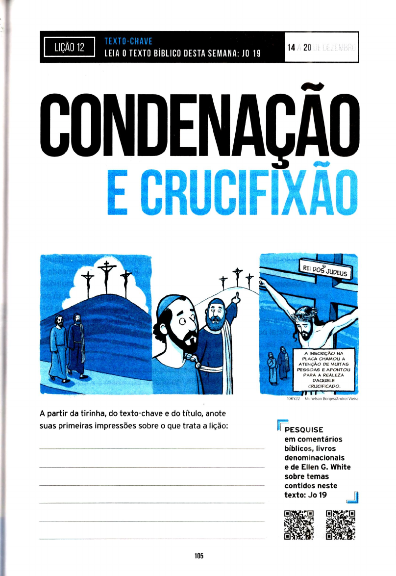 TEXTO-CHAVE 12 DE DEZEMBRU LEIA TEXTO BÍBLICO DESTA SEMANA: JO 19 CONDENAÇÃO E CRUCIFIXAO DOS JUDEUS A INSCRIÇÃO NA PLACA CHAMOU A ATENÇÃO DE MUITAS PESSOAS E APONTOU PARA A REALEZA DAQUELE 10KY22 Mi Borges/Andrei Vieira A partir da tirinha, do texto-chave e do título, anote suas primeiras impressões sobre o que trata a lição: PESQUISE em comentários bíblicos, livros denominacionais e de Ellen G. White sobre temas contidos neste texto: Jo 19 105COM 15 DE DEZEMBRO 0 REI DOS JUDEUS a última lição observamos que as rei (Jo 19:5). Ele alegou que pretendia ações de Pilatos podem ser divididas mostrar que não encontrava culpa em em sete cenas. Durante esta semana Jesus (Jo 19:4; 18:38). A responsabi- vamos explorar as quatro cenas fi- lidade de Pilatos como governador e nais e seus desdobramentos (Jo 19:1-3; juiz era simplesmente libertar Jesus. 19:4-7; 19:8-11; 19:12-16). As escolhas de Talvez ele quisesse despertar simpatia Pilatos levaram à condenação e à mor- por Cristo, que estava ferido e ensan- te de Jesus. guentado. Se esse for o caso, a ideia A quarta cena é bastante concisa. falhou completamente. Pilatos estava de volta ao Pretório com Pela primeira vez, a palavra "cru- Jesus. Os judeus reagiram com zom- cificar" aparece no enredo. Não foi a baria à sugestão de Pilatos de libertar multidão quem primeiro exigiu isso. Jesus e, em vez disso, exigiram soltar Os principais sacerdotes e os guar- Barrabás (Jo 18:38-40). Pilatos decidiu das gritaram: "Crucifique! Crucifique!" açoitar o prisioneiro, apesar de não (Jo 19:6). Possivelmente temendo a haver condenação oficial (Jo 19:1). Os influência de Jesus sobre a multidão, soldados zombaram de Jesus e for- eles tomaram a dianteira. Uma só pa- çaram a usar uma coroa de espinhos, lavra, "Crucifique! Crucifique!", se tor- e o que provavelmente era o manto nou o refrão fácil de ser repetido. de algum oficial ou nobre (Jo 19:2, 3). o evangelho de João chama nossa atenção para a descrição de Cristo como rei dos judeus. Para os romanos, caçoar de Jesus dessa forma também era zomban da fé judaica, mas, ao fazê- lo, estavam sem queren reconhecendo que Jesus é Rei. Começou então a quinta cena e, a partir daí, todos se envolveram. Pila- tos trouxe Jesus ainda vestido como Acesse: MERGULHE + FUNDO Leia, de Ellen G. White, Desejado de Todas as Nações, capítulo 78: "O Calvário". 106COM PREENDA SEGUNDA. 16 DE DEZEMBRO D or fim, os líderes religiosos expressa- Pilatos sentou-se no tribunal para ram a Pilatos sua verdadeira intenção: emitir o veredito por volta da hora queriam ver Jesus crucificado por- sexta, que era meio-dia 14). povo que Ele alegava ser divino (Jo 19:7). deveria ter parado de trabalhar, retira- Pilatos temia receber o castigo de do todo fermento de suas casas e se Deus, caso Jesus fosse realmente o preparado para a refeição da Páscoa. Filho Dele. De acordo com o pensa- Em vez disso, estava pedindo que al- mento comum da época, os deuses guém fosse crucificado. podiam assumir a forma humana Quando Pilatos declarou: "Eis aqui (veja At 14:11). A reação de Pilatos o rei de vocês" (Jo 19:14), ele involun- refletiu o pavor de encontrar um ser tariamente deu aos judeus a última divino que pudesse se vingar de qual- chance de aceitarem Jesus como tal. quer um que o maltratasse. Deixando de lado séculos de espera Motivado pelo crescente pânico, o por aquele exato momento, os líderes governador retirou-se para o palácio, judeus oficializaram a rejeição a Jesus, dando abertura à sexta cena (Jo 19:8, 9). declarando de maneira enfática: "Não Pilatos estava ansioso para conhecer temos rei, senão César!" 15). a origem de Cristo será que Ele vi- nha da Terra ou do Céu? Jesus não respondeu. Pilatos então ostentou a autoridade que tinha para libertar Cristo (v. 10). Jesus deixou claro que Ele, e não Pilatos, tem poder sobre a vida e a morte (Jo 19:11; 10:18). As últi- mas palavras de Jesus sensibilizaram Pilatos profundamente, e ele redobrou seus esforços para libertar o Prisionei- ro (Jo 19:12). Assim abre a sétima e úl- tima cena dessa parte do drama. Pilatos se voltou para a multidão, PENSE que atacou seu ponto fraco: a desleal- dade ao imperador (Jo 19:12). Os judeus Pilatos tinha sentimentos bastante confusos sobre julgamento de insistiram que Jesus era contrário a Jesus. que levou na direção César, e a inquietação de Pilatos au- errada? Como podemos evitar mentou. Ele temia pôr em risco sua essa mesma armadilha em nossos carreira política ao proteger aquele próprios conflitos espirituais? Homem que afirmava ser rei. 107COMENTE 17 DE DEZEMBRO CRUCIFIXÃO o início do ministério de Cristo, João João deixa de lado a agonia e os de- Batista apresentou como o "Cordeiro talhes da crucifixão. Ele simplesmen- de Deus, que tira o pecado do mundo" te registra que Jesus foi crucificado (Jo 1:29). Toda primavera, os adorado- (Jo 19:18). Essa era uma forma de res que viajavam a Jerusalém para a execução humilhante e cruel. A ideia festa da Páscoa eram lembrados do de que o Rei, o Messias pudesse ser sangue do cordeiro que os tinha sal- crucificado era absurda e altamente vado 12:12, 13, 21-28). Enquanto os ofensiva (1Co 1:18-25). Para os roma- adoradores se reuniam para mais uma nos, gregos e judeus que não acredi- cerimônia pascal, o verdadeiro Cordei- tavam em Jesus, o fato de Ele ter sido ro pascal estava sendo levado à morte. crucificado forneceu uma evidência A morte de Cristo coincidiu com o sa- clara de que Ele era uma fraude. No crifício da Páscoa. Jesus é o Eu Sou, entanto, Jesus obteve triunfo e vitó- o Rei e o Cordeiro pascal. Só podemos ria exatamente por meio dessa morte começar a compreender o significado horrível. da morte de Cristo em nosso favor se Jesus não foi totalmente abandona- percebermos quem Ele realmente é. do pelos seres humanos. Um grupo de Tendo obtido a aprovação de Pilatos, mulheres estava perto da cruz, junto os 