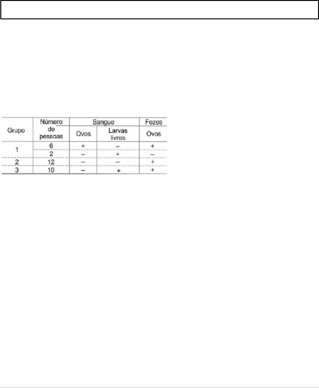 ausência (–) de ovos e de larvas livres no sangue e de ovos nas fezes. Os resultados dos exames apontaram três