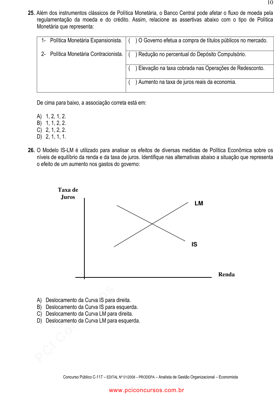 pcimarkpci MDAwMDowMDAwOjAwMDA6MDAwMDowMDAwOmZmZmY6YmZiOTphZTFk:U2F0LCAxNSBGZWIgMjAyNSAxMDowODoxNCAtMDMwMA== www.pciconcursos.com.br Concurso Público C-117 – EDITAL Nº 01/2008 – PRODEPA – Analista de Gestão Organizacional – Economista 10 Taxa de Juros Renda LM IS 25. Além dos instrumentos clássicos de Política Monetária, o Banco Central pode afetar o fluxo de moeda pela regulamentação da moeda e do crédito. Assim, relacione as assertivas abaixo com o tipo de Política Monetária que representa: ( ) O Governo efetua a compra de títulos públicos no mercado. ( ) Redução no percentual do Depósito Compulsório. ( ) Elevação na taxa cobrada nas Operações de Redesconto. 1- Política Monetária Expansionista. 2- Política Monetária Contracionista. ( ) Aumento na taxa de juros reais da economia. De cima para baixo, a associação correta está em: A) 1, 2, 1, 2. B) 1, 1, 2, 2. C) 2, 1, 2, 2. D) 2, 1, 1, 1. 26. O Modelo IS-LM é utilizado para analisar os efeitos de diversas medidas de Política Econômica sobre os níveis de equilíbrio da renda e da taxa de juros. Identifique nas alternativas abaixo a situação que representa o efeito de um aumento nos gastos do governo: A) Deslocamento da Curva IS para direita. B) Deslocamento da Curva IS para esquerda. C) Deslocamento da Curva LM para direita. D) Deslocamento da Curva LM para esquerda. www.pciconcursos.com.br pcimarkpci MDAwMDowMDAwOjAwMDA6MDAwMDowMDAwOmZmZmY6YmZiOTphZTFk:U2F0LCAxNSBGZWIgMjAyNSAxMDowODoxNCAtMDMwMA== www.pciconcursos.com.br Concurso Público C-117 – EDITAL Nº 01/2008 – PRODEPA – Analista de Gestão Organizacional – Economista 11 27. Considere os seguintes dados de Conta Nacional (valores em bilhões de dólares) e identifique abaixo a alternativa que contém, respectivamente: o Produto Nacional Bruto, o Produto Nacional Líquido e a Renda Nacional: Consumo 750 Gastos Governamentais de Bens e Serviços 500 Investimentos 75 Exportações 20 Importações 10 Depreciação 250 Impostos Indiretos 100 A) 1.085; 1.335 e 985. B) 985; 1.335 e 1.085. C) 1.335; 985 e 1.085. D) 1.335; 1.085 e 985. 28. Em linhas gerais, pode-se dizer que o investimento agregado é determinado por dois fatores básicos: a taxa de rentabilidade esperada e a taxa de juros de mercado. Neste sentido o correto está em: A) se a taxa de retorno do empreendimento superar a taxa de juros de mercado, haverá investimentos na compra de bens de capital. B) a demanda de investimentos não pode ser afetada pela disponibilidade de fundos de longo prazo. C) se a taxa de retorno do mercado produtivo for maior que a taxa de juros, há preferência em direcionar os recursos em aplicações financeiras ou especulativas. D) a rentabilidade esperada dos projetos interfere na ampliação da capacidade produtiva, independentemente da eficiência marginal do capital. 29. Em se tratando do mercado cambial, encontram-se entre os agentes participantes do mesmo os vendedores (possuidores de divisas estrangeiras) e compradores (aqueles que demandam moedas estrangeiras). Nesse caso, identifica-se entre os vendedores no mercado de câmbio: A) turistas procedentes do exterior. B) importadores de máquinas e equipamentos. C) turistas nacionais que viajam para o exterior. D) devedores de empréstimos externos. 30. Na atual conjuntura do mercado cambial brasileiro, a taxa de câmbio em relação ao dólar norte-americano encontra-se em situação de valorização da moeda nacional – o Real, tendo atingido, em determinadas ocasiões, cotações abaixo de R$1,65. Nesta situação, podemos dizer que o Real valorizado: A) favorece as exportações. B) desestimula o turismo do país para o exterior. C) estimula as importações. D) estimula as operações de crédito contingenciado. 31. Muito embora o livre comércio entre países apresente inúmeras vantagens, alguns países, sob a justificativa de proteger uma indústria considerada estratégica para a economia nacional, adotam as chamadas “medidas protecionistas”. Dentre as medidas protecionistas que podem ser adotadas pelos paises em relação ao comércio internacional, destaca-se o (a): A) redução dos juros referentes aos financiamentos de produtos importados. B) subsídios à exportação. C) aumento das tarifas aos produtos exportados. D) redução dos impostos de importação. www.pciconcursos.com.br