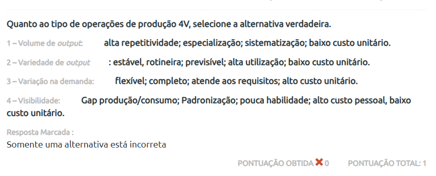 Quanto ao tipo de operações de produção 4V, selecione a alternativa verdadeira. 1 - Volume de alta repetitividade; especialização; sistematização; baixo custo unitário. 2 -Variedade de output : estável, rotineira; previsível; alta utilização; baixo custo unitário. 3 - Variação na demanda: flexível; completo; atende aos requisitos; alto custo unitário. 4- - Visibilidade: Gap produção/consumo; Padronização; pouca habilidade; alto custo pessoal, baixo custo unitário. Resposta Marcada : Somente uma alternativa está incorreta PONTUAÇÃO OBTIDA x 0 PONTUAÇÃO TOTAL: 1