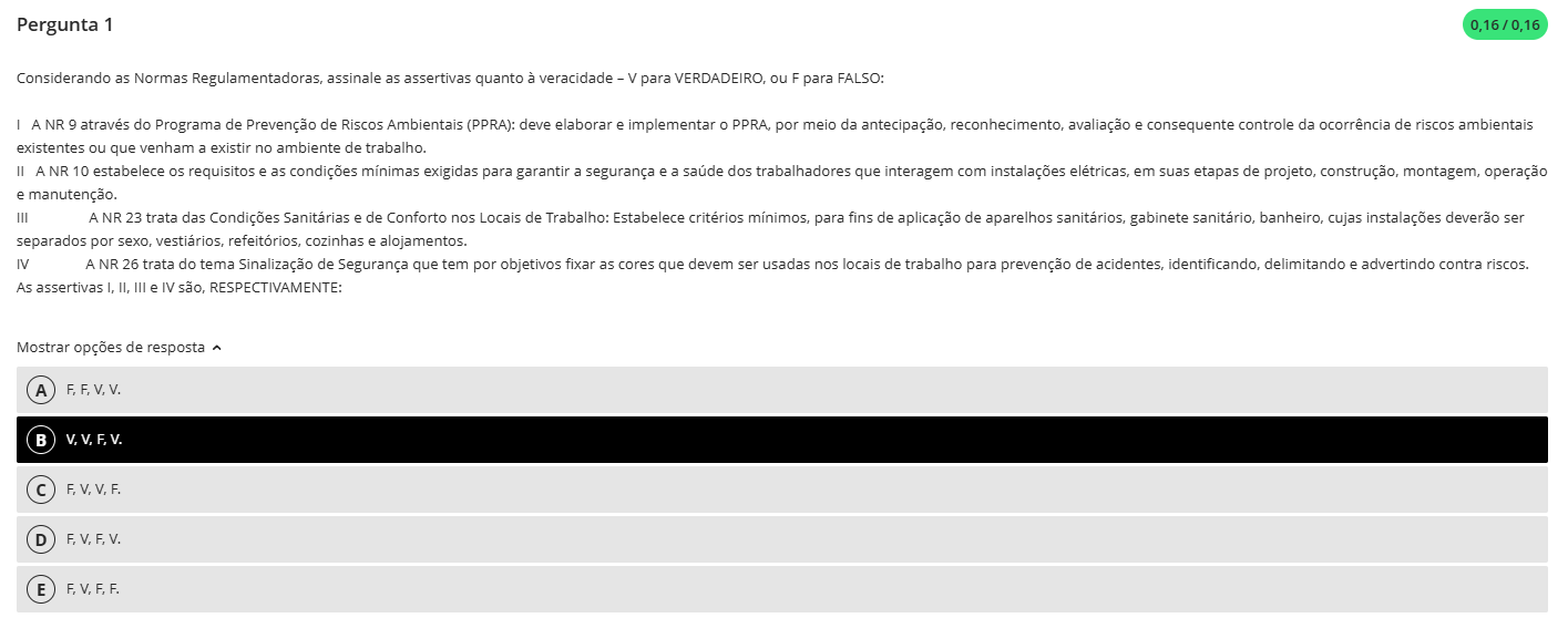 Pergunta 1 0,16/0,16 Considerando as Normas Regulamentadoras, assinale as assertivas quanto à veracidade - para ou F para FALSO: I A NR 9 através do Programa de Prevenção de Riscos Ambientais (PPRA): deve elaborar e implementar PPRA, por meio da antecipação, reconhecimento, avaliação e consequente controle da ocorrência de riscos ambientais existentes ou que venham a existir no ambiente de trabalho. II A NR 10 estabelece os requisitos e as condições mínimas exigidas para garantir a segurança e a saúde dos trabalhadores que interagem com instalações elétricas, em suas etapas de projeto, construção, montagem, operação e manutenção. III A NR 23 trata das Condições Sanitárias e de Conforto nos Locais de Trabalho: Estabelece critérios mínimos, para fins de aplicação de aparelhos sanitários, gabinete sanitário, banheiro, cujas instalações deverão ser separados por sexo, vestiários, refeitórios, cozinhas e alojamentos. IV A NR 26 trata do tema Sinalização de Segurança que tem por objetivos fixar as cores que devem ser usadas nos locais de trabalho para prevenção de acidentes, identificando, delimitando e advertindo contra riscos. As assertivas I, II. III e IV são, RESPECTIVAMENTE: Mostrar opções de resposta A F. V. V. B V, F. D F, V. F.V. E F, F, F.