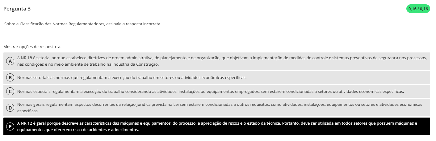 Pergunta 3 0,16/0,16 Sobre a Classificação das Normas assinale a resposta incorreta. Mostrar opções de resposta A NR 18 é setorial porque estabelece diretrizes de ordem administrativa, de planejamento e de organização, que objetivam a implementação de medidas de controle e sistemas preventivos de segurança nos processos, A nas condições e no meio ambiente de trabalho na Indústria da Construção. B Normas setoriais as normas que regulamentam a execução do trabalho em setores ou atividades econômicas específicas. Normas especiais regulamentam a execução do trabalho considerando as atividades, instalações ou equipamentos empregados, sem estarem condicionadas a setores ou atividades econômicas específicas. Normas gerais regulamentam aspectos decorrentes da relação jurídica prevista na Lei sem estarem condicionadas a outros requisitos, como atividades, instalações, equipamentos ou setores e atividades econômicas D específicas A NR 12 é geral porque descreve as características das máquinas e equipamentos, do processo, a apreciação de riscos e estado da técnica. Portanto, deve ser utilizada em todos setores que possuem máquinas e E equipamentos que oferecem risco de acidentes e adoecimentos.