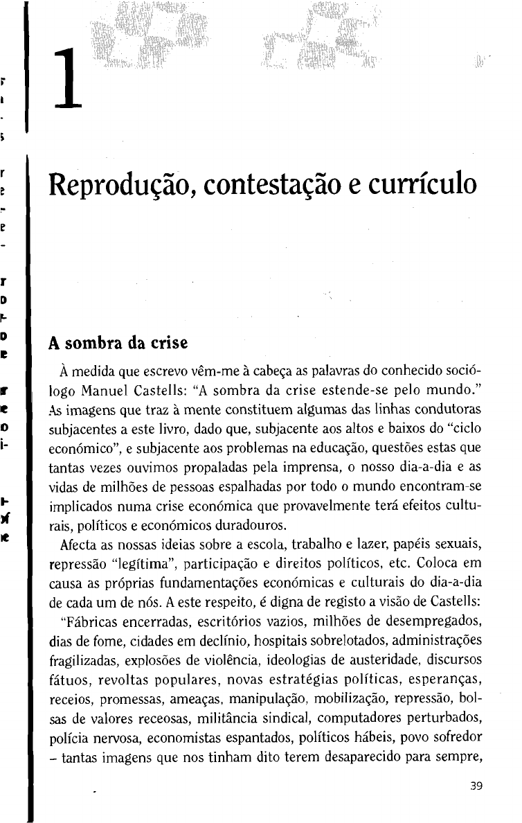 Reprodução, contestação e currículo A sombra da crise A medida que escrevo vêm-me à cabeça as palavras do conhecido soció- logo Manuel Castells: "A sombra da crise estende-se pelo mundo." .As imagens que traz a mente constituem algumas das linhas condutoras subjacentes a este livro, dado que, subjacente aos altos e baixos do "ciclo económico", e subjacente aos problemas na educação, questões estas que tantas vezes ouvimos propaladas pela imprensa, o nosso dia-a-dia e as vidas de milhões de pessoas espalhadas por todo o mundo encontram-se implicados numa crise económica que provavelmente terá efeitos cultu- rais, políticos e económicos duradouros. Afecta as nossas ideias sobre a escola, trabalho e lazer, papéis sexuais, repressão "legítima", participação e direitos políticos, etc. Coloca em causa as próprias fundamentações económicas e culturais do dia-a-dia de cada um de nós. A este respeito, é digna de registo a visão de Castells: "Fábricas encerradas, escritórios vazios, milhões de desempregados, dias de fome, cidades em declínio, hospitais sobrelotados, administrações fragilizadas, explosões de violência, ideologias de austeridade, discursos fátuos, revoltas populares, novas estratégias políticas, esperanças, receios, promessas, ameaças, manipulação, mobilização, repressão, bol- sas de valores receosas, militância sindical, computadores perturbados, polícia nervosa, economistas espantados, políticos hábeis, povo sofredor - tantas imagens que nos tinham dito terem desaparecido para sempre, levadas pelo vento do capitalismo pós-industrial. E agora encontram-se novamente de regresso, trazidas pelo vento da crise capitalista."' Os media não permitem que escapemos a estas imagens. Quanto mais não seja, a sua repetição e o facto de não podermos deixar de observá-las I e experimentá-las testemunham a sua realidade. A crise não é ficção. Pode ser vista diariamente no local de trabalho, nas escolas, nas famí- lias, governo, instituições de segurança social, enfim, em tudo aquilo que nos rodeia. i Nesta conformidade, as instituições políticas e educativas têm vindo a perder grande parte da sua legitimidade à medida que o aparelho do Estado se vai vendo incapaz de responder, adequadamente, ao actual quadro económico e ideológico. Aquilo que se tem denominado por crise fiscal do Estado tem emergido à medida que o Estado se vê impos- sibilitado em manter os postos de trabalho, os programas e os serviços conquistados pelas pessoas, após anos de luta. Simultaneamente, os recursos culturais da sociedade tornam-se, cada vez mais, comercializa- dos, à medida que a cultura popular é invadida pelo processo de mer- cantilização. Deste modo, são processados, comprados e vendidos. Transformaram-se também em mais um aspecto da acumulação. Embora vincadamente relacionada com os processos de acumulação de capital, a crise não é somente económica. Também é política, cultu- ral e ideológica. Na verdade, é na intersecção destas três esferas da vida social, no modo como interactuam, no modo como cada uma apoia e contradiz as outras que podemos ver a crise na sua forma completa. A crise estrutural que testemunhamos actualmente - ou melhor, vivemos n - não pode na verdade ser "explicada" apenas por razões económicas (seria uma análise demasiado mecanicista), mas sim por um todo social, por cada uma das esferas referidas. Tal como sugere Castells: "a economia não é um 'mecanismo: mas sim um processo social con- tinuamente modelado e remodelado pelas relações em permanente mudança da espécie humana com as forças produtivas e pelos confli- tos de classe que definem a espécie humana de uma forma concreta - historicamente. 'Q ' Castells. Manuel (1 980) The Econornfc Crisfs and Arnerican Society Princeton Princeton University Press, p 3 i Ibid. p 12 Dentro desta problematica estabeleça tambem uma comparaçao com os argumentos de Althusser acerca da relativa autonomia das esferas cultural. politica e economica Althusser. Louis (1971) Lenrn and Philosophy and Other Essays London New Left Books 40 Reprodução, contestasáo e curriculo d te us as 0. ií- I0 1 a do Ia1 O r M- ps os ra- tr- bs. $0 tu- i da B e . A 10s cas ial, ra da W e r Daqui inferirmos de que não é apenas através de uma determinada abstracção como a economia que podemos encontrar a génese dos tem- pos difíceis que vivemos. Pelo contrário, as palavras-chave são luta e modelação, que nos remetem para questões estruturais. Os nossos pro- blemas são sistémicos, construindo-se uns nos outros. Cada aspecto do processo social no estado e na política, na vida cultural, nos modos de produzir, distribuir e consumir serve para afectar as relações com (e entre) os outros. A medida que um modo de produção tenta reproduzir as condições da sua própria existência, cria antagonismos e contradições junto de outras esferas. A medida que grupos de pessoas lutam por questões relaciona- das com o género, a raça e a classe, em cada uma destas esferas, o pro- cesso social global, incluindo a "economia", também é afectado. As lutas e o terreno onde se precipitam são remodelados. Deste modo, as imagens das lutas que Castells traz à colação não são estáticas, na medida em que são vividas por pessoas como nós, no nosso dia-a-dia (talvez, usualmente, "de uma forma inconsciente"). E, cons- tantemente, grupos de pessoas como estas modelam e são remodelados por estes processos, à medida que os conflitos eclodem. Embora a crise descrita por Castells não seja totalmente económica, a profundidade com que é sentida no plano económico deve ser enfati- zada, quanto mais não seja para salientar a sua amplitude. Na verdade, alguns indicadores são chocantes. Embora as taxas ofi- ciais de desemprego, que rondam os 7%-8%, sejam já suficientemente más, a taxa real de desemprego nos Estados Unidos pode rondar os 14%. Embora os números só a