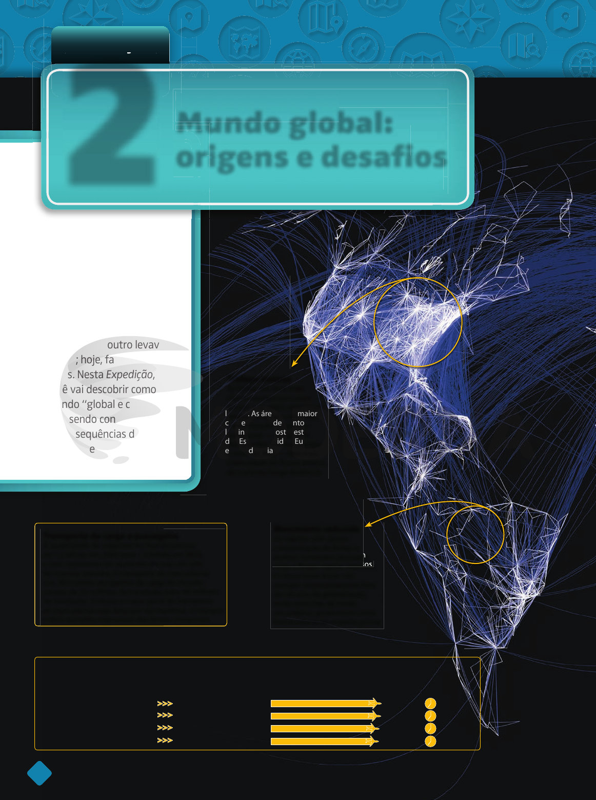 Tráfego intenso As linhas em tons mais claros representam voos curtos, e as azuis, rotas mais longas. As áreas com maior concentração de pontos luminosos — costa leste dos Estados Unidos, Europa e leste da Ásia — têm mais intensidade de fluxos aéreos, de curta ou longa distância. Movimento reduzido As regiões com pouca concentração de linhas e pontos luminosos possuem rotas e fluxos menos intensos. Embora essas áreas não estejam necessariamente fora do circuito da globalização, estão inseridas de modo secundário, geralmente como fornecedoras de matéria-prima. G RÁ FI C O S: P RI SC IL LA B O FF O Os voos mais longos do mundo Com o avanço tecnológico, os aviões adquiriram autonomia para voar rotas mais longas, sem pausas para manutenção ou abastecimento. Dubai (Emirados Árabes Unidos) Cidade do Panamá (Panamá) Dubai (Emirados Árabes Unidos) Sidnei (Austrália) Johanesburgo (África do Sul) Atlanta (Estados Unidos) Abu Dhabi (Emirados Árabes Unidos) Los Angeles (Estados Unidos) 13.821 km 17h35min 13.804 km 16h35min 13.582 km 16h55min 13.420 km 16h30min Transporte de carga e passageiro A quantidade de viajantes no mundo passou de 1,2 bilhão em 2005 para 1,9 bilhão em 2015, o que representa um aumento de mais de 50%. No mesmo período, o transporte de mercadorias nos 30 maiores aeroportos de carga do mundo passou de 33 milhões de toneladas para 44 milhões de toneladas. Embora a maior parte do transporte de mercadorias seja feita por via marítima, o número indica aumento expressivo das trocas comerciais. EXPEDIÇÃO Nesta Expedição, você aprenderá a ler e a interpretar mapas, condição importante para estudar Geografia, considerando que essa é a ciência que estuda o espaço terrestre em seus aspectos físicos e humanos ou sociais. Aprenderá também a trabalhar com dados numéricos utilizando gráficos. Orientação e localização no espaço geográfico A comunicação nunca foi tão fácil no mundo. Uma informação gerada em um ponto do planeta pode ser transmitida, em instantes, por texto, som ou imagem para qualquer lugar. No passado, deslocar-se de um país a outro levava meses; hoje, faz-se em horas. Nesta Expedição, você vai descobrir como esse mundo “global e conectado” vem sendo construído, as consequências desse processo e por que é tão importante compreendê-lo. Orientação Orientação espaço geográficoespaço geográficoespaço geográficoespaço geográficoespaço geográfico Orientação Orientação e localização no espaço geográfico e localização no e localização no e localização no espaço geográficoespaço geográfico e localização no e localização no espaço geográficoespaço geográfico Mundo global: origens e desafios pontos luminosos possuem rotas e fluxos menos intensos. EXPEDIÇÃO 2 4848 1. As aeronaves tornaram-se mais velozes e eficientes, aumentaram a capacidade de carga e ampliaram a autonomia para fazer longas viagens sem paradas para reabastecimento ou manutenção. 2. Não. As áreas mais claras da imagem indicam maior intensidade de fluxos aéreos, e as áreas mais escuras nos continentes mostram regiões menos integradas por conexões aéreas com outras regiões. PDF-048-079-EG8-U02-M.indd 48 01/06/16 00:33 Ocupação litorânea Na imagem, os contornos continentais não estão desenhados. No entanto, muitas linhas aéreas coincidem com os limites entre continentes e oceanos. Isso indica que, mesmo após séculos de interiorização da ocupação, as áreas mais densamente habitadas permanecem predominantemente próximas ao litoral. Fontes: ACI. Airport Statistics and Data Centre. Disponível em: ; OpenFlights. Disponível em: ; BBC BRASIL. As dez rotas de avião mais longas do mundo. Disponível em: . Acessos em: 9 maio 2016. Verifique sua bagagem 1. Como os avanços tecnológicos contribuíram para o aumento dos fluxos de transporte aéreo nas últimas décadas? 2. Os países e as regiões do mundo estão integrados igualmente pelas rotas de transporte aéreo? Explique com base na imagem. Um dos efeitos mais notáveis da globalização é a intensificação dos fluxos aéreos. A imagem a seguir é resultado de um levantamento de dados de mais de 58 mil rotas comerciais de tráfego aéreo no planeta, em 2013, e revela informações sobre a aviação civil no mundo. Um dos efeitos mais notáveis da globalização é a intensificação dos Fluxos de transporte aéreo desenhados. No entanto, muitas linhas aéreas coincidem com interiorização da ocupação, as áreas mais densamente habitadas permanecem predominantemente IM A G EM : M IC H A EL M A RK IE TA / C O N TR IB U TO R/ G ET TY IM A G ES 4949 Origens e bases do mundo global A economia global Globalização e meio ambiente Crises e desigualdades no mundo global 5 5 6 7 8 PERCURSOS PDF-048-079-EG8-U02-M.indd 49 01/06/16 00:33 PERCURSO 5 Origens e bases do mundo global Figura 1. Com o avanço das tecnologias de comunicação, pessoas de diferentes culturas e países distantes podem compartilhar informações e hábitos de consumo instantaneamente. Nas fotos, jovens nos Estados Unidos (foto A) e na China (foto B) usam fantasias inspiradas nos personagens do filme estadunidense Avatar (2010). BI LL O ’L EA RY /T H E W A SH IN G TO N P O ST /G ET TY IM A G ES M IK E CL A RK E/ A FP B A Nunca estivemos tão próximos Há um século, meios de comunicação como o rádio e o telefone ti- nham acabado de ser inventados e um número reduzido de pessoas podia obtê-los. Além disso, o acesso à informação era mais restrito. Hoje, o acesso aos meios de comunicação se ampliou e é possível obter, em “tempo real” — por meio dos noticiários televisivos, da internet e da telefonia móvel —, informações sobre fatos, pessoas e paisagens de diferentes pontos do planeta. Com isso, hábitos de consumo, como a preferência por determinadas formas de se vestir, filmes e músicas, podem ser compartilhados diariamente, a todo instant