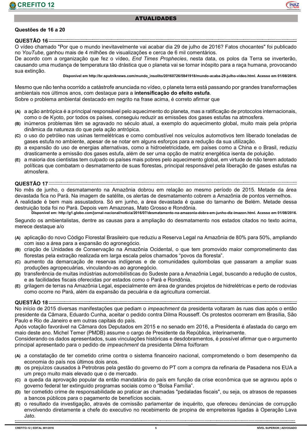 pcimarkpci MDAwMDowMDAwOjAwMDA6MDAwMDowMDAwOmZmZmY6ZDhlZTo2NTFl:U2F0LCAxNSBGZWIgMjAyNSAyMTowODozMiAtMDMwMA== www.pciconcursos.com.br CREFITO-12 | EDITAL 001/2016 5 NÍVEL SUPERIOR | ADVOGADO ATUALIDADES Questões de 16 a 20 QUESTÃO 16 O vídeo chamado "Por que o mundo inevitavelmente vai acabar dia 29 de julho de 2016? Fatos chocantes" foi publicado no YouTube, ganhou mais de 4 milhões de visualizações e cerca de 6 mil comentários. De acordo com a organização que fez o vídeo, End Times Prophecies, nesta data, os polos da Terra se inverterão, causando uma mudança de temperatura tão drástica que o planeta vai se tornar inóspito para a raça humana, provocando sua extinção. Disponível em http://br.sputniknews.com/mundo_insolito/20160726/5841918/mundo-acaba-29-julho-video.html. Acesso em 01/08/2016. Mesmo que não tenha ocorrido a catástrofe anunciada no vídeo, o planeta terra está passando por grandes transformações ambientais nos últimos anos, com destaque para a intensificação do efeito estufa. Sobre o problema ambiental destacado em negrito na frase acima, é correto afirmar que (A) a ação antrópica é a principal responsável pelo aquecimento do planeta, mas a ratificação de protocolos internacionais, como o de Kyoto, por todos os países, conseguiu reduzir as emissões dos gases estufas na atmosfera. (B) inúmeros problemas têm se agravado no século atual, a exemplo do aquecimento global, muito mais pela própria dinâmica da natureza do que pela ação antrópica. (C) o uso do petróleo nas usinas termelétricas e como combustível nos veículos automotivos tem liberado toneladas de gases estufa no ambiente, apesar de se notar em alguns esforços para a redução da sua utilização. (D) a expansão do uso de energias alternativas, como a hidroeletricidade, em países como a China e o Brasil, reduziu drasticamente a emissão dos gases estufa, além de ser uma opção de matriz energética isenta de poluição. (E) a maioria dos cientistas tem culpado os países mais pobres pelo aquecimento global, em virtude de não terem adotado políticas que combatam o desmatamento de suas florestas, principal responsável pela liberação de gases estufas na atmosfera. QUESTÃO 17 No mês de junho, o desmatamento na Amazônia dobrou em relação ao mesmo período de 2015. Metade da área devastada fica no Pará. Na imagem de satélite, os alertas de desmatamento cobrem a Amazônia de pontos vermelhos. A realidade é bem mais assustadora. Só em junho, a área devastada é quase do tamanho de Belém. Metade dessa destruição toda foi no Pará. Depois vem Amazonas, Mato Grosso e Rondônia. Disponível em: http://g1.globo.com/jornal-nacional/noticia/2016/07/desmatamento-na-amazonia-dobra-em-junho-diz-imazon.html. Acesso em 01/08/2016. Segundo os ambientalistas, dentre as causas para a ampliação do desmatamento nos estados citados no texto acima, merece destaque a/o (A) aplicação do novo Código Florestal Brasileiro que reduziu a Reserva Legal na Amazônia de 80% para 50%, ampliando com isso a área para a expansão do agronegócio. (B) criação de Unidades de Conservação na Amazônia Ocidental, o que tem promovido maior comprometimento das florestas pela extração realizada em larga escala pelos chamados “povos da floresta”. (C) aumento da demarcação de reservas indígenas e de comunidades quilombolas que passaram a ampliar suas produções agropecuárias, vinculando-as ao agronegócio. (D) transferência de muitas indústrias automobilísticas do Sudeste para a Amazônia Legal, buscando a redução de custos, e as facilidades fiscais oferecidas por estados como o Pará e Rondônia. (E) grilagem de terras na Amazônia Legal, especialmente em área de grandes projetos de hidrelétricas e perto de rodovias como ocorre no Pará, além da expansão da pecuária e da agricultura comercial. QUESTÃO 18 No início de 2015 diversas manifestações que pediam o impeachment da presidenta voltaram às ruas dias após o então presidente da Câmara, Eduardo Cunha, aceitar o pedido contra Dilma Rousseff. Os protestos ocorreram em Brasília, São Paulo e Rio de Janeiro e em outras capitais do país. Após votação favorável na Câmara dos Deputados em 2015 e no senado em 2016, a Presidenta é afastada do cargo em maio deste ano. Michel Temer (PMDB) assume o cargo de Presidente da República, interinamente. Considerando os dados apresentados, suas vinculações históricas e desdobramentos, é possível afirmar que o argumento principal apresentado para o pedido de impeachment da presidenta Dilma foi/foram (A) a constatação de ter cometido crime contra o sistema financeiro nacional, comprometendo o bom desempenho da economia do país nos últimos dois anos. (B) os prejuízos causados à Petrobras pela gestão do governo do PT com a compra da refinaria de Pasadena nos EUA a um preço muito mais elevado que o de mercado. (C) a queda da aprovação popular da então mandatária do país em função da crise econômica que se agravou após o governo federal ter extinguido programas sociais como o “Bolsa Família”. (D) ter cometido crime de responsabilidade ao praticar as chamadas "pedaladas fiscais", ou seja, os atrasos de repasses a bancos públicos para o pagamento de benefícios sociais. (E) o resultado da investigação, através de comissão parlamentar de inquérito, que ofereceu denúncias de corrupção envolvendo diretamente a chefe do executivo no recebimento de propina de empreiteiras ligadas à Operação Lava Jato. pcimarkpci MDAwMDowMDAwOjAwMDA6MDAwMDowMDAwOmZmZmY6ZDhlZTo2NTFl:U2F0LCAxNSBGZWIgMjAyNSAyMTowODozMiAtMDMwMA== www.pciconcursos.com.br CREFITO-12 | EDITAL 001/2016 6 NÍVEL SUPERIOR | ADVOGADO QUESTÃO 19 Ao levarmos em conta os aspectos políticos, econômicos e sociais, o ano de 2016 tem apresentado um quadro de grandes transformações desde seu início. Nesse cenário é correto afirmar que o/a (A) eleição presidencial nos Estados Unidos 