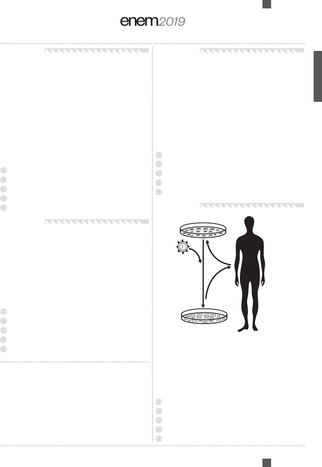 CN - 2º dia | Caderno 5 - AMARELO - Página 15 Questão 127 Em uma atividade prática, um professor propôs o seguinte experimento: Materiais: copo plástico pequeno, leite e suco de limão. Procedimento: coloque leite até a metade do copo plástico e, em seguida, adicione lentamente 20 gotas de limão. Levando-se em consideração a faixa de pH do suco de limão, a composição biomolecular do leite e os resultados que os alunos observariam na realização do experimento, qual processo digestório estaria sendo simulado? A Ação da bile sobre as gorduras no duodeno. B Ação do suco pancreático sobre as gorduras. C Ação da saliva sobre os carboidratos na boca. D Ação do suco entérico sobre as proteínas no íleo. E Ação do suco gástrico sobre as proteínas no estômago. Questão 128 O processo de calagem consiste na diminuição da acidez do solo usando compostos inorgânicos, sendo o mais usado o calcário dolomítico, que é constituído de carbonato de cálcio (CaCO3) e carbonato de magnésio (MgCO3). Além de aumentarem o ph do solo, esses compostos são fontes de cálcio e magnésio, nutrientes importantes para os vegetais. Os compostos contidos no calcário dolomítico elevam o ph do solo, pois A são óxidos inorgânicos. B são fontes de oxigênio. C o ânion reage com a água. D são substâncias anfóteras. E os cátions reagem com a água. Questão 129 O mangue é composto por três tipos de árvores (Rhizophora mangle — mangue-bravo ou vermelho, Avicennia schaueriana — mangue-seriba, e Laguncularia racemosa — mangue-branco). Uma característica morfológica comum aos três tipos de árvores encontradas no mangue está relacionada à pouca disponibilidade de oxigênio encontrado em seu solo. AlVES, J. R. P. (Org.). Manguezais: educar para proteger. Rio de Janeiro: Femar; Semads, 2001 (adaptado). A característica morfológica de valor adaptativo referenciada no texto é a A ausência de frutos. B ausência de estômatos. C presença de folhas largas. D presença de raízes-escoras. E presença de pneumatóforos. Questão 130 Disponível em: www.repositorio.uniceub.br. Acesso em: 3 maio 2019 (adaptado). A sequência de etapas indicadas na figura representa o processo conhecido como A mutação. B clonagem. C crossing-over. D terapia gênica. E transformação genética. 1. Coleta e cultivo in vitro das células do paciente; 2. Transdução com vetor carregando o gene terapêutico; 3. Seleção e expansão das células com gene terapêutico; 4. Reintrodução das células modificadas no paciente. 12 3 4 *DO0525AM15* CN - 2º dia | Caderno 5 - AMARELO - Página 16 Questão 131 Nos municípios onde foi detectada a resistência do Aedes aegypti, o larvicida tradicional será substituído por outro com concentração de 10% (v/v) de um novo princípio ativo. A vantagem desse segundo larvicida é que uma pequena quantidade da emulsão apresenta alta capacidade de atuação, o que permitirá a condução de baixo volume de larvicida pelo agente de combate às endemias. Para evitar erros de manipulação, esse novo larvicida será fornecido em frascos plásticos e, para uso em campo, todo o seu conteúdo deve ser diluído em água até o volume final de um litro. O objetivo é obter uma concentração final de 2% em volume do princípio ativo. Que volume de larvicida deve conter o frasco plástico? A 10 ml B 50 mL C 100 ml D 200 ml E 500 mL Questão 132 Um professor percebeu que seu apontador a laser, de luz monocromática, estava com o brilho pouco intenso. Ele trocou as baterias do apontador e notou que a intensidade luminosa aumentou sem que a cor do laser se alterasse. Sabe-se que a luz é uma onda eletromagnética e apresenta propriedades como amplitude, comprimento de onda, fase, frequência e velocidade. Dentre as propriedades de ondas citadas, aquela associada ao aumento do brilho do laser é o(a) A amplitude. B frequência. C fase da onda. D velocidade da onda. E comprimento de onda. Questão 133 Antigamente, em lugares com invernos rigorosos, as pessoas acendiam fogueiras dentro de uma sala fechada para se aquecerem do frio. O risco no uso desse recurso ocorria quando as pessoas adormeciam antes de apagarem totalmente a fogueira, o que poderia levá-las a óbito, mesmo sem a ocorrência de incêndio. A causa principal desse risco era o(a) A produção de fuligem pela fogueira. B liberação de calor intenso pela fogueira. C consumo de todo o oxigênio pelas pessoas. D geração de queimaduras pela emissão de faíscas da lenha. E geração de monóxido de carbono pela combustão incompleta da lenha. Questão 134 Um herbicida de largo espectro foi desenvolvido para utilização em lavouras. Esse herbicida atua inibindo a atividade de uma enzima dos vegetais envolvida na biossíntese de aminoácidos essenciais. Atualmente ele é bastante utilizado em plantações de soja, podendo inclusive inibir a germinação ou o crescimento das plantas cultivadas. De que forma é desenvolvida a resistência da soja ao herbicida? A Expondo frequentemente uma espécie de soja a altas concentrações do herbicida, levando ao desenvolvimento de resistência. B Cultivando a soja com elevadas concentrações de aminoácidos, induzindo a formação de moléculas relacionadas à resistência. C Empregando raios X para estimular mutações em uma variedade de soja, produzindo a enzima-alvo resistente ao herbicida. D Introduzindo na soja um gene específico de outra espécie, possibilitando a produção da enzima de resistência ao herbicida. E Administrando a enzima-alvo nos fertilizantes utilizados na lavoura, promovendo sua absorção pela espécie cultivada. Questão 135 As fêmeas do mosquito da dengue, Aedes aegypti, têm um olfato extremamente refinado. Além de identificar as coleções de águas para oviposição, elas são capazes de detectar de forma precisa e eficaz a presença humana pela interpretação de moléculas de odor eliminadas durante a sudorese. Após perceb